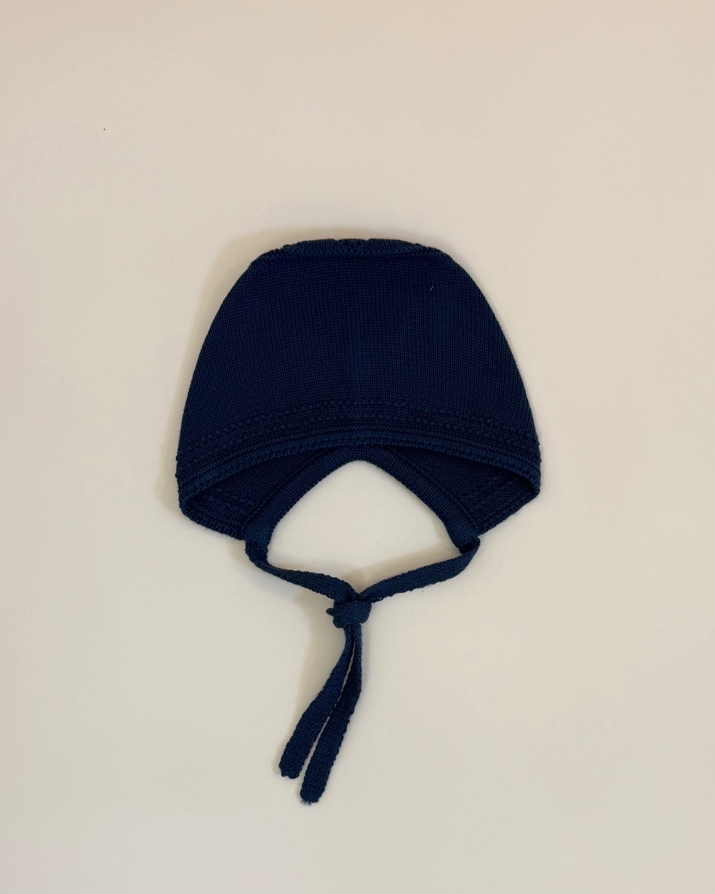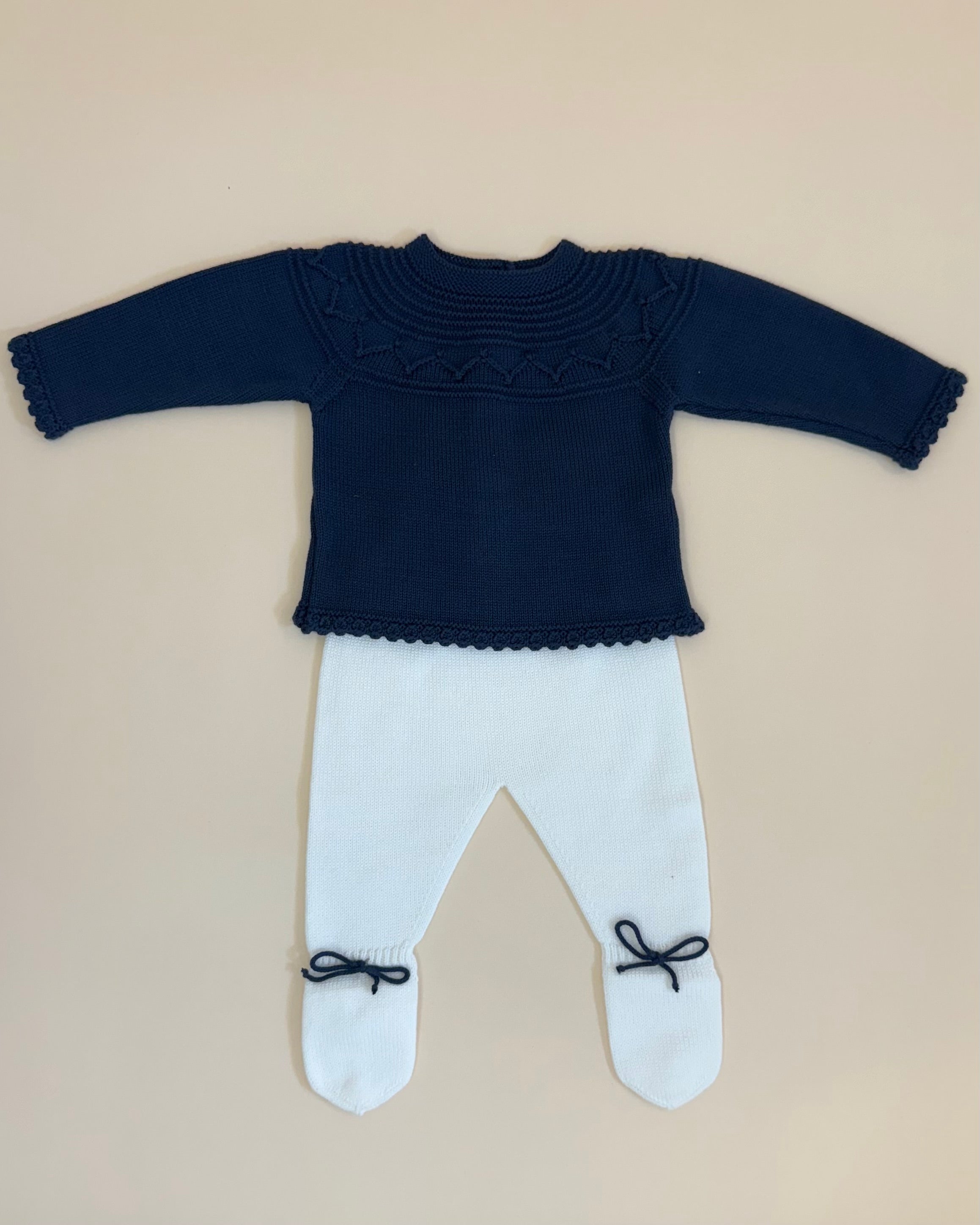Handcrafted in Spain with exceptional attention to quality, the set includes a navy blue knitted top with back button closure, white footed pants, and a coordinated navy blue bonnet—a perfectly balanced ensemble for welcoming your little one in style.