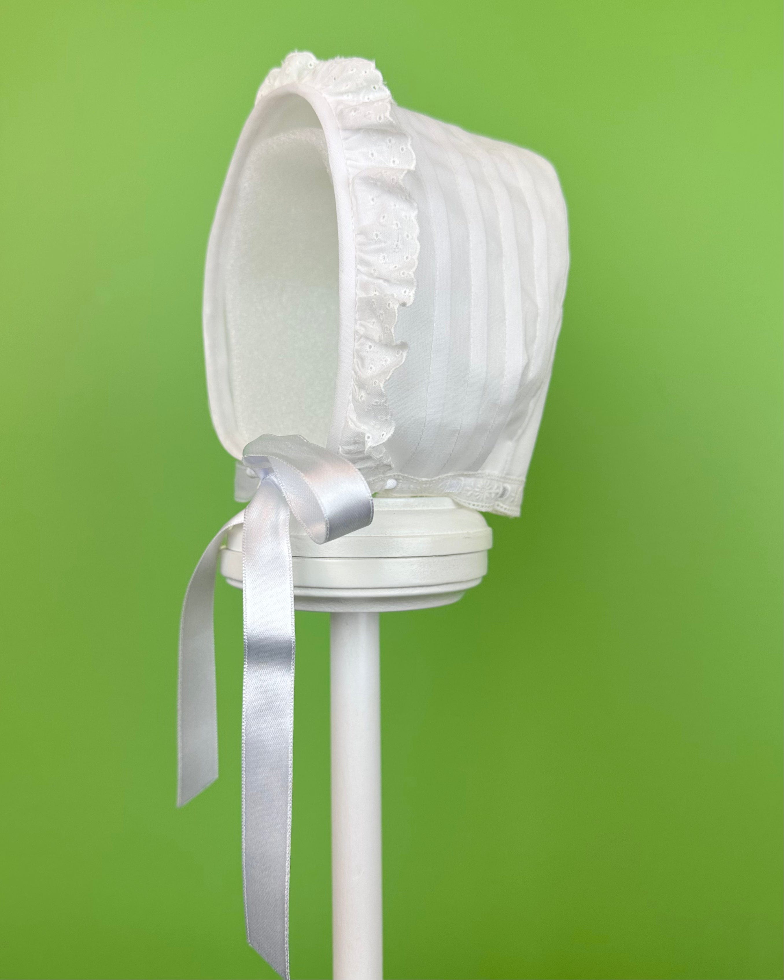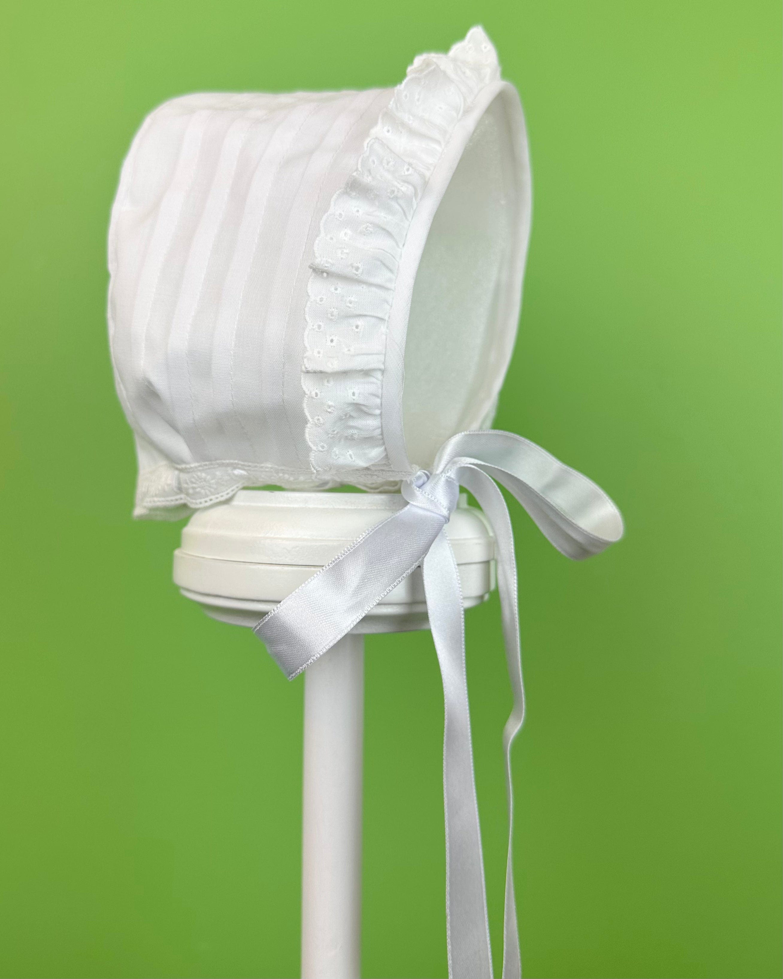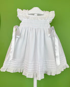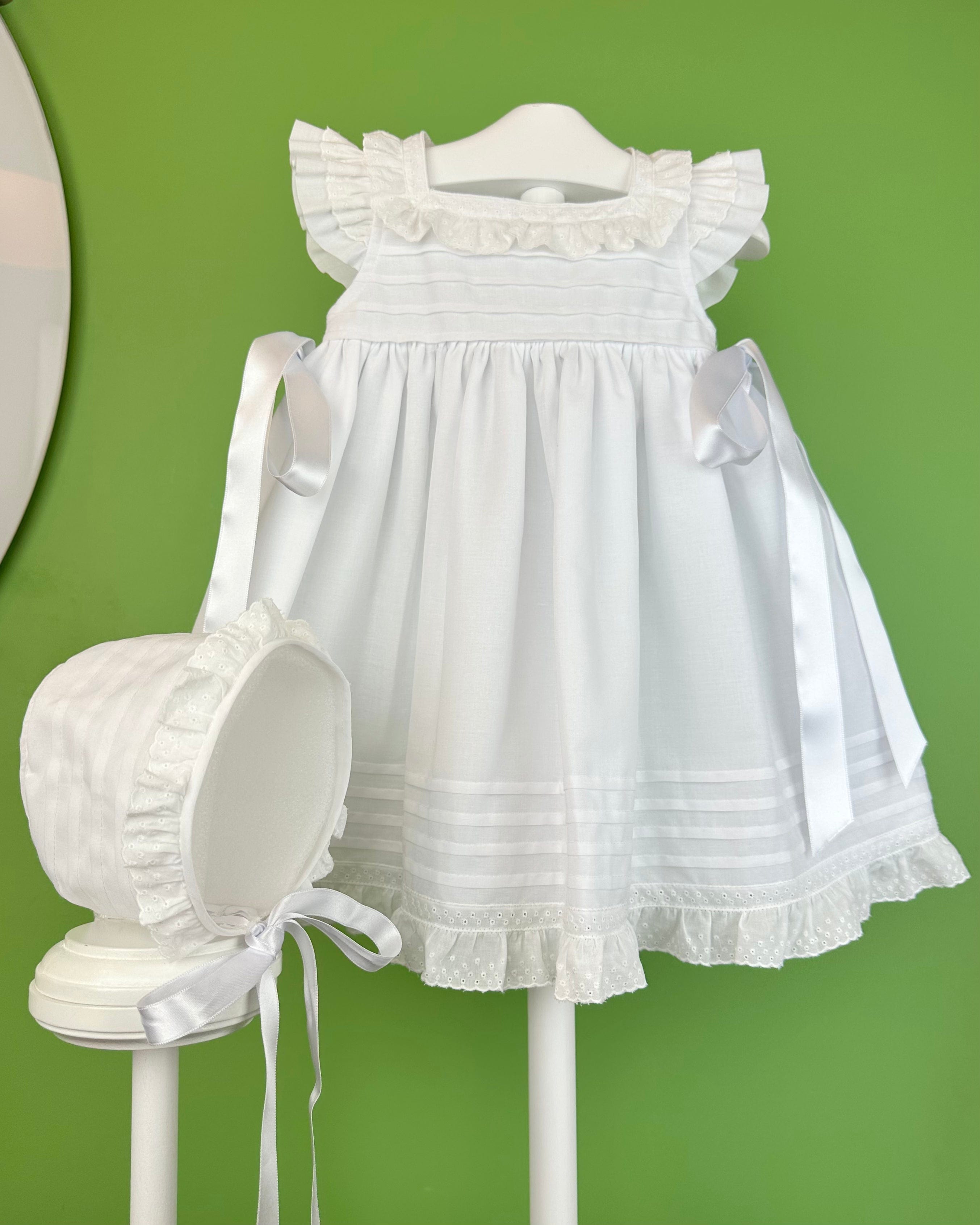 The Susy dress is a simple yet refined choice for baby girls, perfect for modern celebrations. Made from soft optic white batiste, it features a clean, elegant silhouette with a classic back button closure. A matching bonnet completes the look, making it ideal for christenings, birthdays, and other special occasions.
