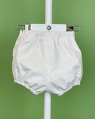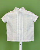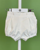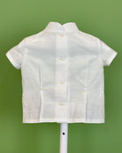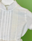 The Pablo outfit is a sophisticated two-piece set for baby boys, perfect for christenings, weddings, and other special celebrations. The top is crafted from off-white linen and features a refined Mao (Chinese) collar, short sleeves, handmade pleats, and two elegant crochet lace accents down the front. It closes at the back with buttons for a polished look. The matching bubble shorts include a pleated sash, side button closures, and a comfortable elastic waistband in the back. Fully lined in soft cotton, Pablo offers a blend of tradition, comfort, and timeless style.