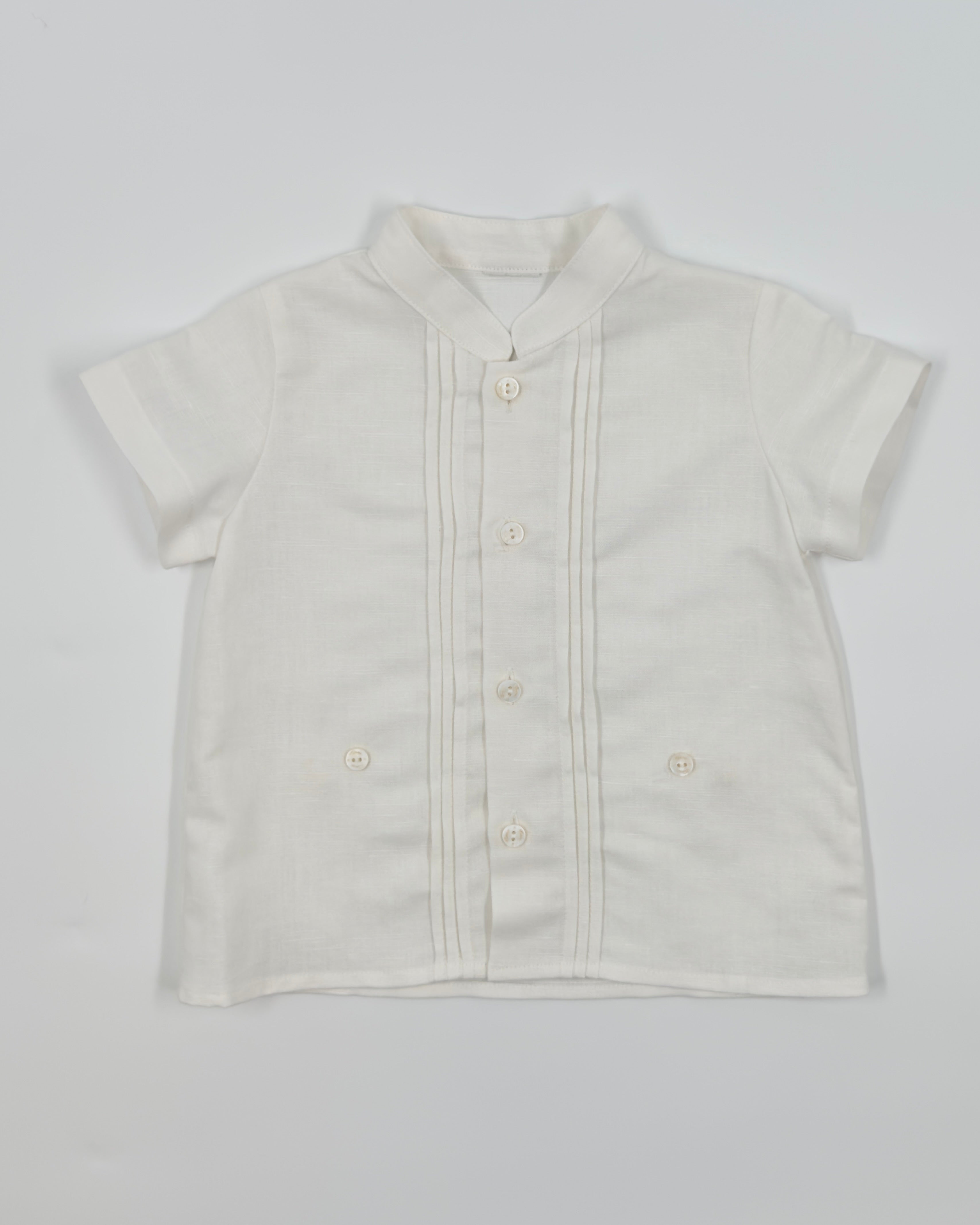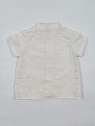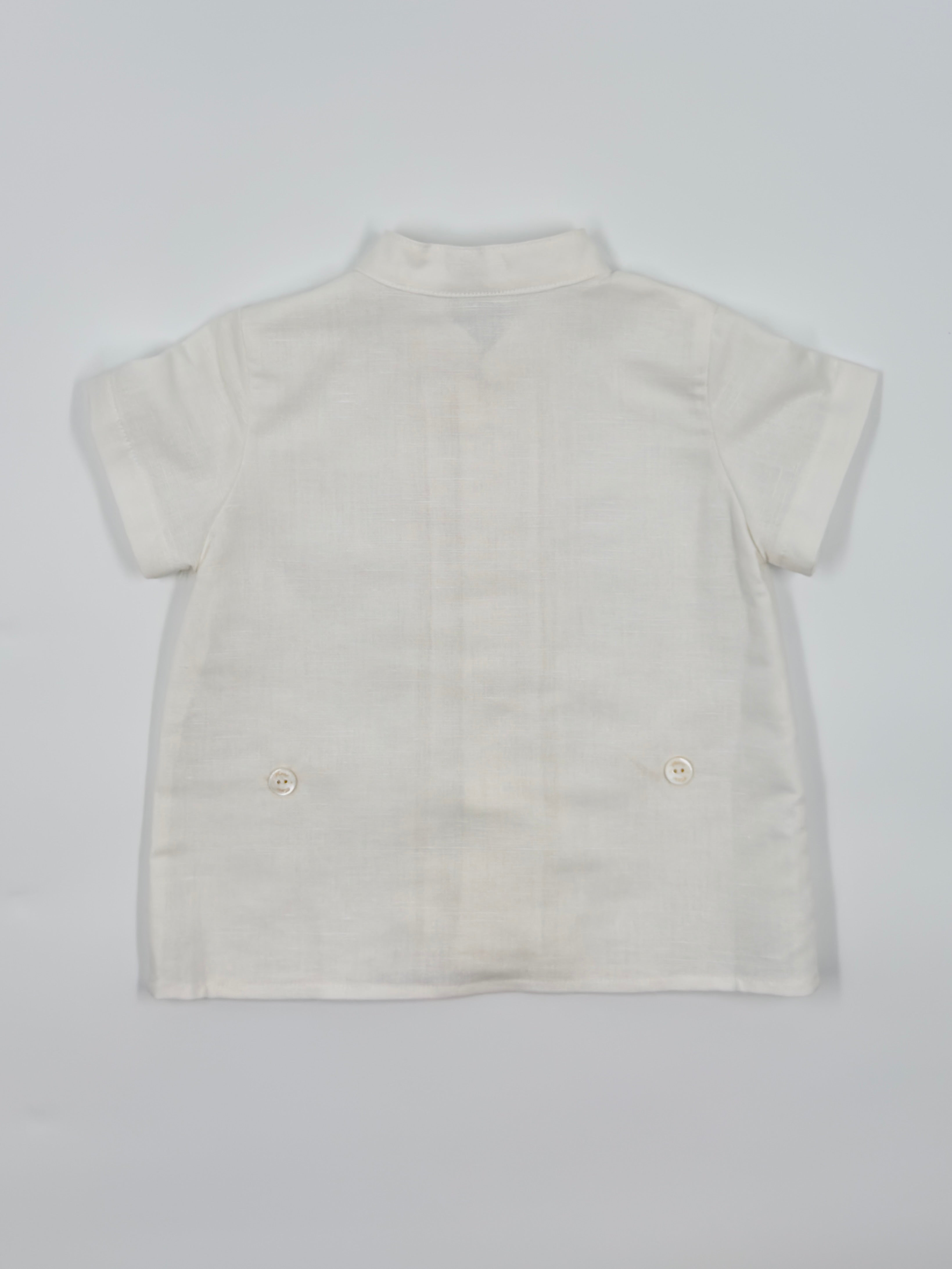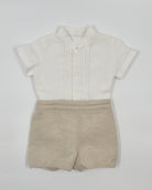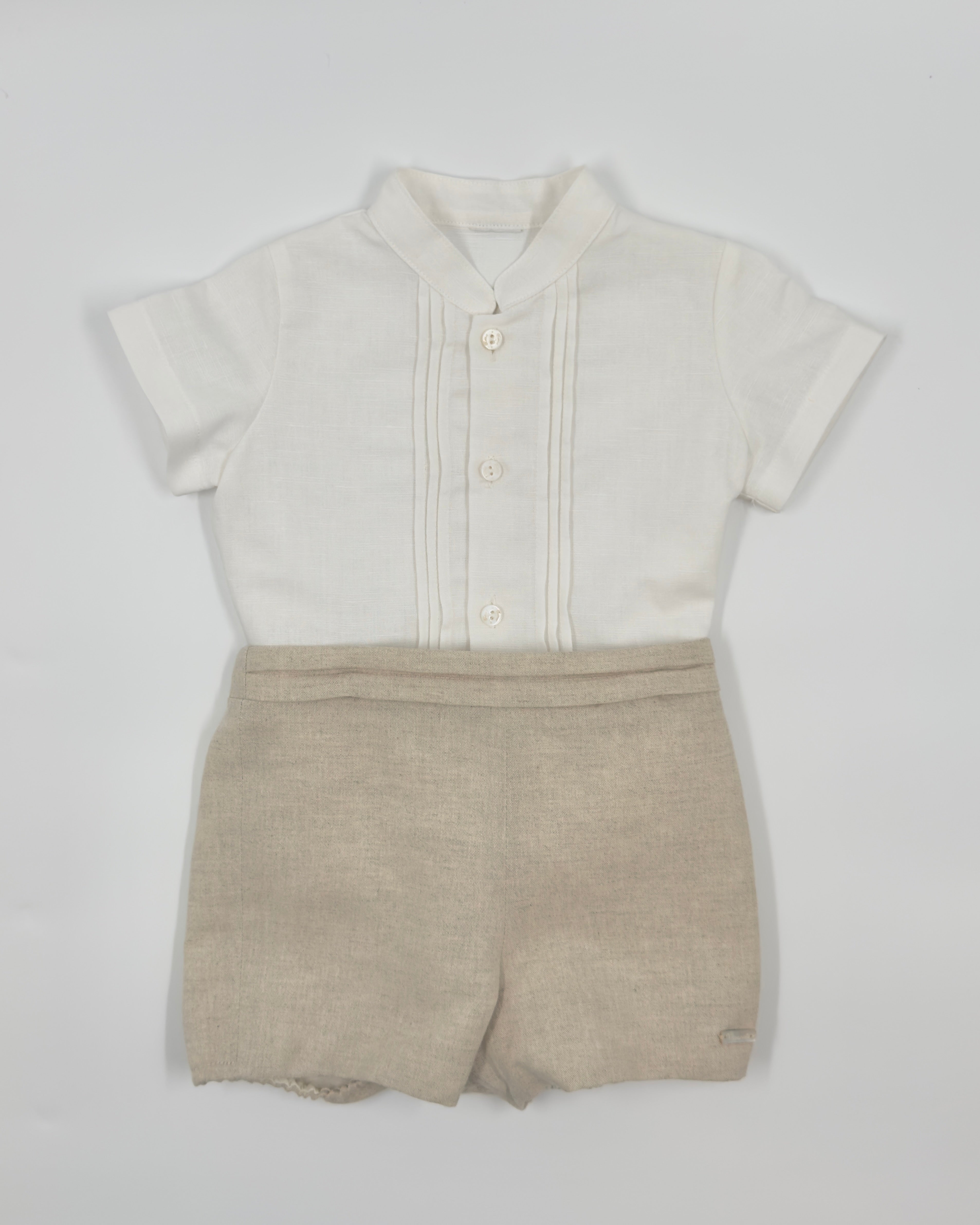 The Gregory outfit is a stylish and modern two-piece set for baby boys, perfect for special occasions like weddings, baptisms, and celebrations. The off-white shirt features a clean Mao collar and front button closure, offering a fresh, sophisticated look. It's paired with semi-bubble shorts in a classic sand color, designed with comfort and elegance in mind. Effortlessly refined, Gregory is a perfect choice for dressing your little one with timeless charm.