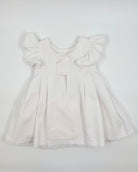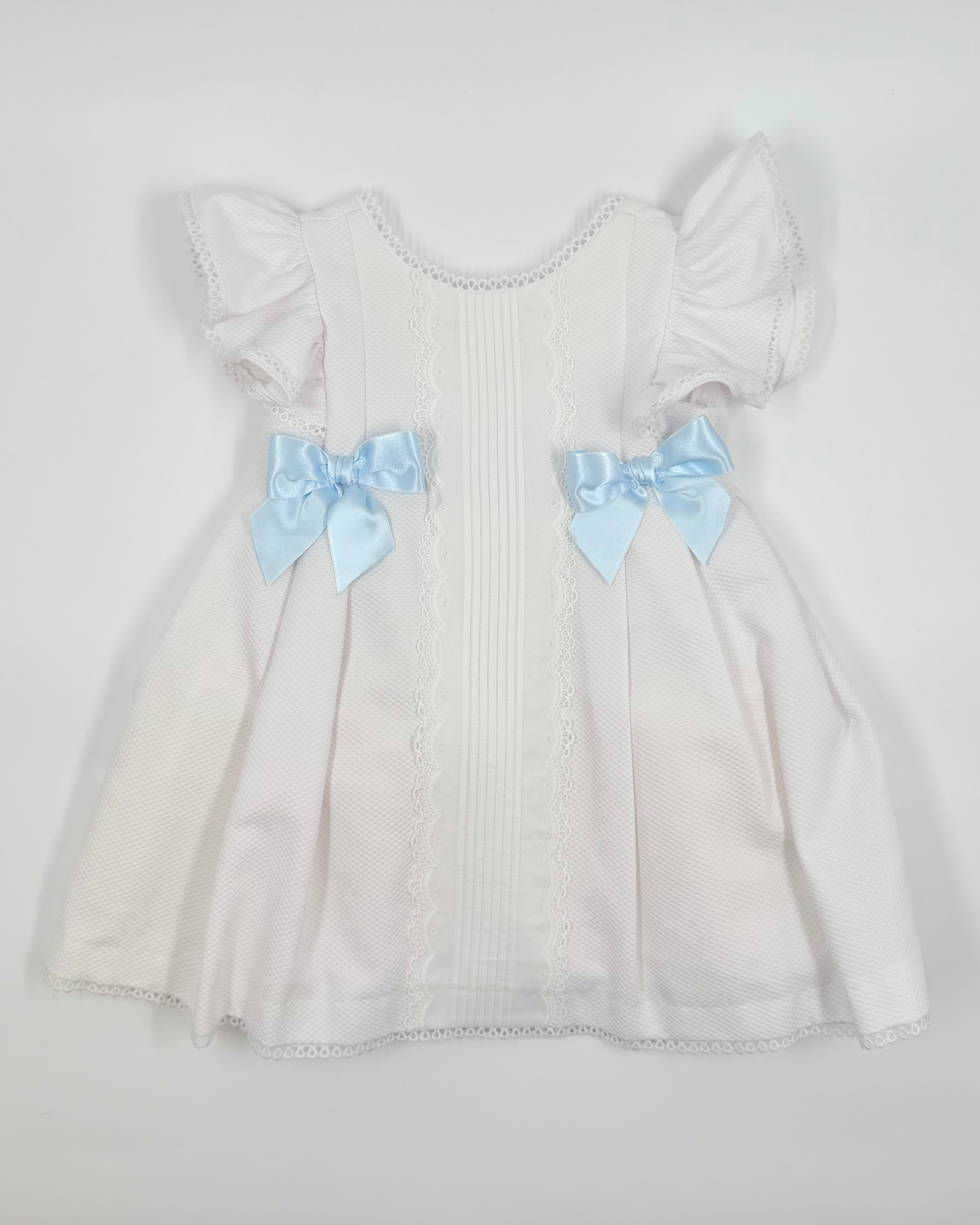 The Luna dress is a charming and stylish choice for toddler girls, perfect for birthdays, parties, and special occasions. Made from crisp optic white piqué fabric, it features a classic A-line silhouette with a vertical lace panel running down the front. Two blue satin ribbon bows add a delightful pop of color and a playful, elegant finish.
