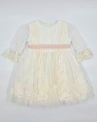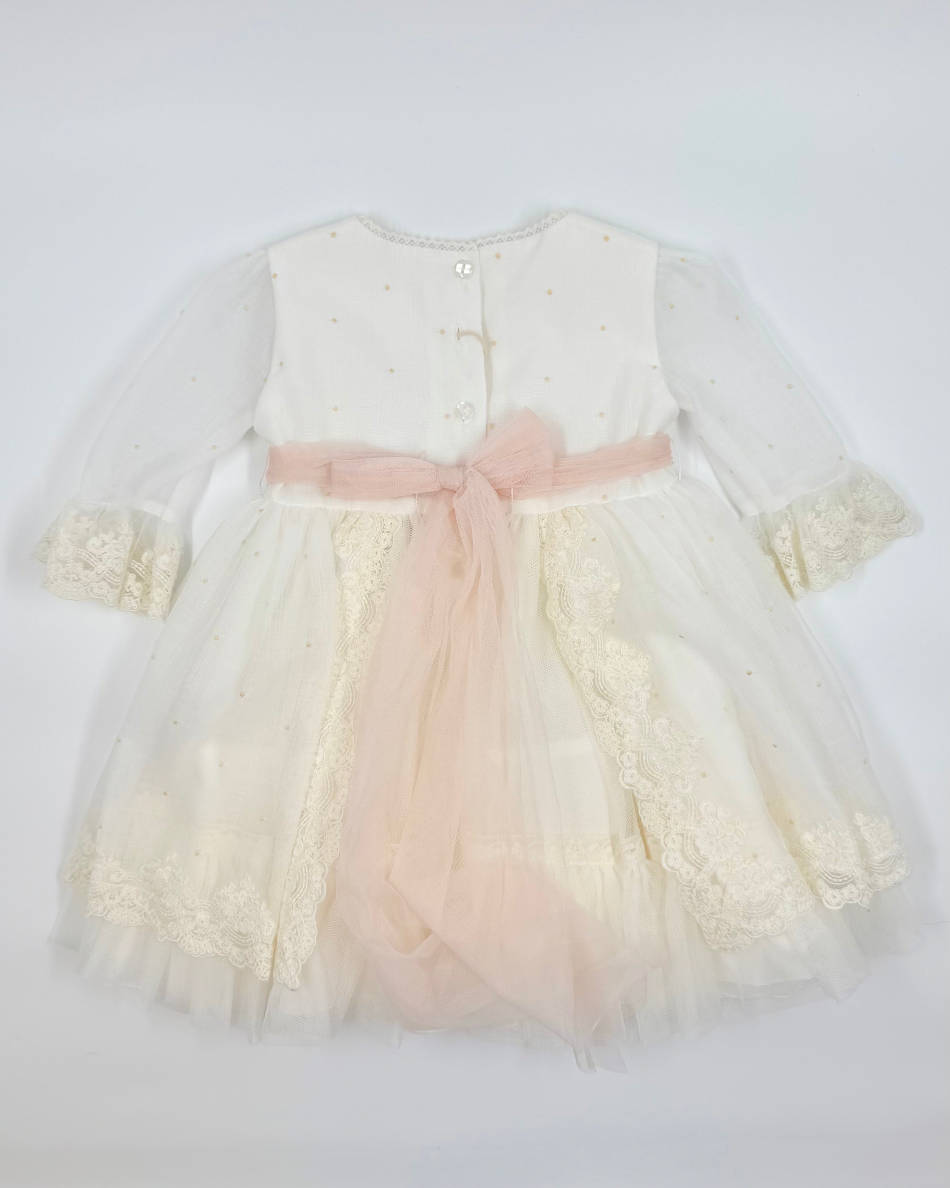 The Perla dress is a beautifully delicate piece for toddler girls, perfect for weddings, birthdays, and other special occasions. Made from natural white English muslin, it features intricate lace details and a soft peachy tulle sash that adds a touch of charm and color. Light, elegant, and timeless, Perla is designed for unforgettable moments.
