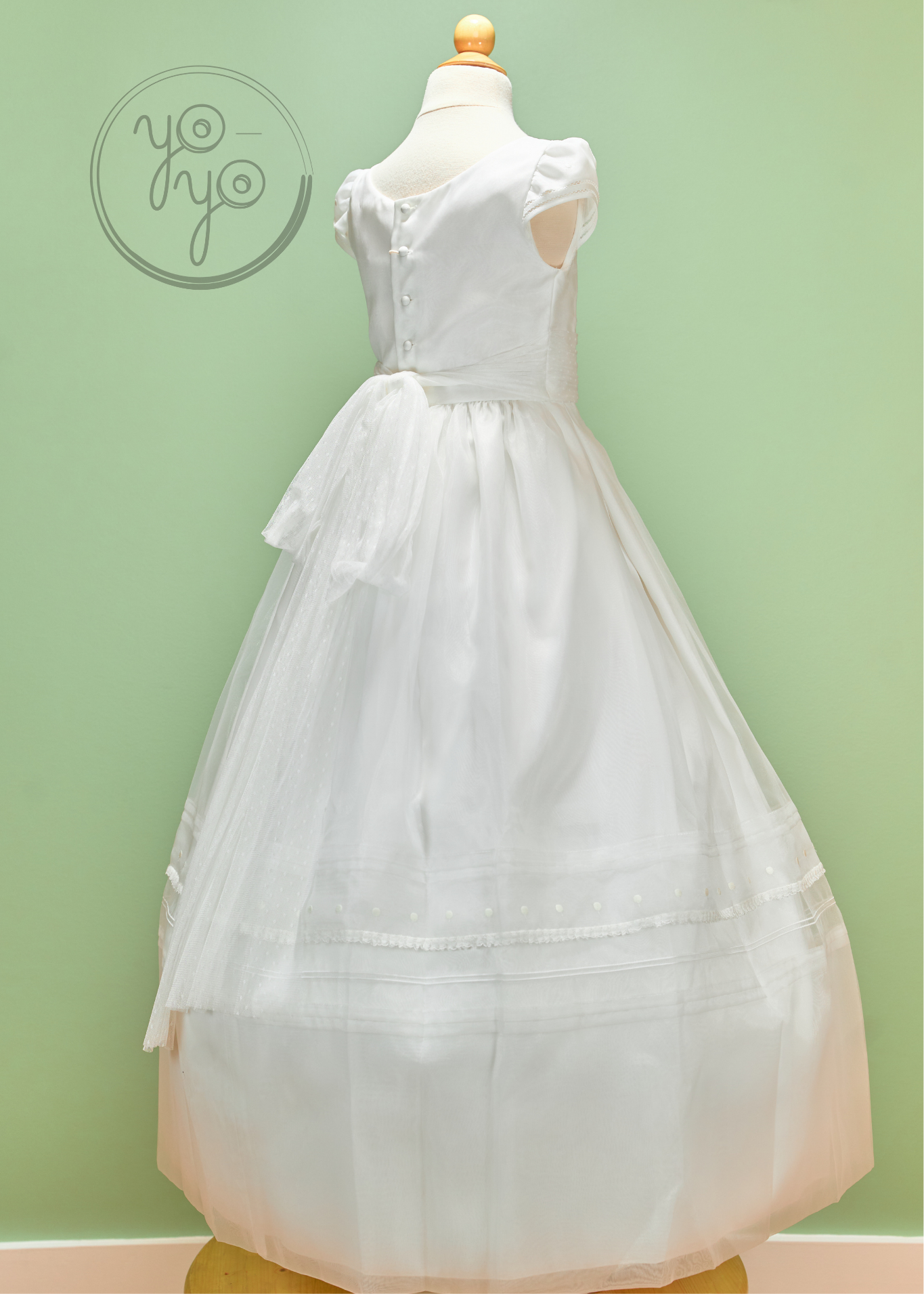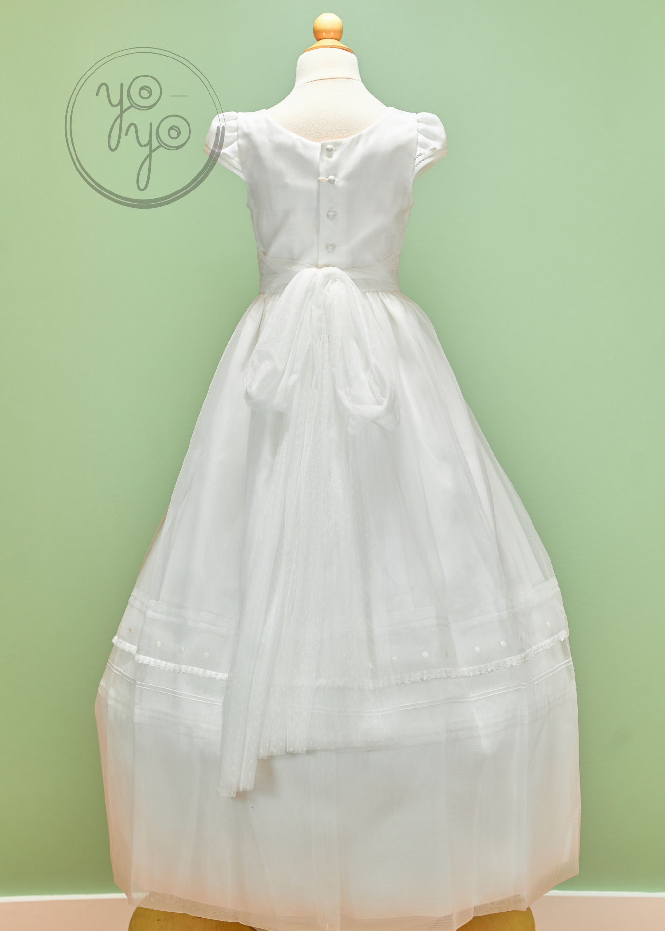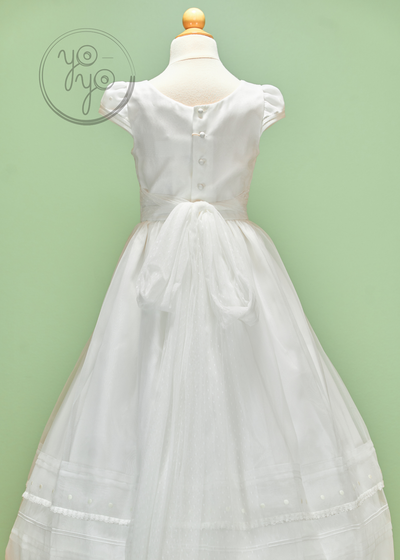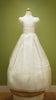 The dress features cap sleeves finished with Punto Paris edging, along with a round neckline and delicate details across the bodice. At the waist, a French tulle sash ties into a soft draped bow on the back, adding grace and movement to the gown.