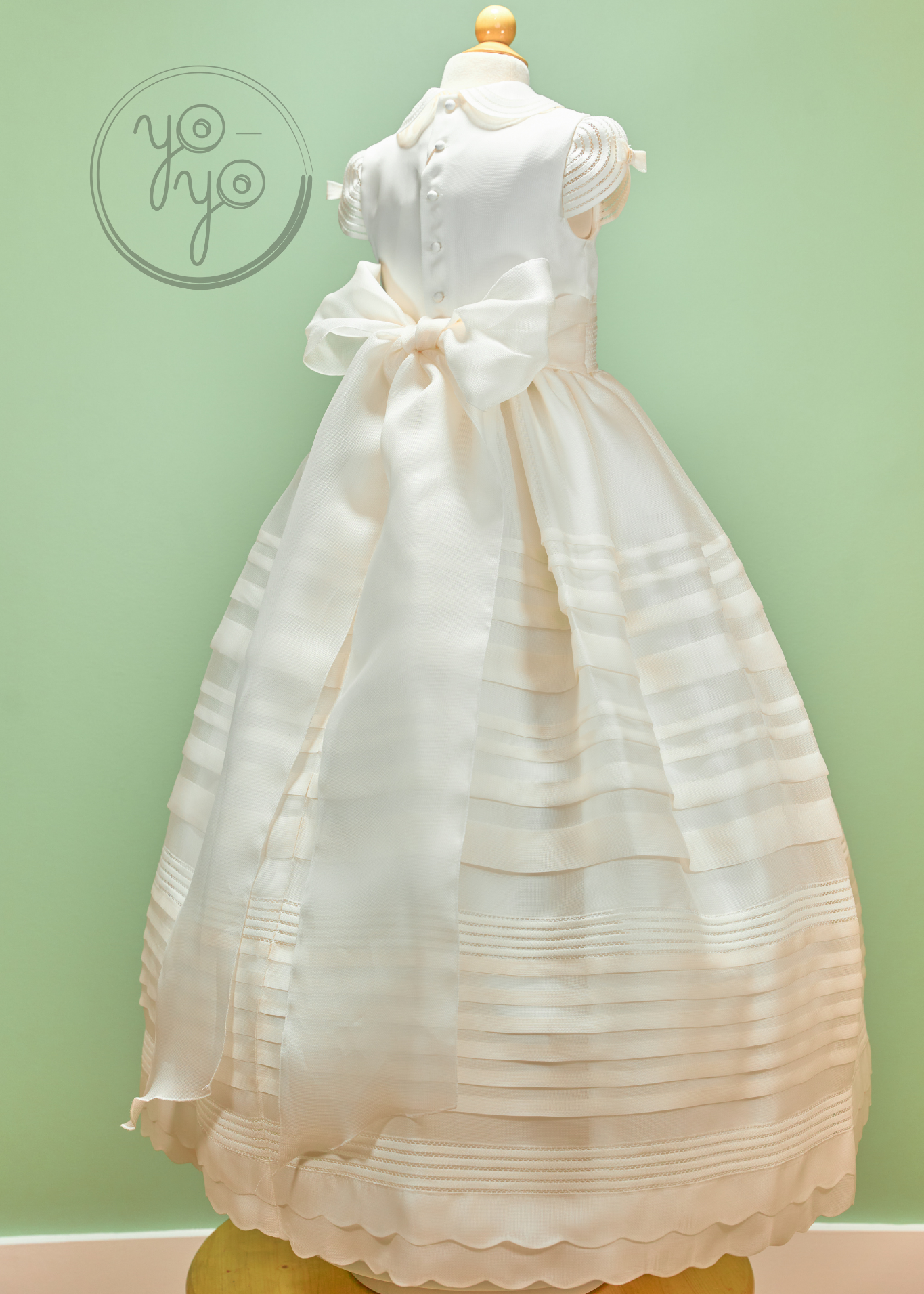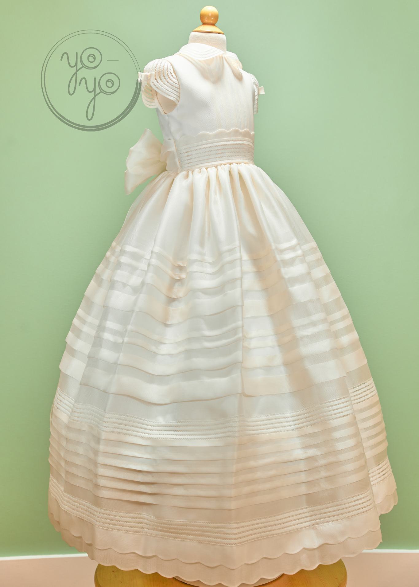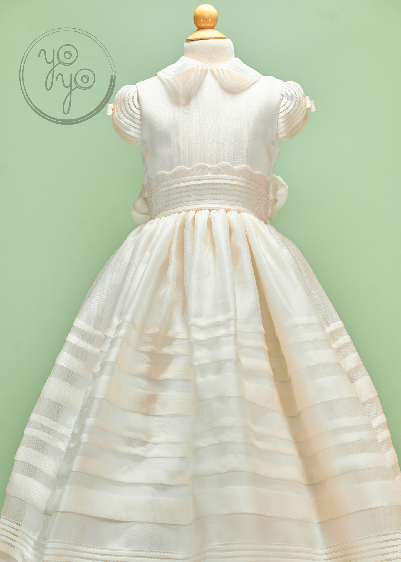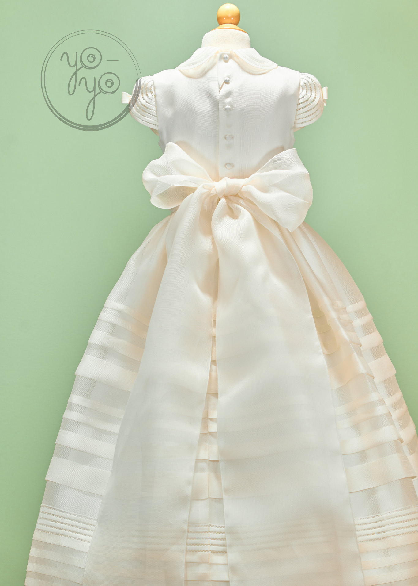 At the back, covered buttons provide a traditional closure, while luxurious Mikado silk ties form a full, elegant bow. Tulipán is a stunning gown for families who value true craftsmanship and elegance in a First Communion dress.