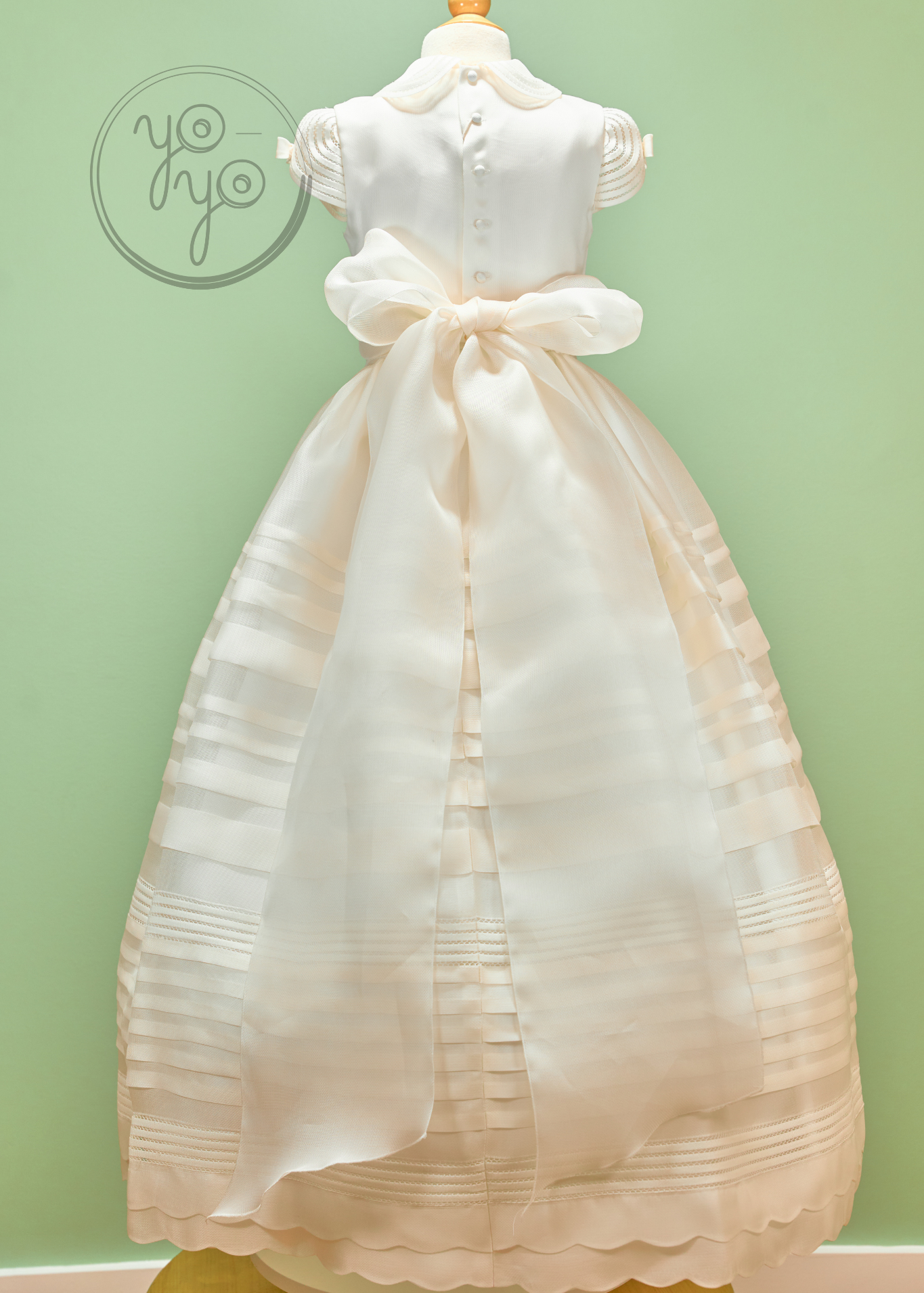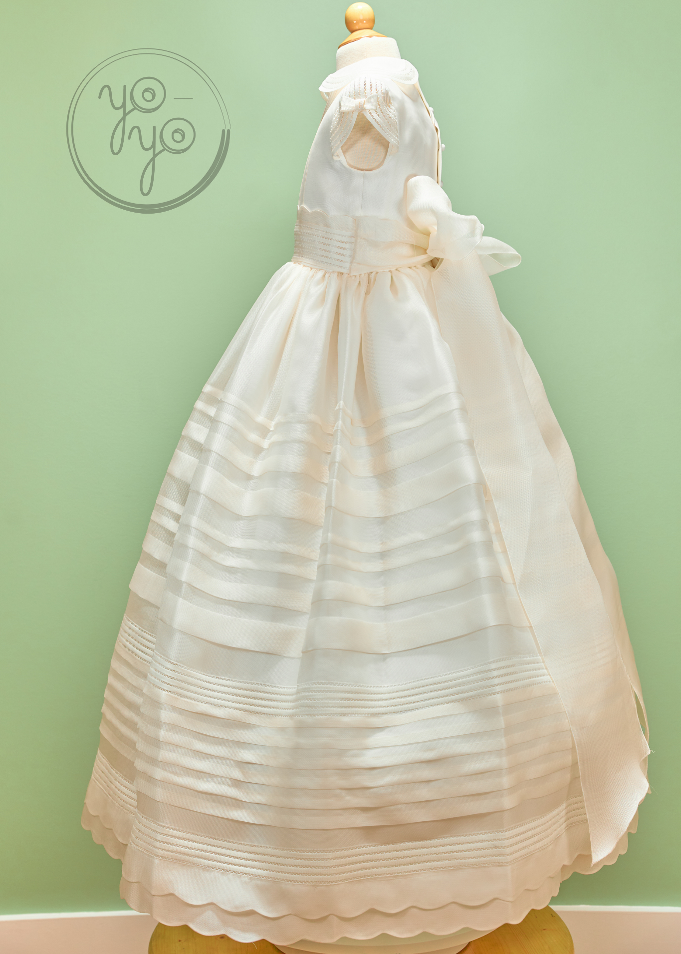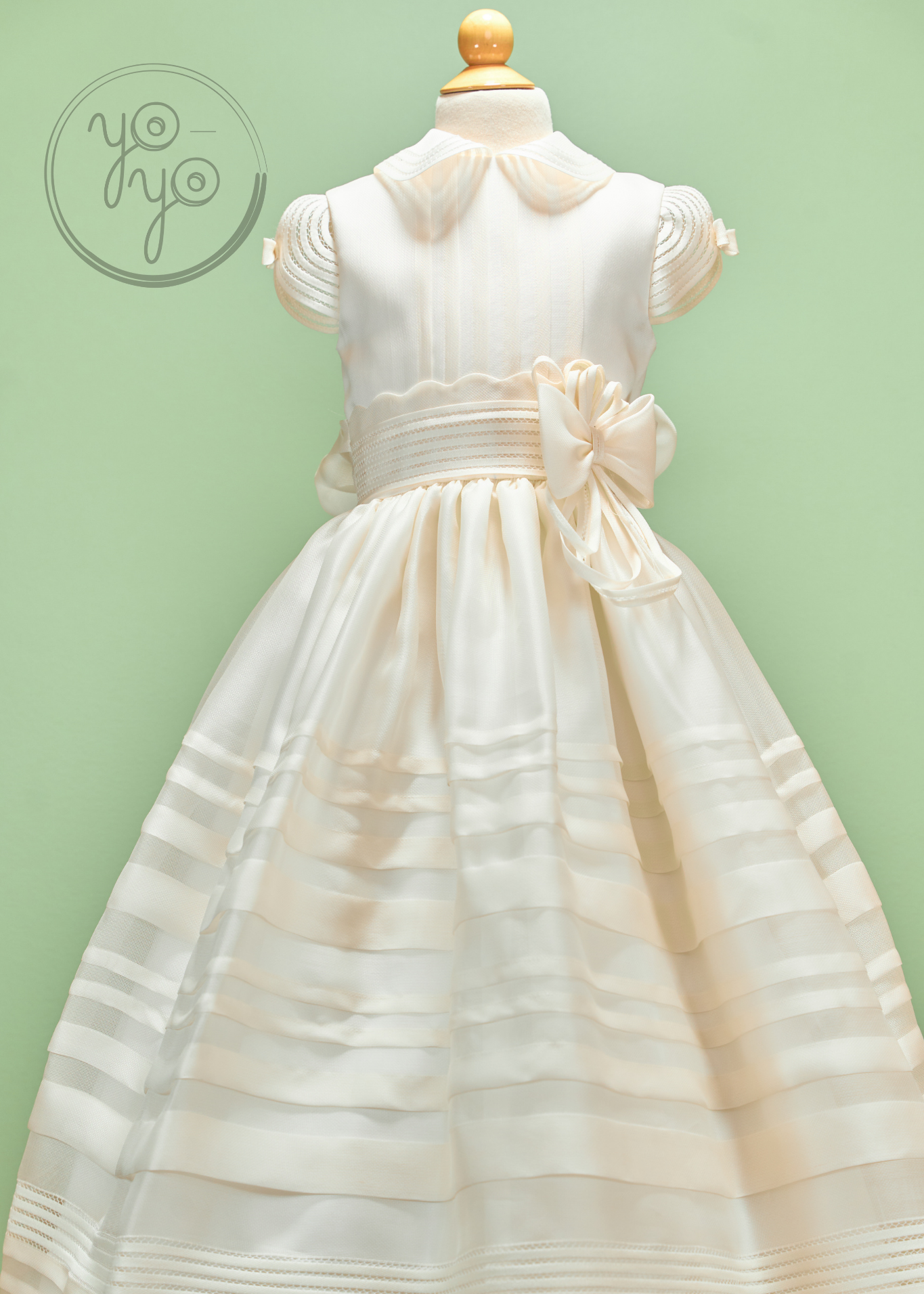 At the back, covered buttons provide a traditional closure, while luxurious Mikado silk ties form a full, elegant bow. Tulipán is a stunning gown for families who value true craftsmanship and elegance in a First Communion dress.