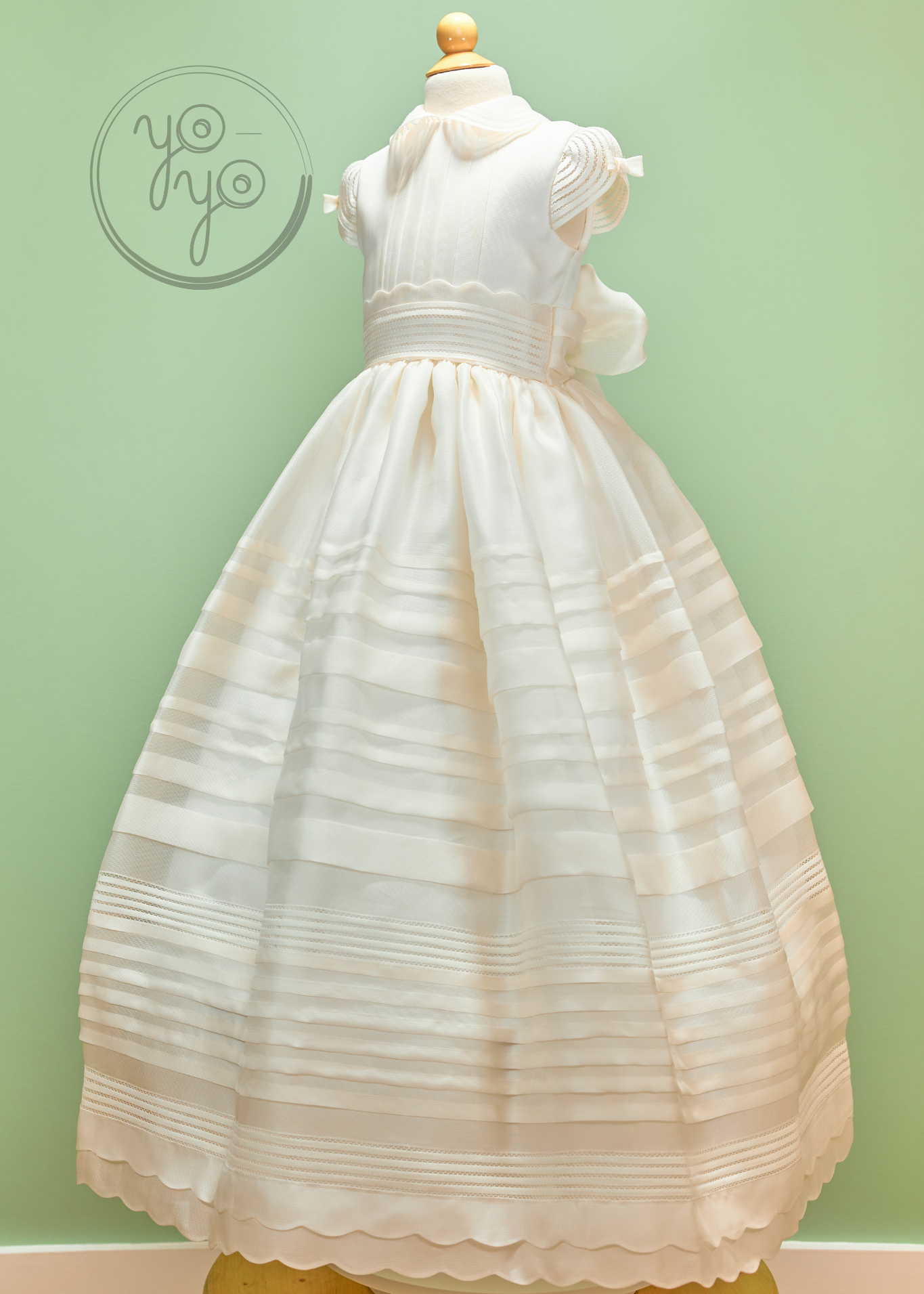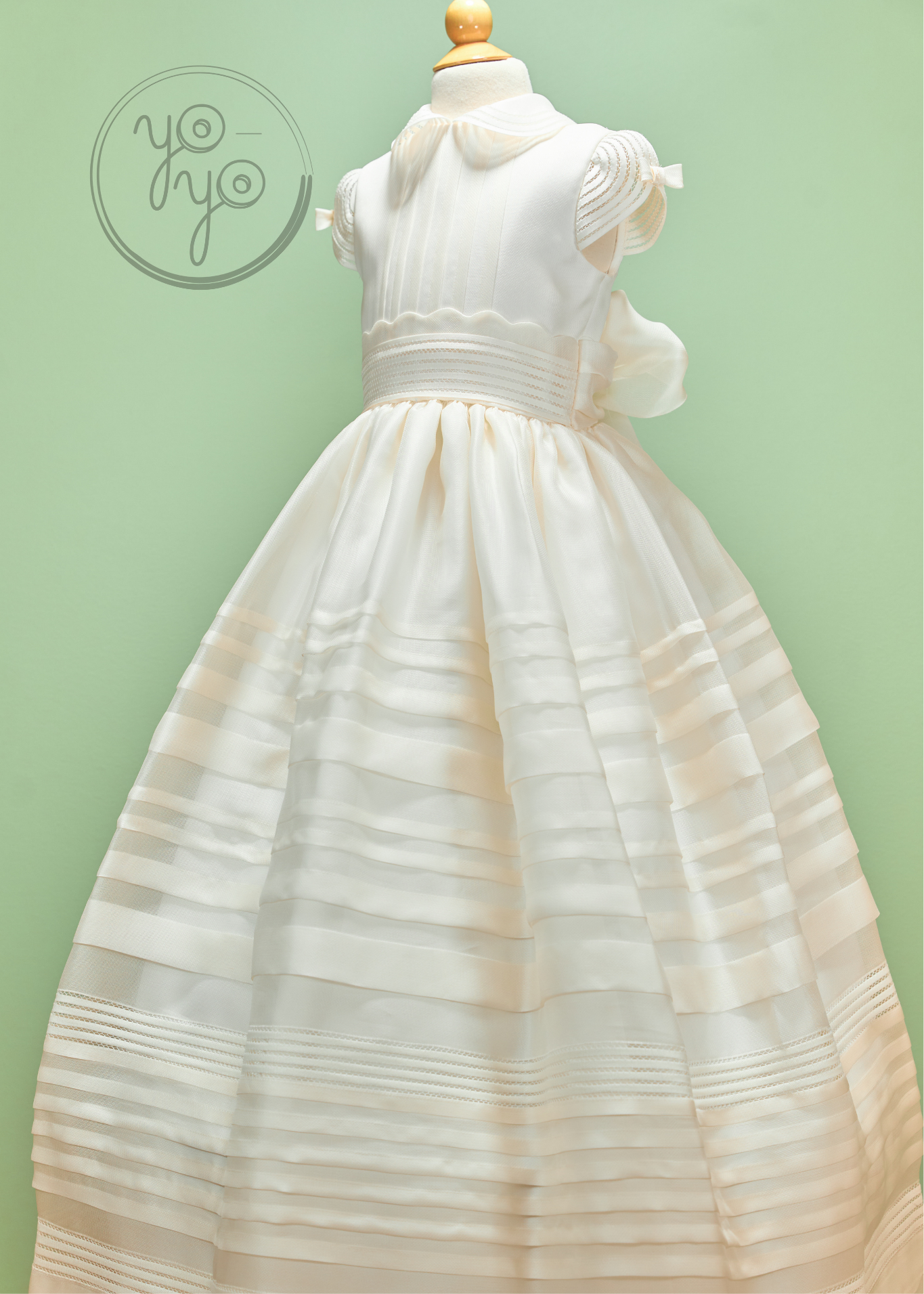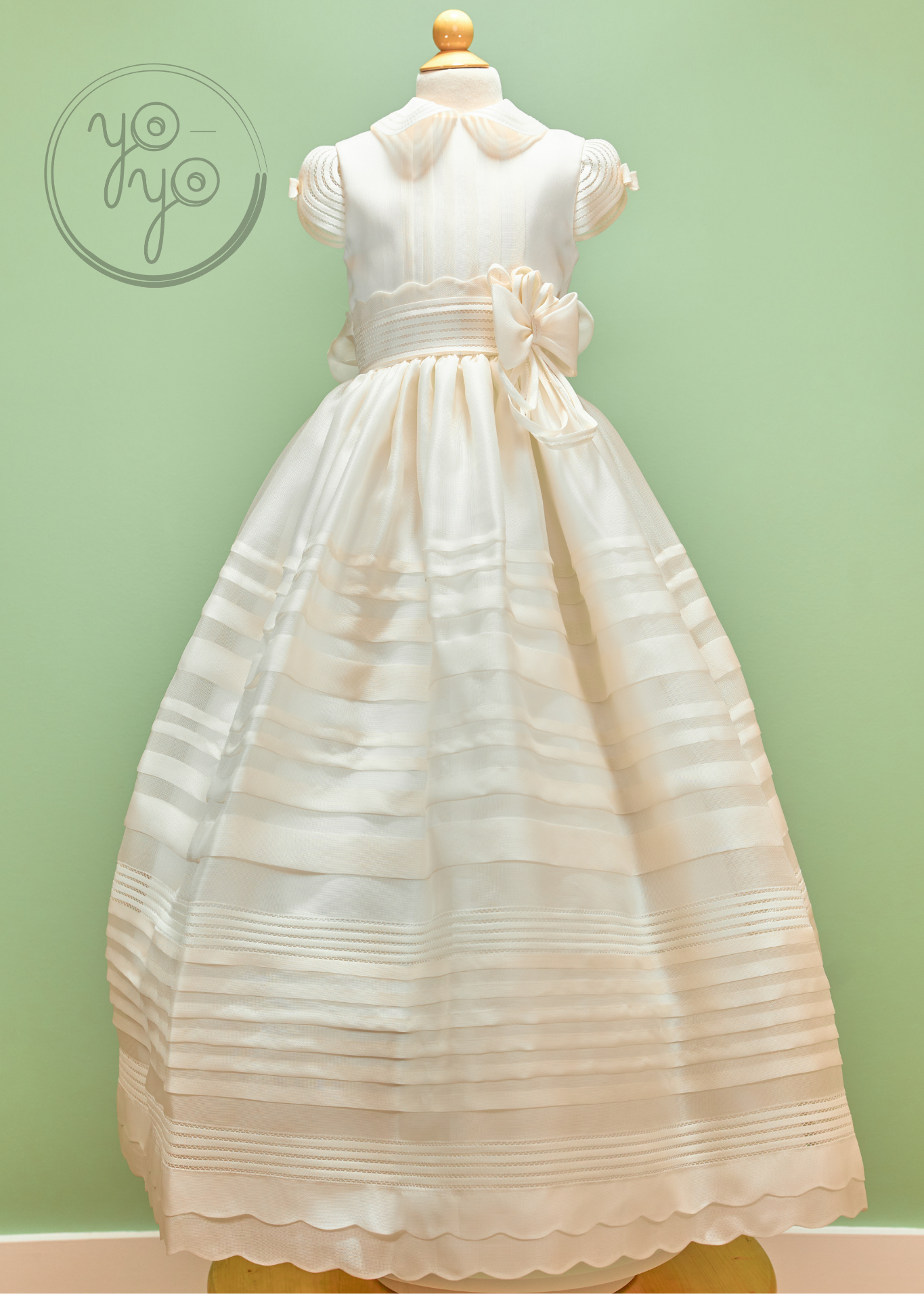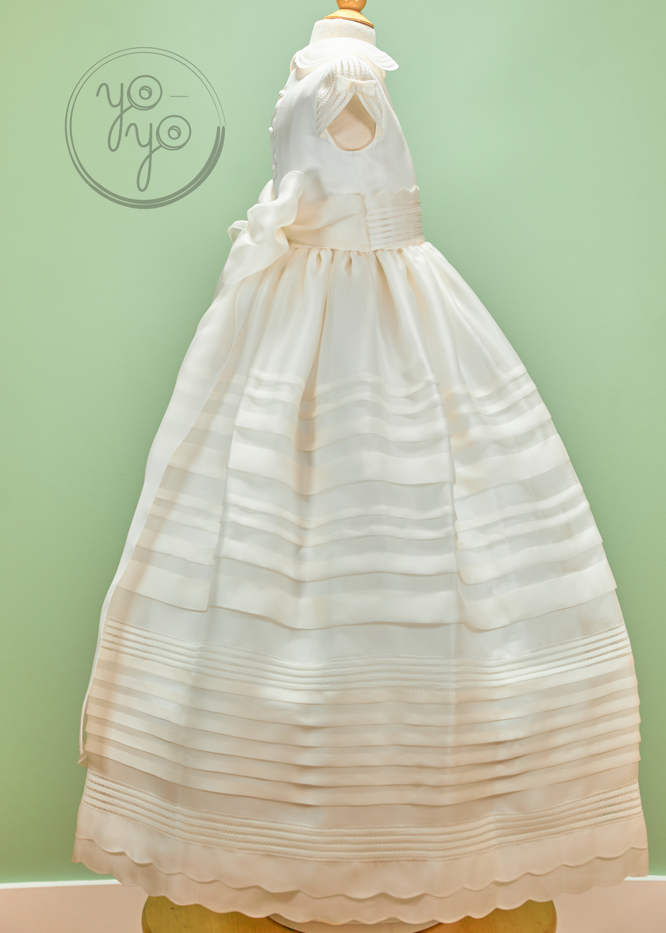 At the back, covered buttons provide a traditional closure, while luxurious Mikado silk ties form a full, elegant bow. Tulipán is a stunning gown for families who value true craftsmanship and elegance in a First Communion dress.