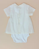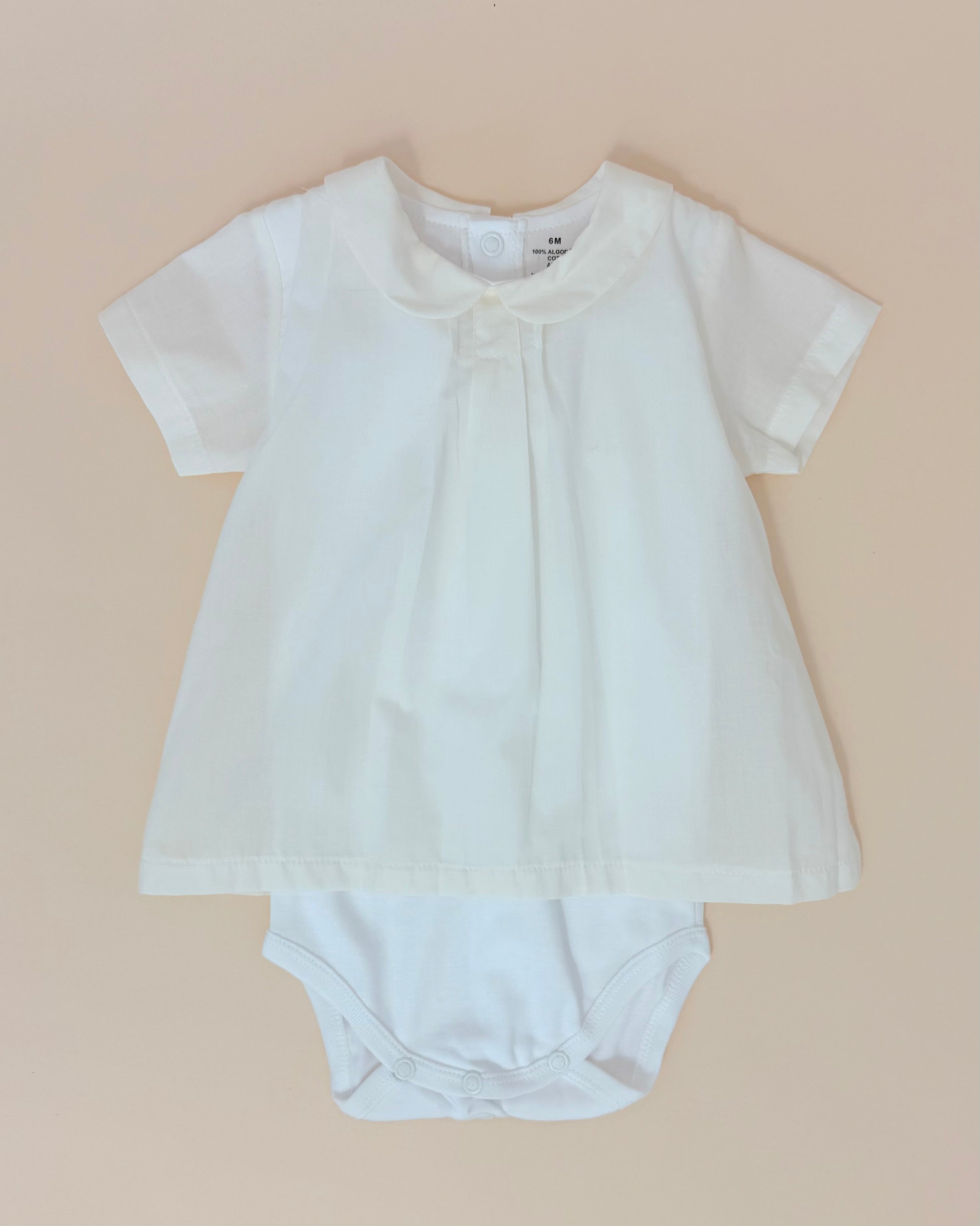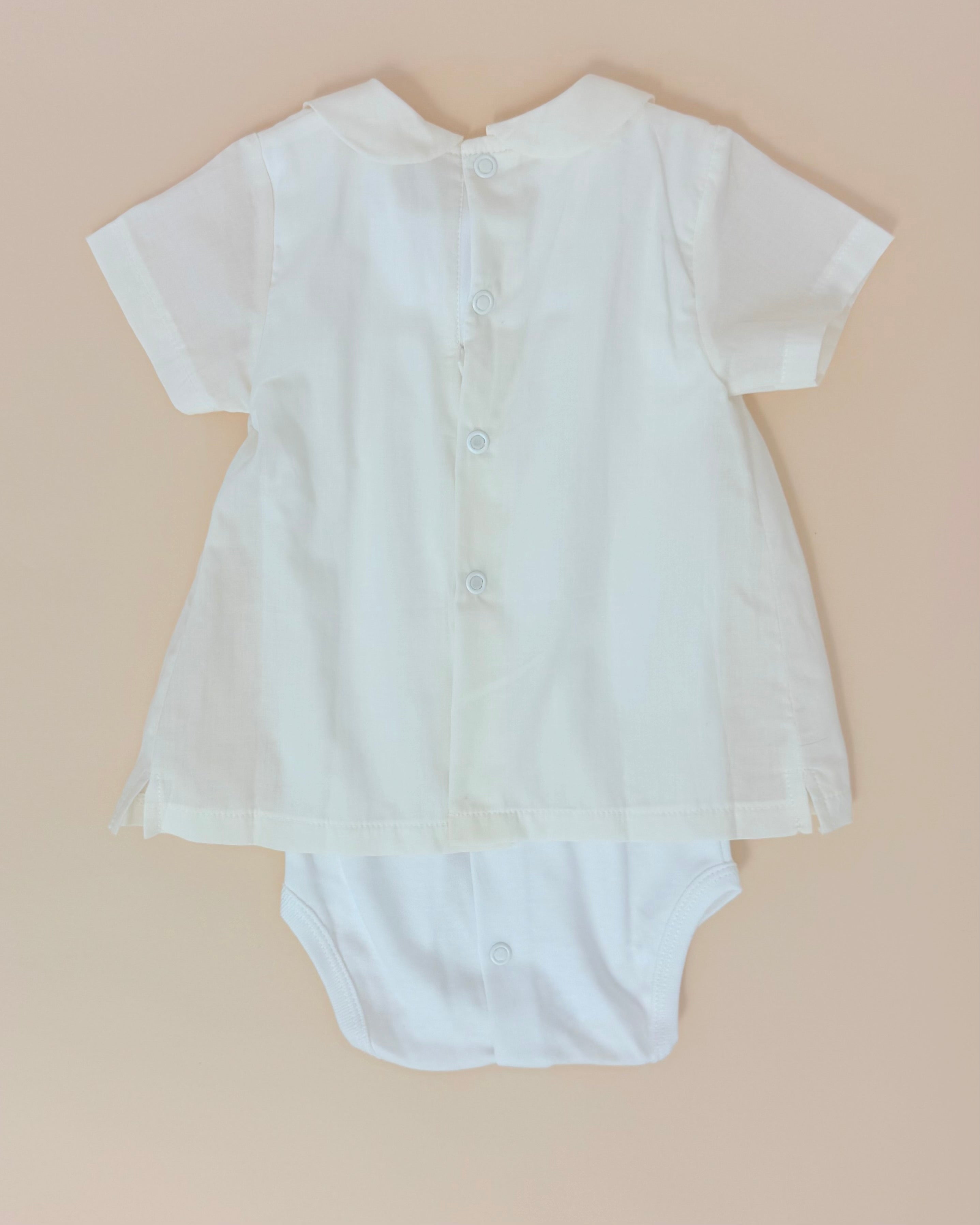 This elegant baby onesie in classic white comes with an attached off-white poplin shirt, designed with a timeless Peter Pan collar. Thoughtfully crafted in Portugal, this piece combines the comfort of a onesie with the polished look of a dress shirt—perfect for baby boys, as the shirt stays neatly in place all day. Ideal for special occasions or everyday elegance.