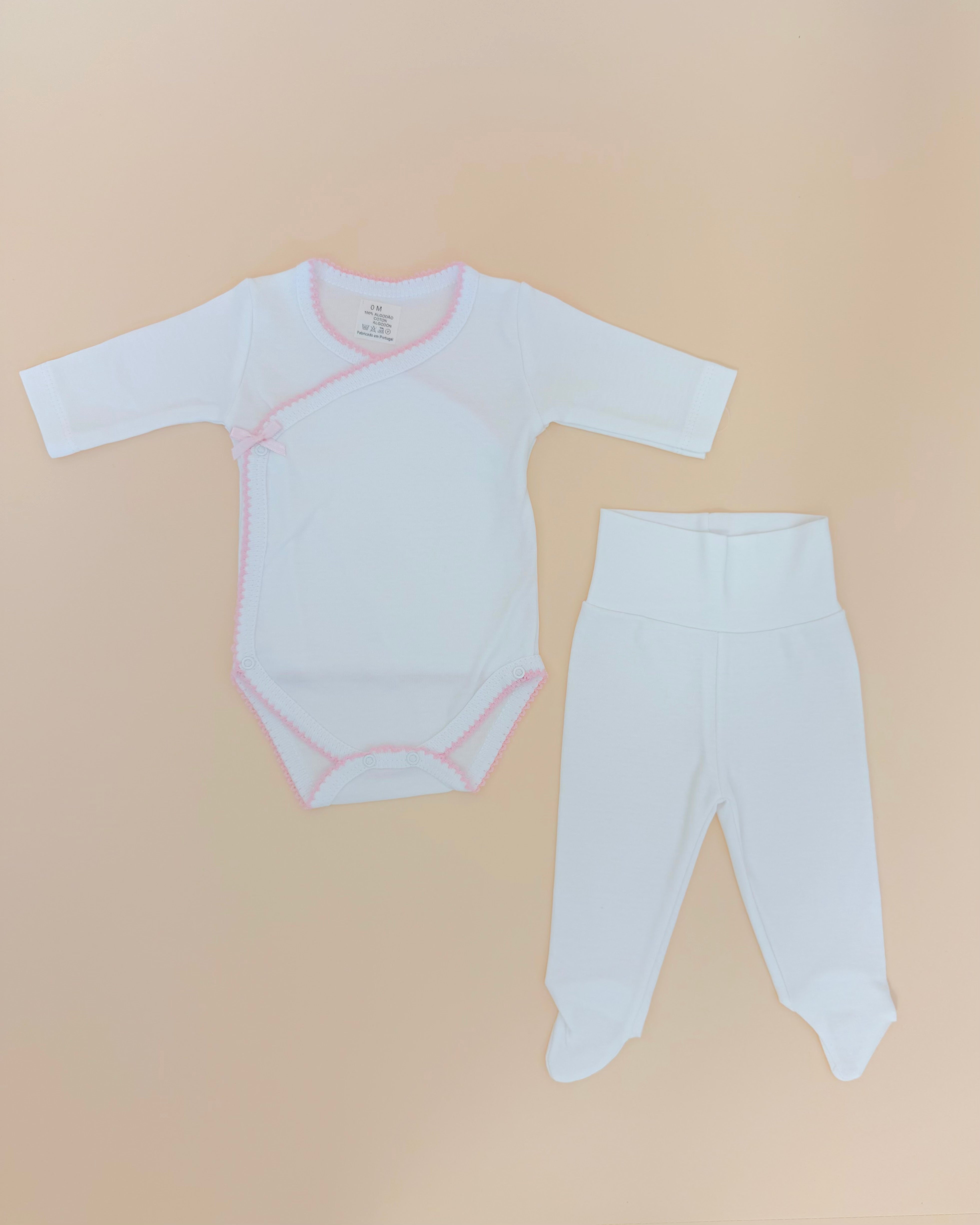 Timeless simplicity meets exceptional comfort in this two-piece newborn set, handcrafted in Portugal from soft, breathable cotton. The kimono-style onesie features a gentle wrap design ideal for a newborn’s delicate skin, paired with coordinating pants for a cozy, complete look. Its pure white hue and subtle trim make it a refined choice for everyday elegance or a thoughtful newborn gift.