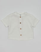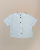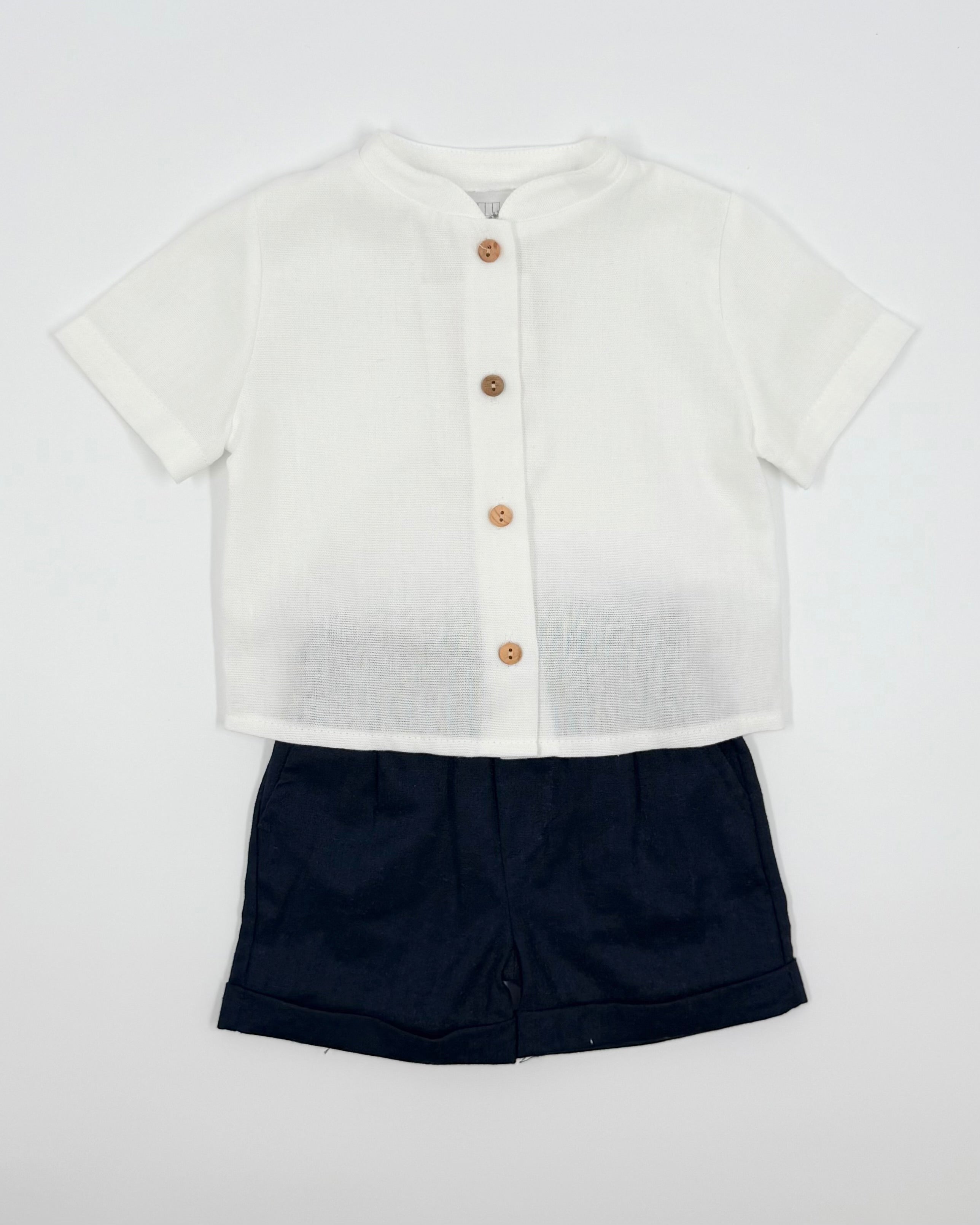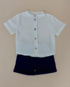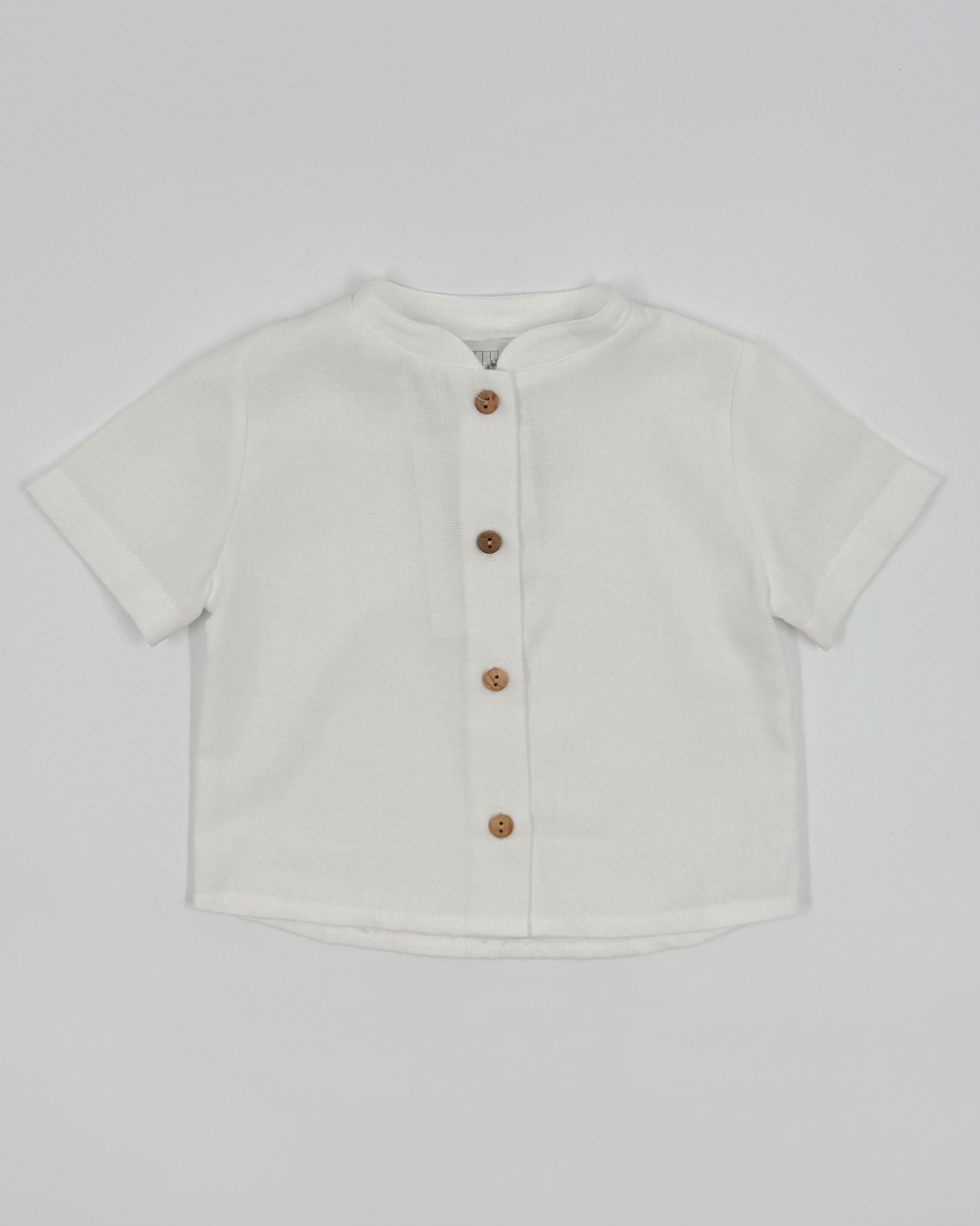 Dress your baby boy in timeless elegance with this charming two-piece set. The crisp white shirt features short sleeves, a classic mao collar, and delicate wooden buttons down the front for a refined, natural touch.