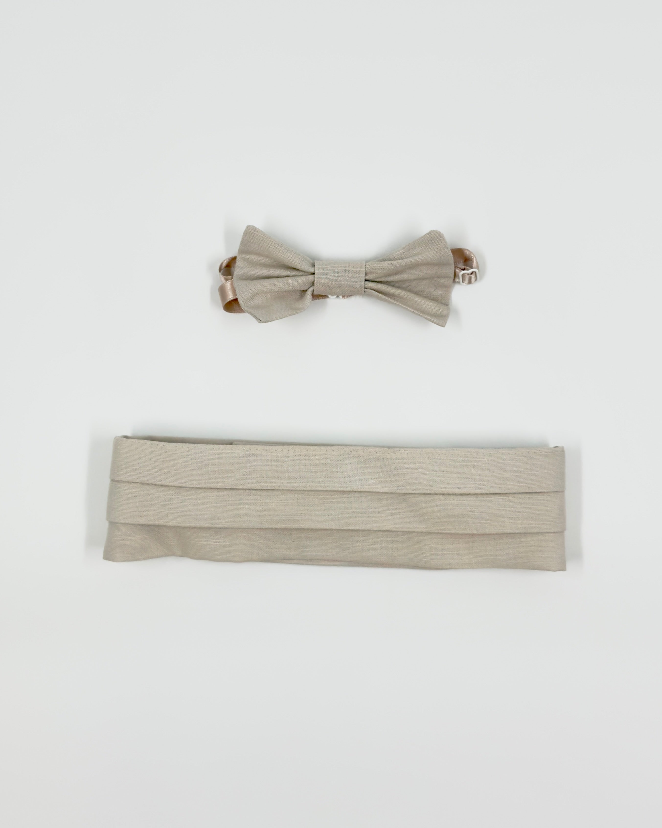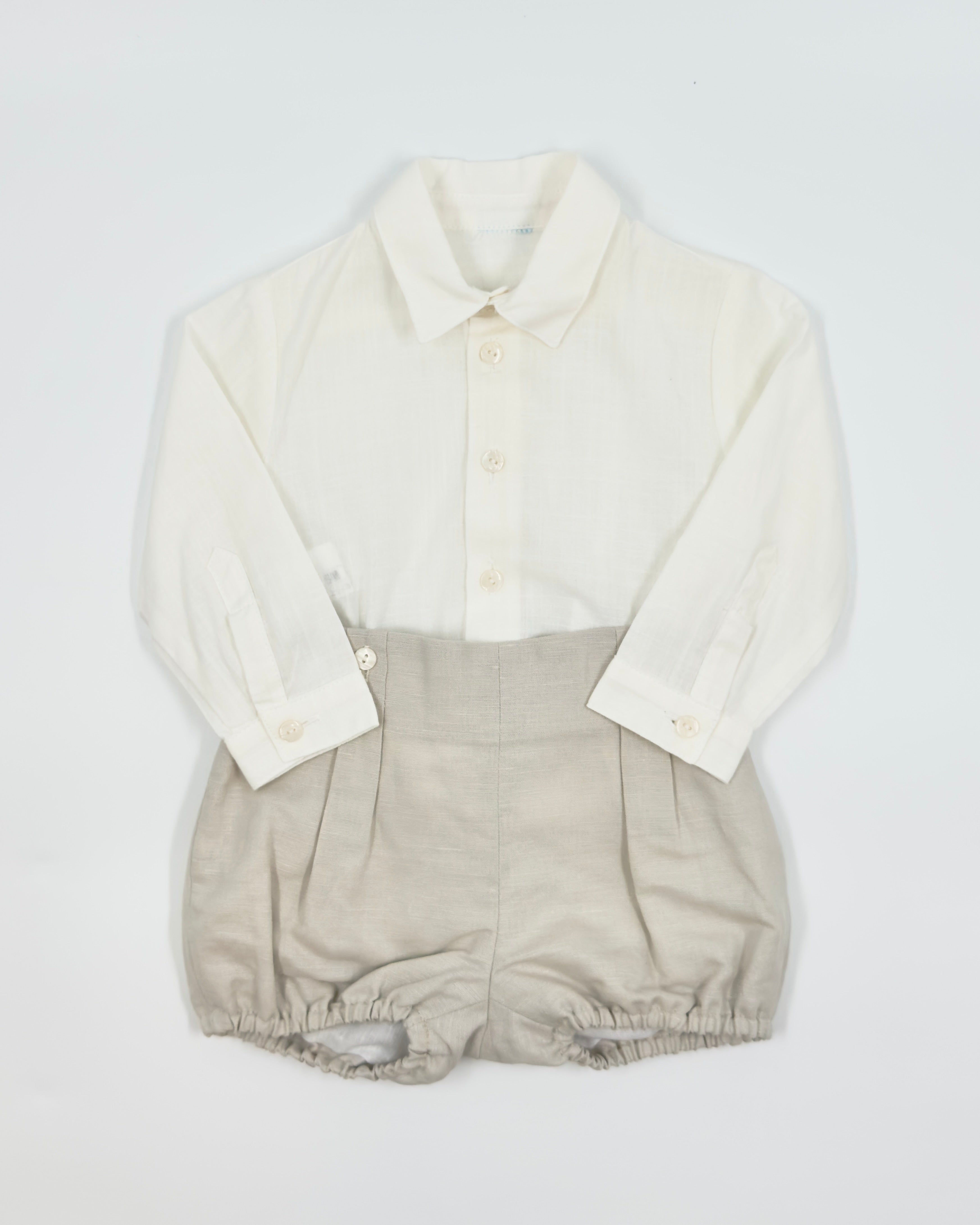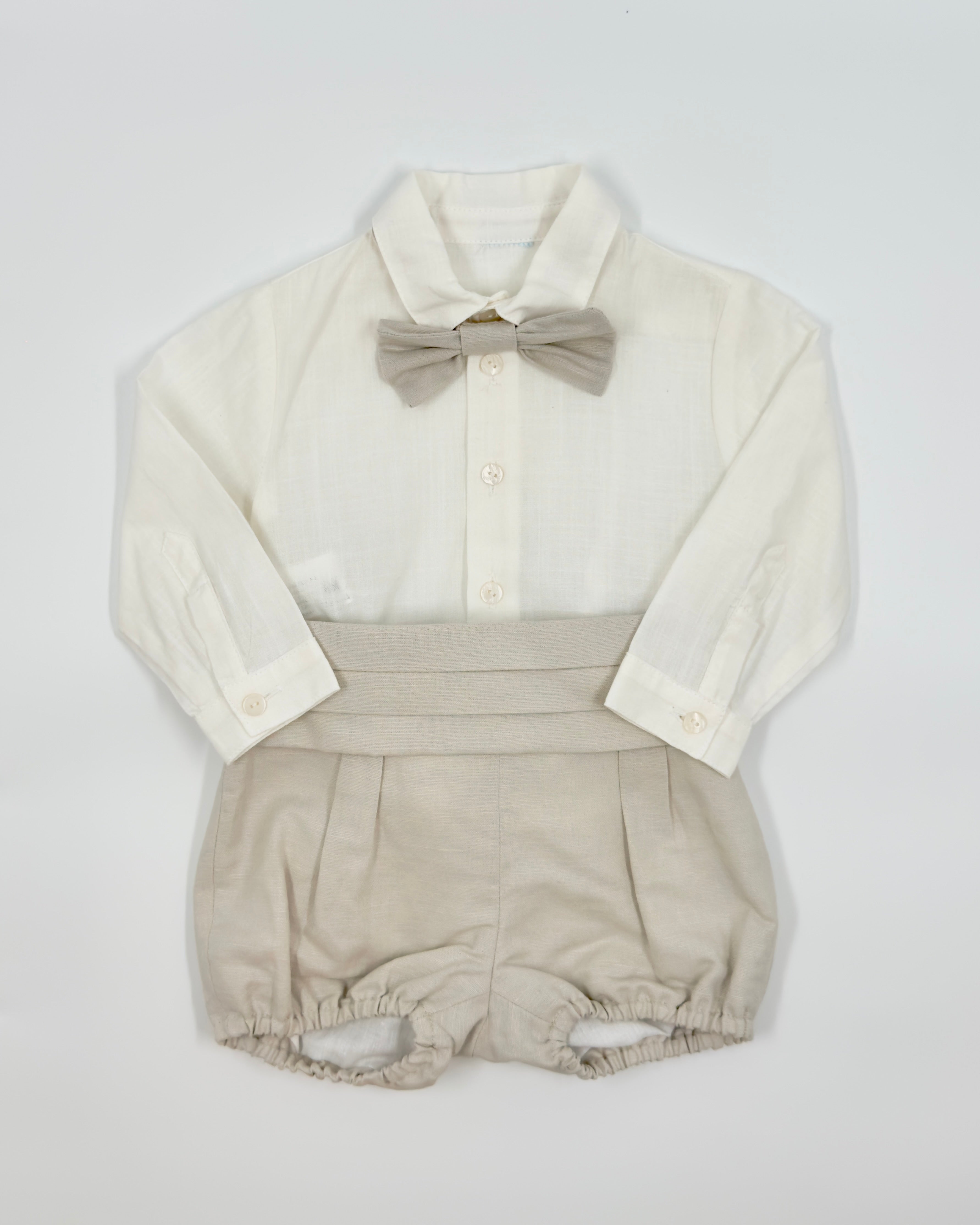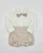 The Alex outfit is a timeless two-piece set for baby boys, designed for weddings, ring bearers, and elegant occasions. This refined ensemble features a crisp white long-sleeve shirt with front buttons, paired with classic sand-colored bubble shorts. A matching sand bow tie and sash add a sweet, coordinated touch—perfect for celebrating life’s most special moments in style.
