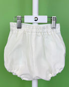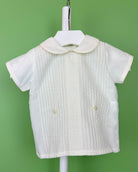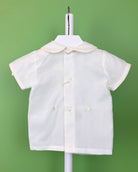 Alonso is a traditional two-piece outfit for baby boys, made with a batiste lining and organza shell in off-white. The shirt has a peter pan collar and details with buttons on the back for closure. The bubble short has elastic on the leg opening, which is very soft, and buttons on the side for closure. Very elegant and unique option to dress your little one in any special occasion.