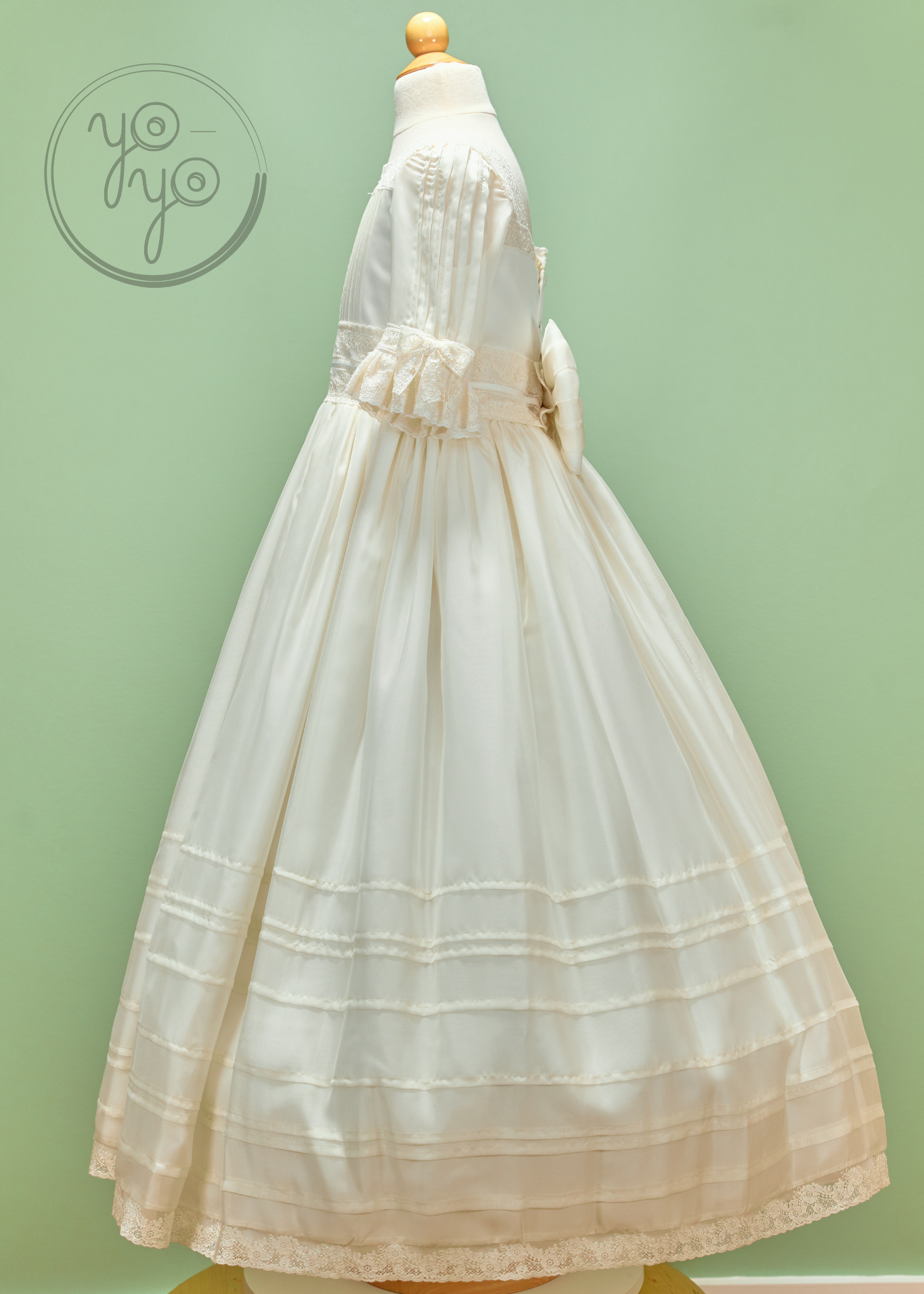 At the waist, a lace-trimmed sash defines the silhouette, tying at the back with silk organdy strings that form a soft, graceful bow. The skirt is finished with pleats and lace along the hem, creating a romantic and heirloom-worthy design. Covered buttons at the back complete the look.