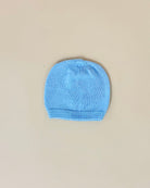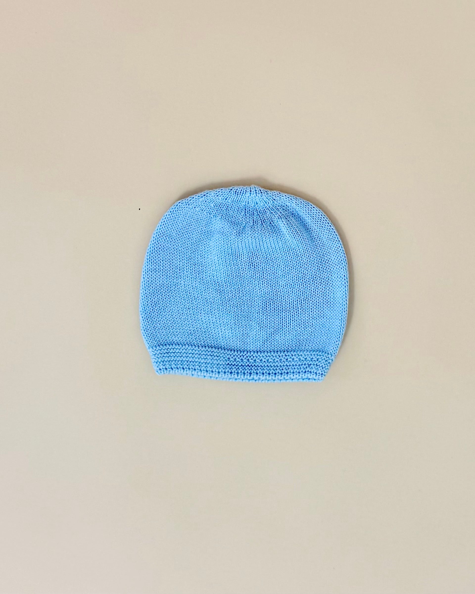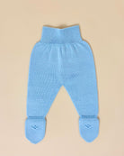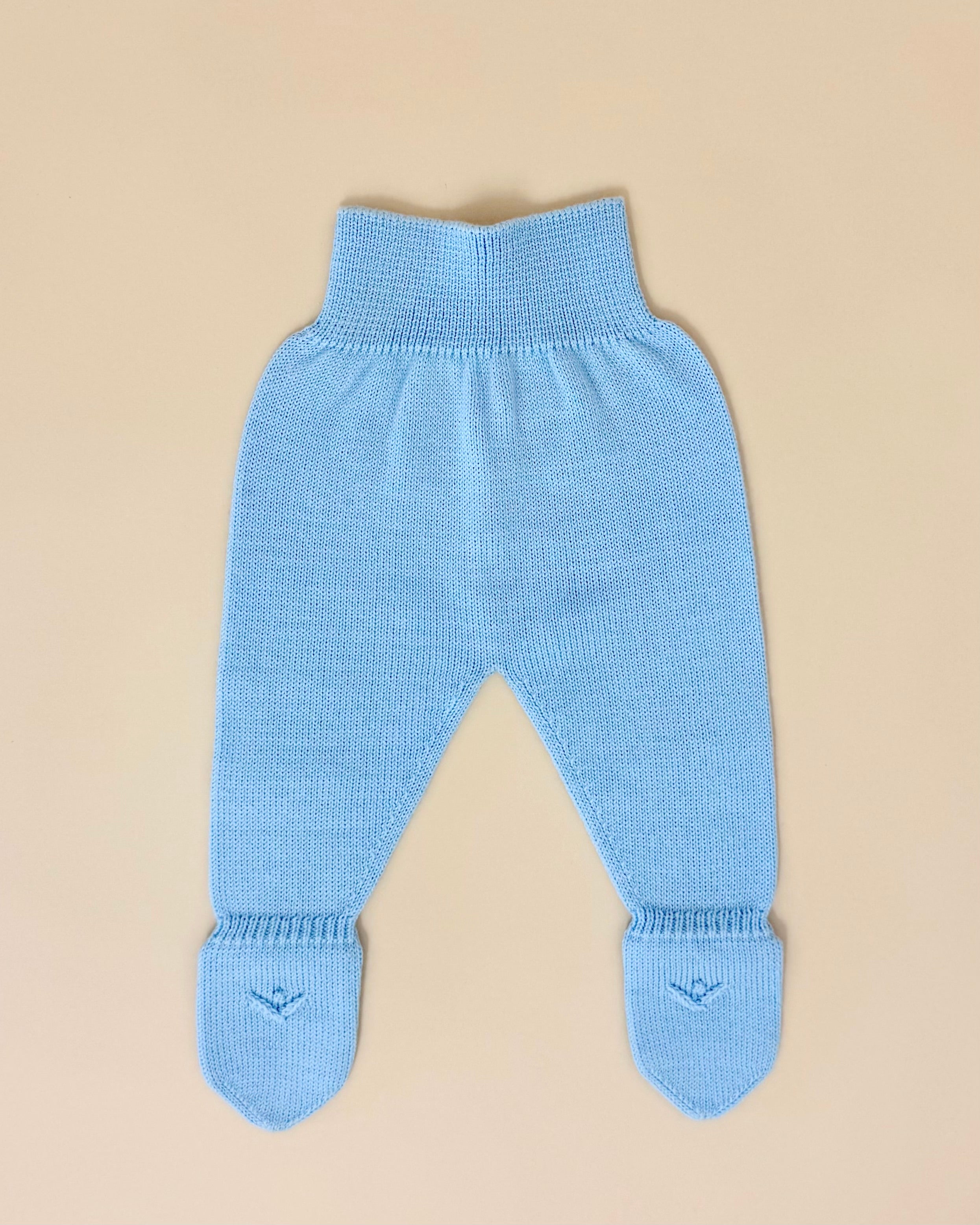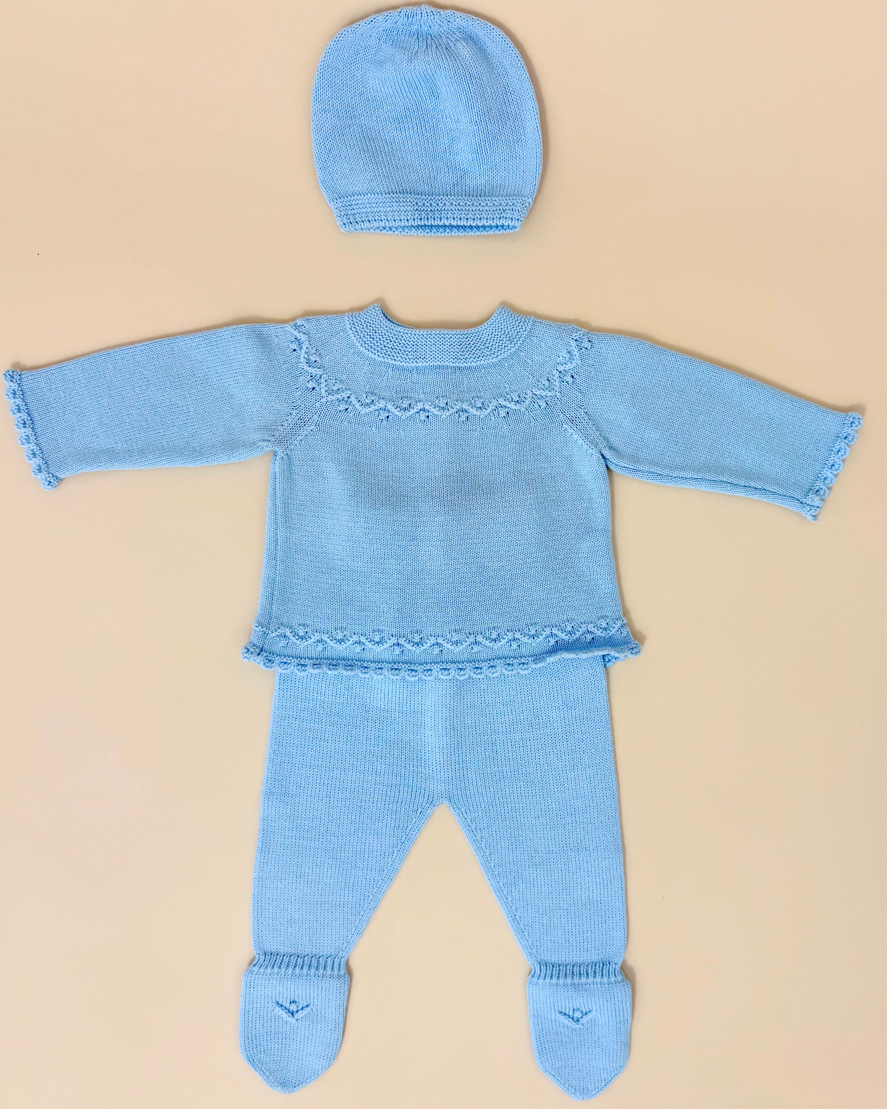 Handcrafted in Spain with premium craftsmanship, the set includes a baby blue knitted top with back button closure, matching footed pants, and a coordinated beanie—a beautifully cohesive look for your little one’s first days.