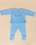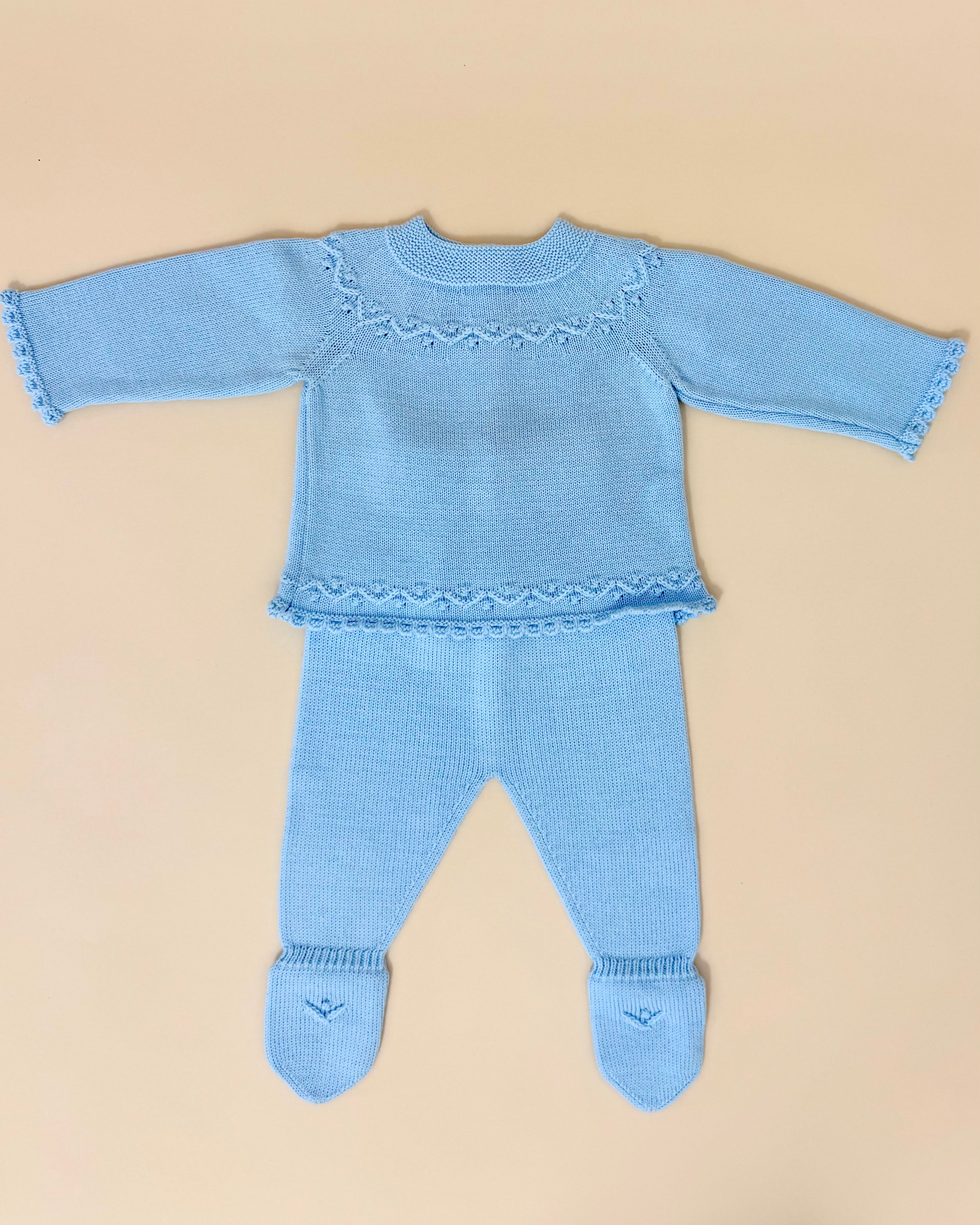 Timeless and sweet, this baby blue knitted outfit is the perfect blend of modern simplicity and traditional charm, ideal for welcoming your baby boy with warmth and elegance.