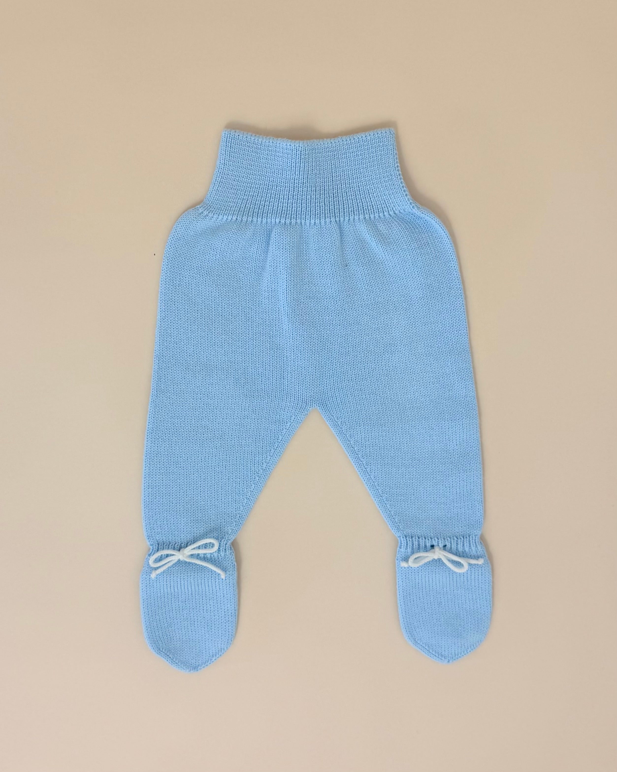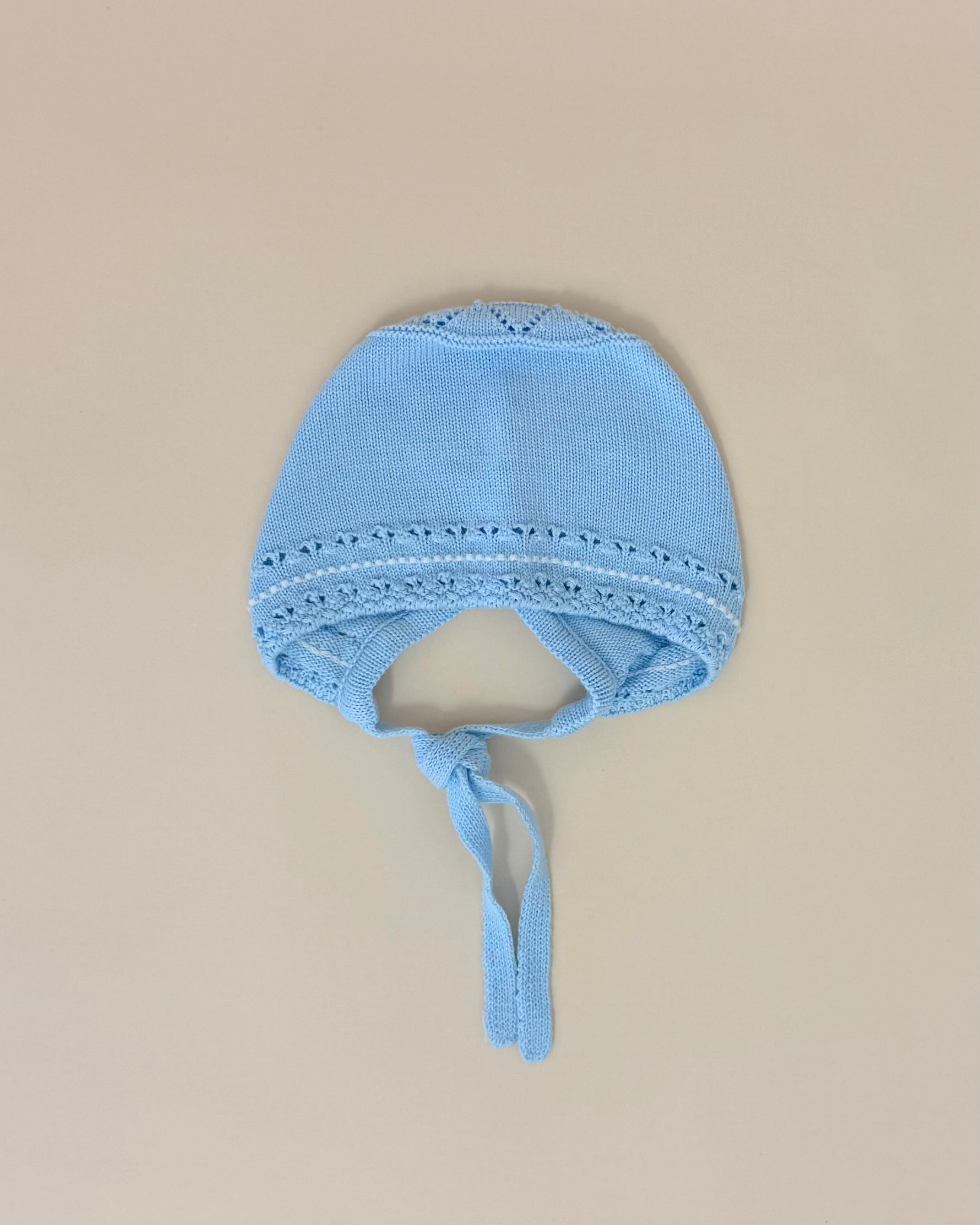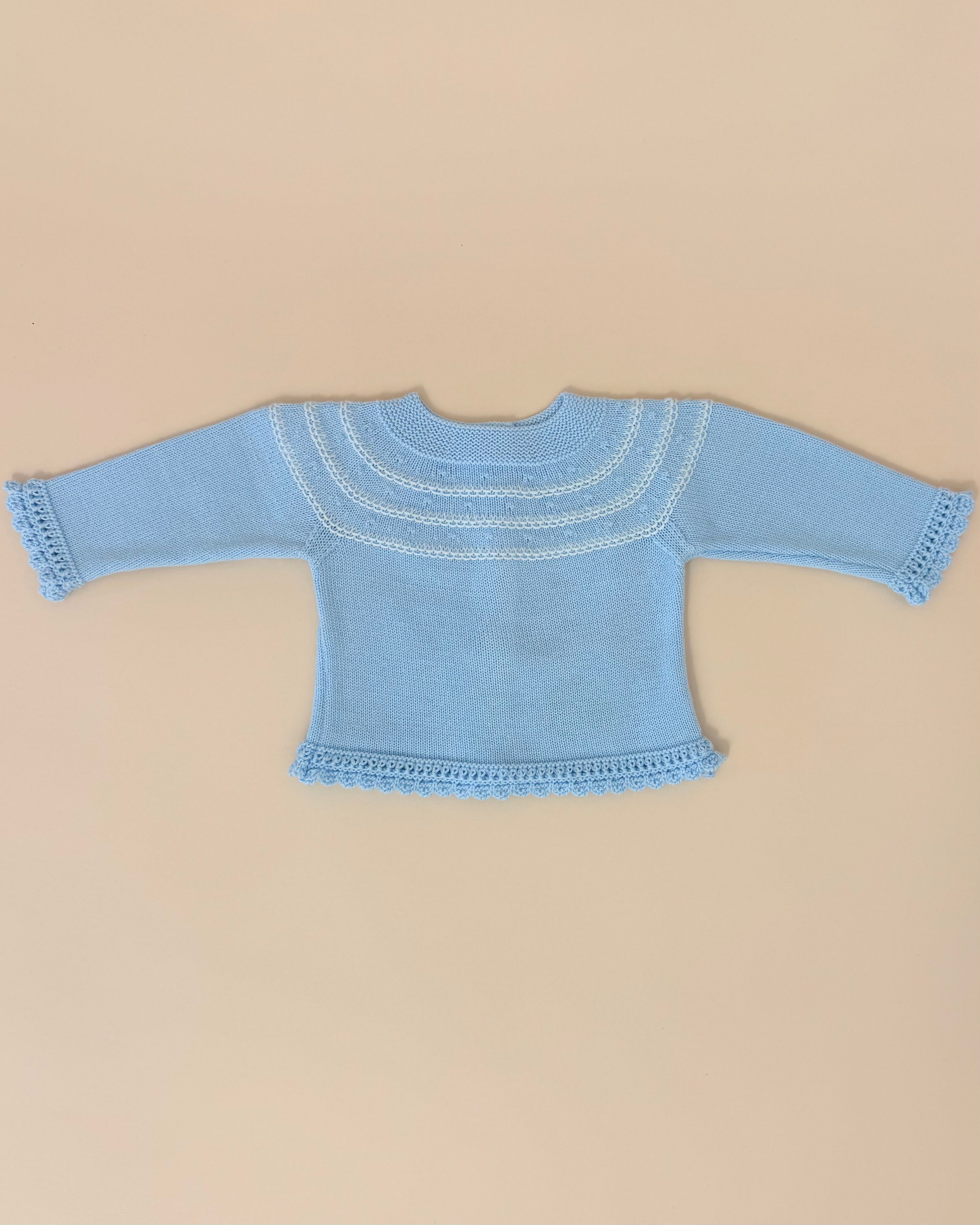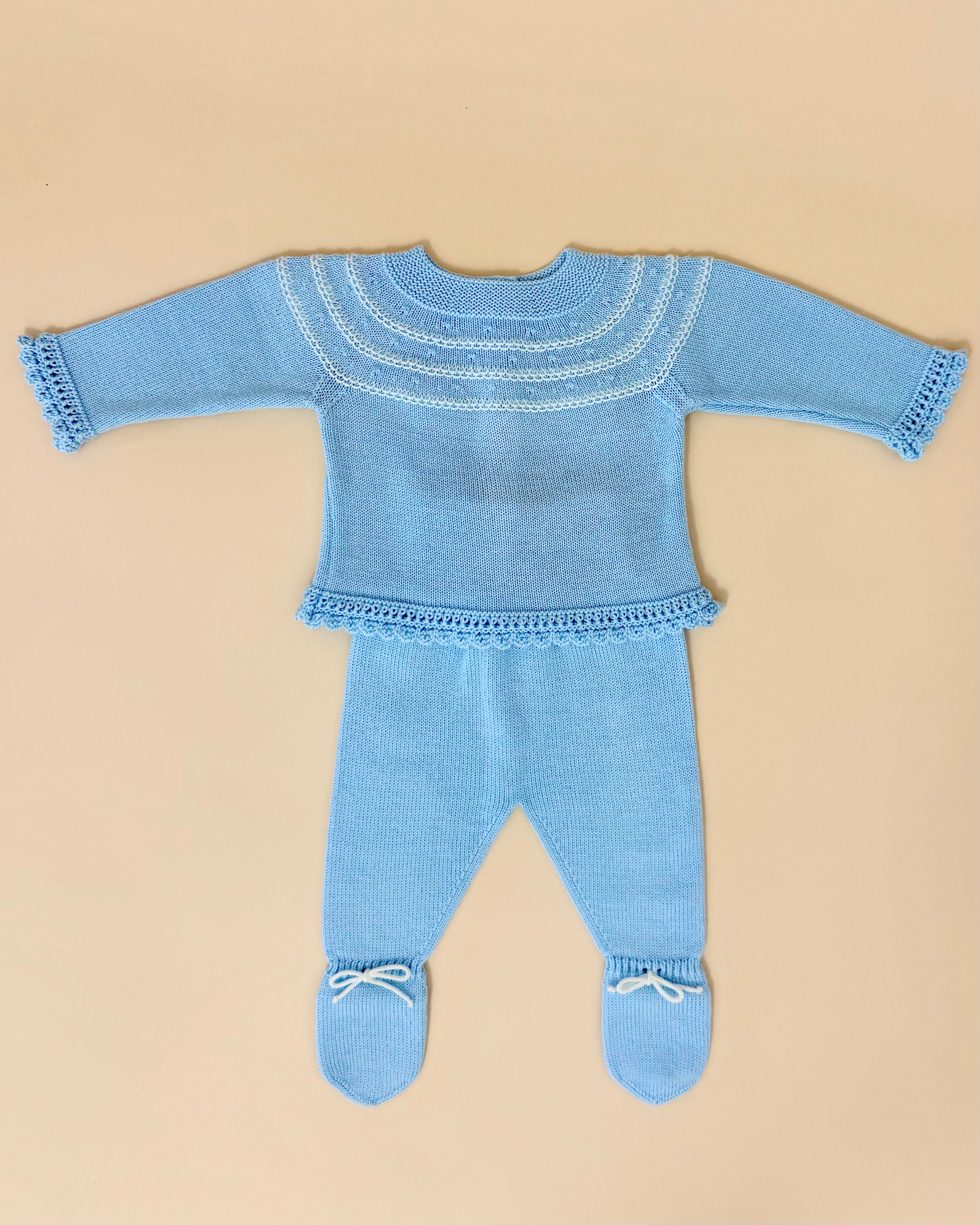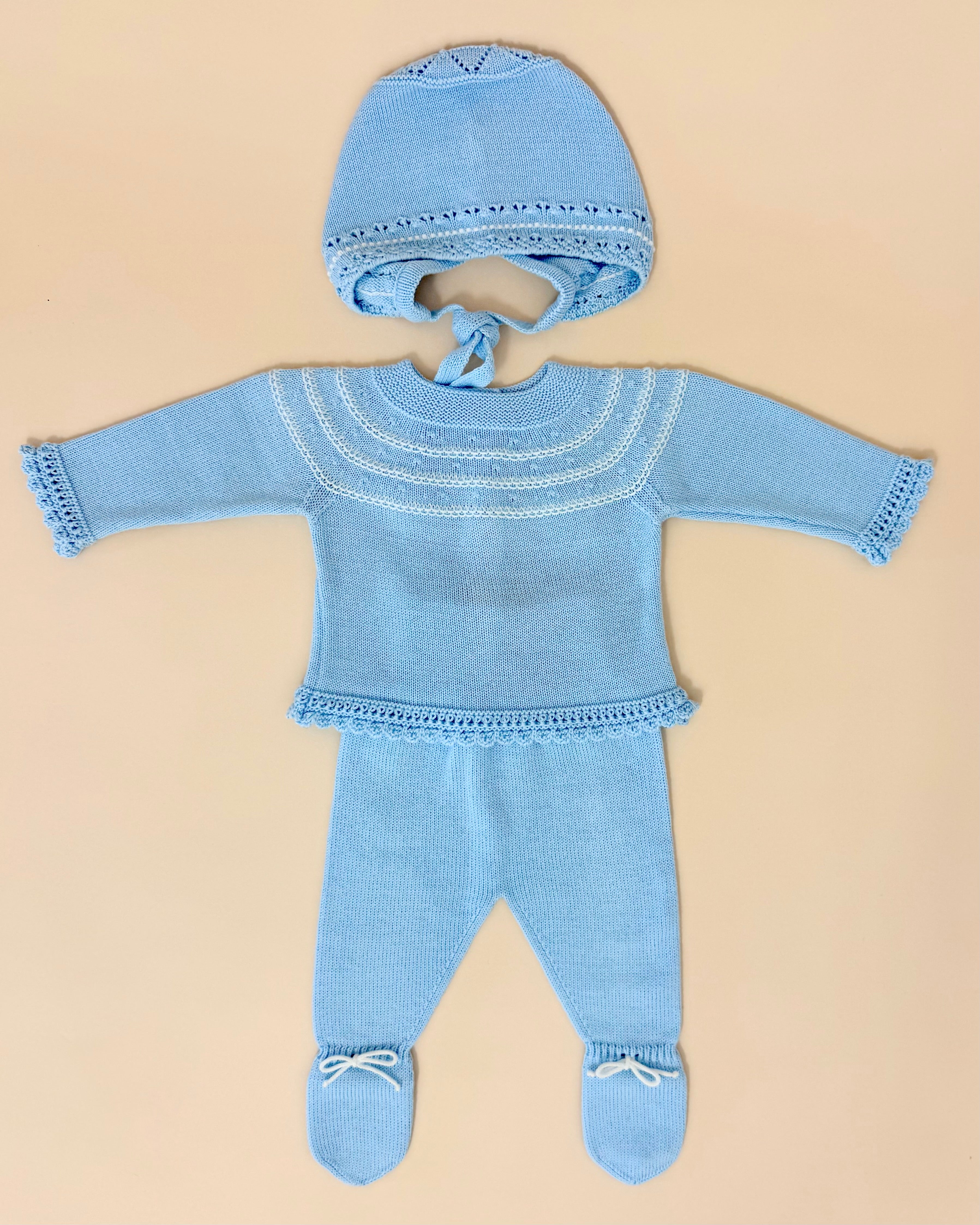Handcrafted in Spain with exceptional attention to quality, the set includes a baby blue knitted top featuring delicate white detail on the collar and back button closure, matching footed pants, and a coordinated bonnet for a timeless and polished look.