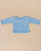 Refined and sweet, this blue knitted outfit with white collar accents is a perfect blend of modern style and traditional elegance, designed to welcome your baby boy with grace and comfort.