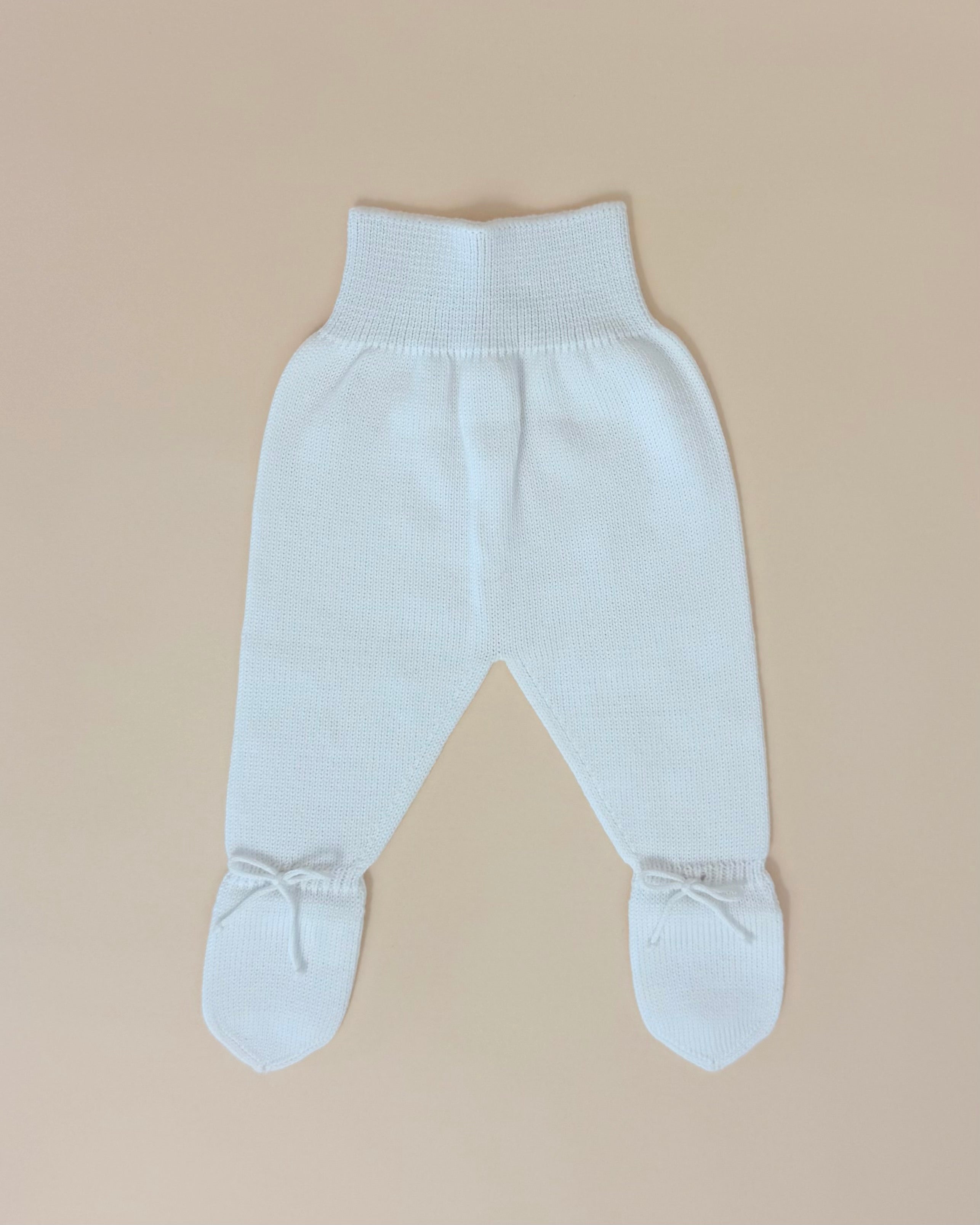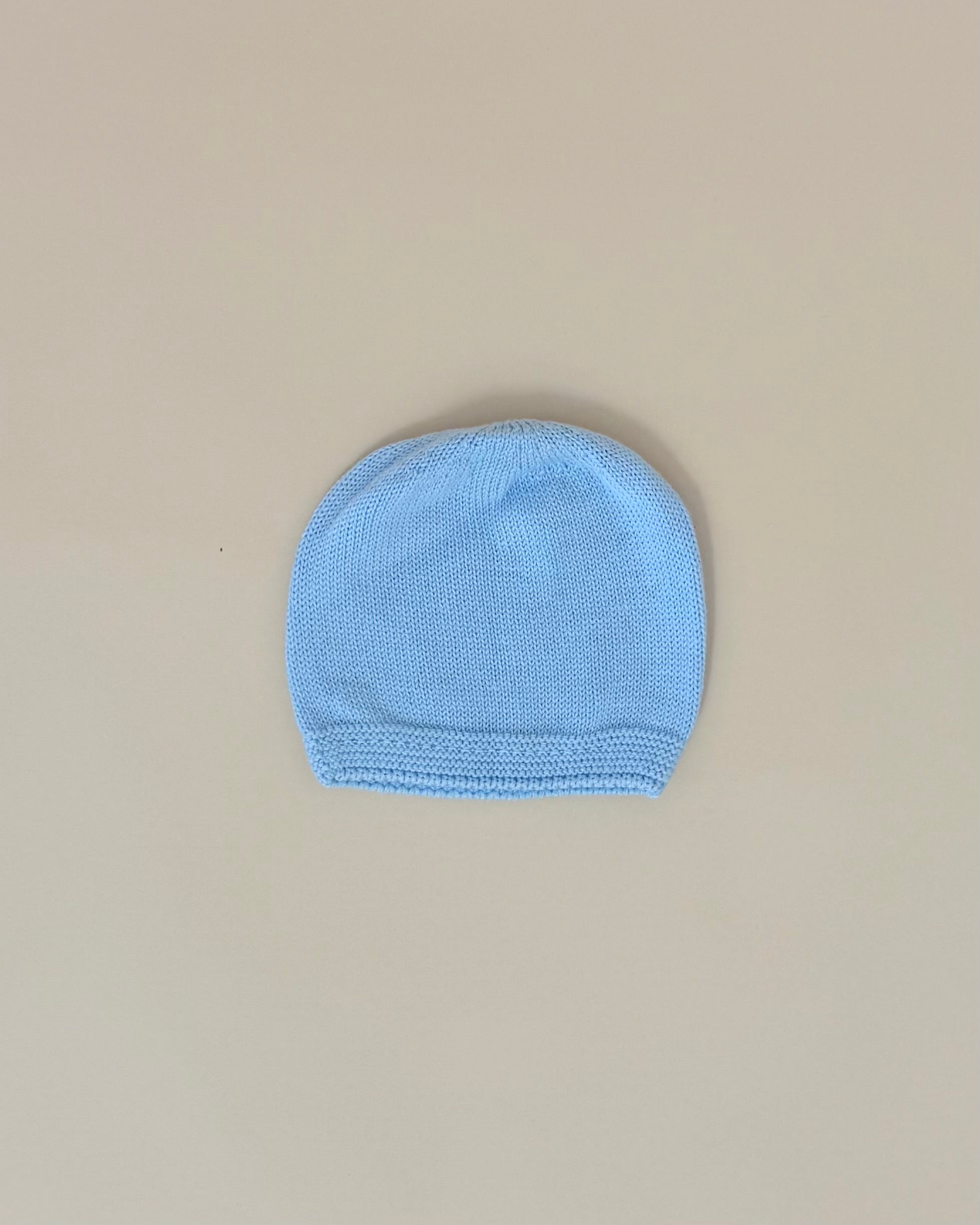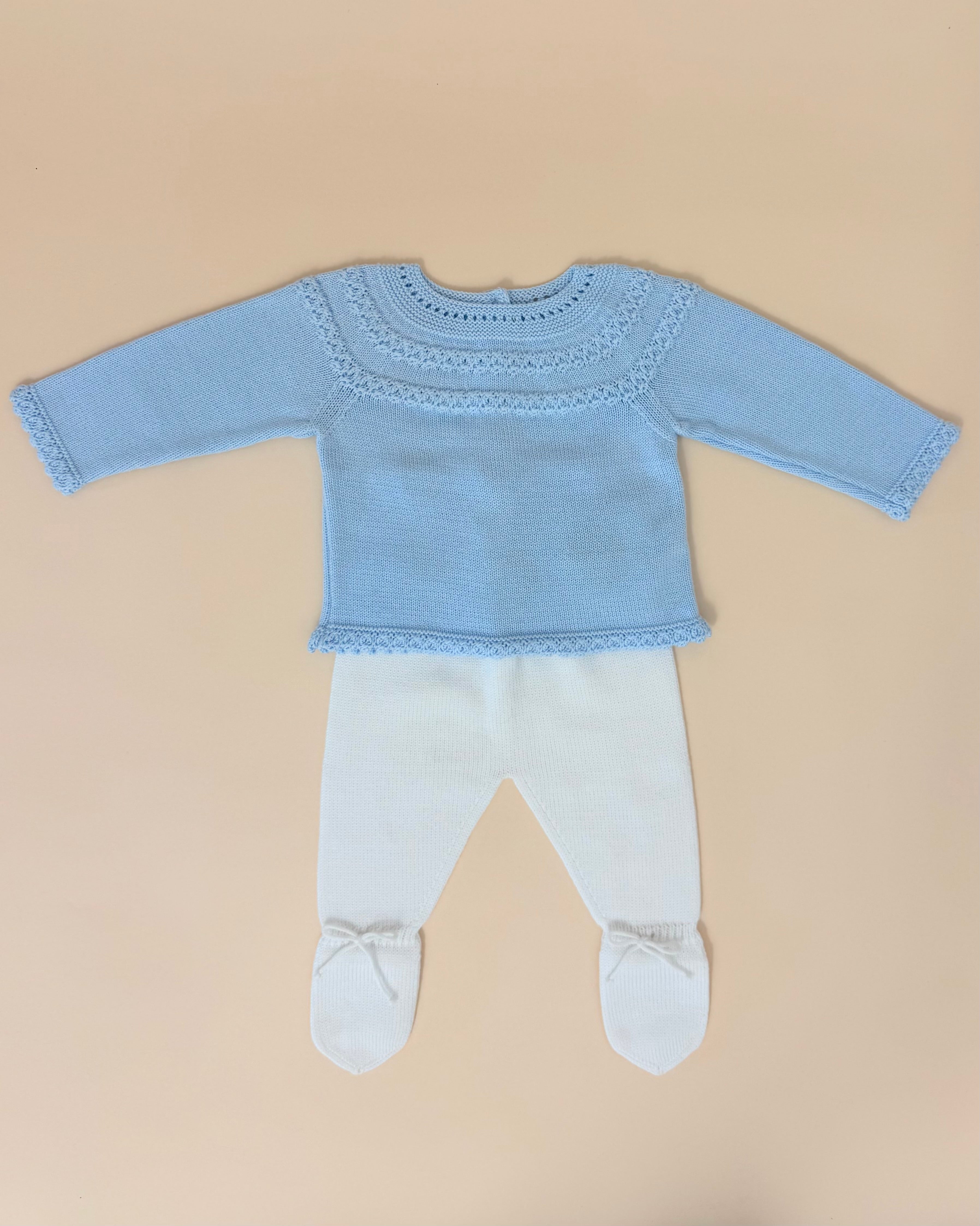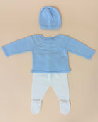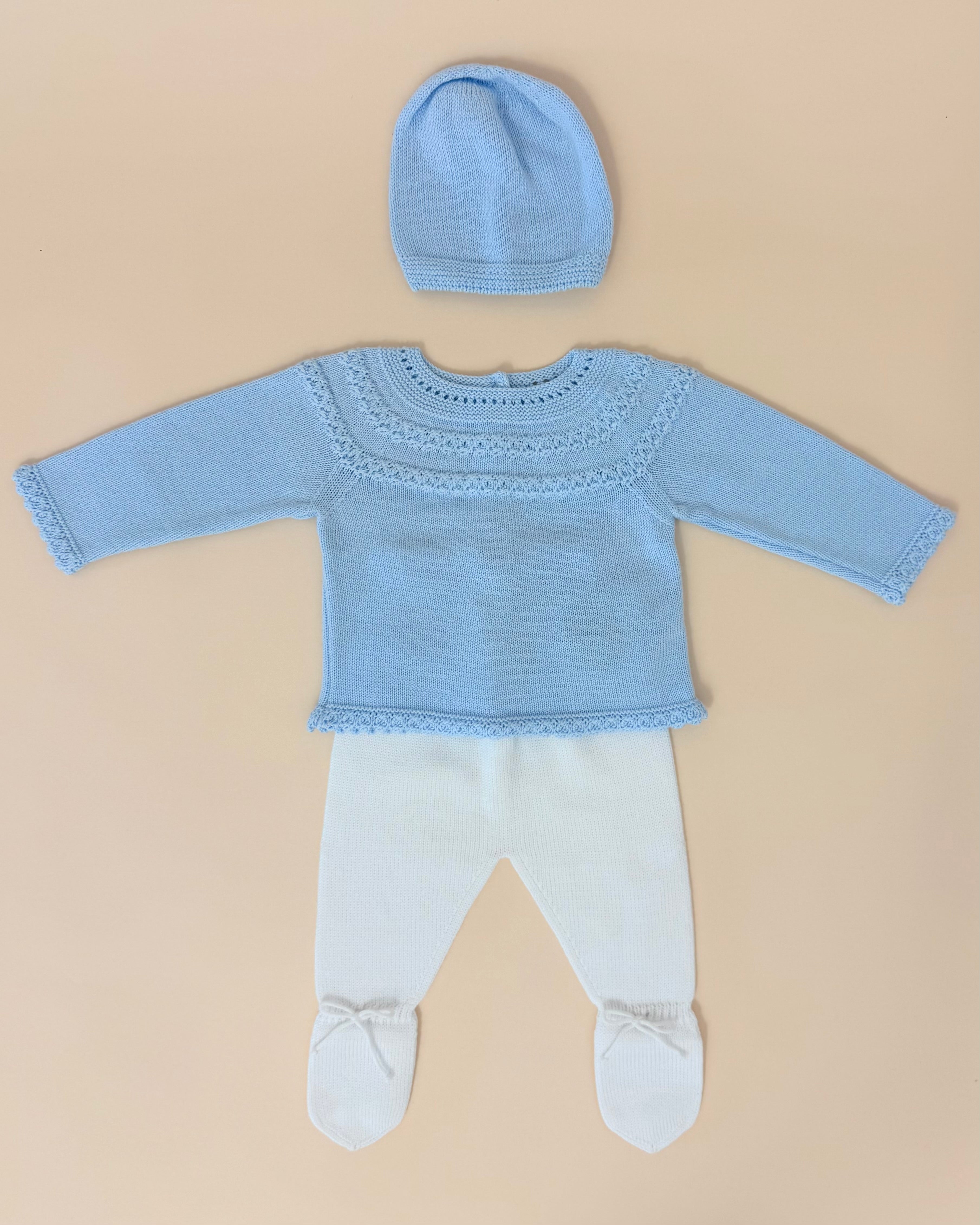Handcrafted in Spain with exceptional care and quality, the set includes a baby blue knitted top with back button closure, white footed pants, and a matching baby blue beanie—a simple yet refined ensemble perfect for his first special moments.