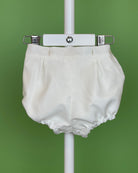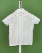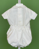 The Diego outfit is a timeless and elegant two-piece set for baby boys, ideal for christenings, weddings, and other special occasions. The top is made from off-white organza and features a classic Peter Pan collar, short sleeves, and delicate handmade pleats, with a traditional back button closure. The matching bubble shorts include side button detailing and a comfortable elastic waistband at the back. Fully lined in soft cotton, Diego combines classic style with a gentle, baby-friendly finish.