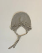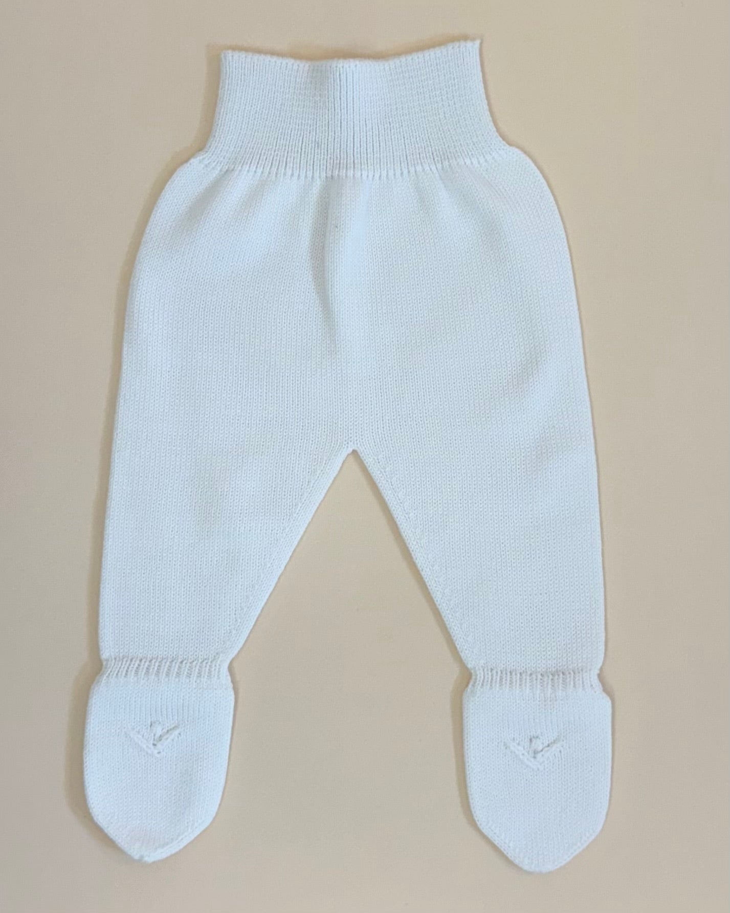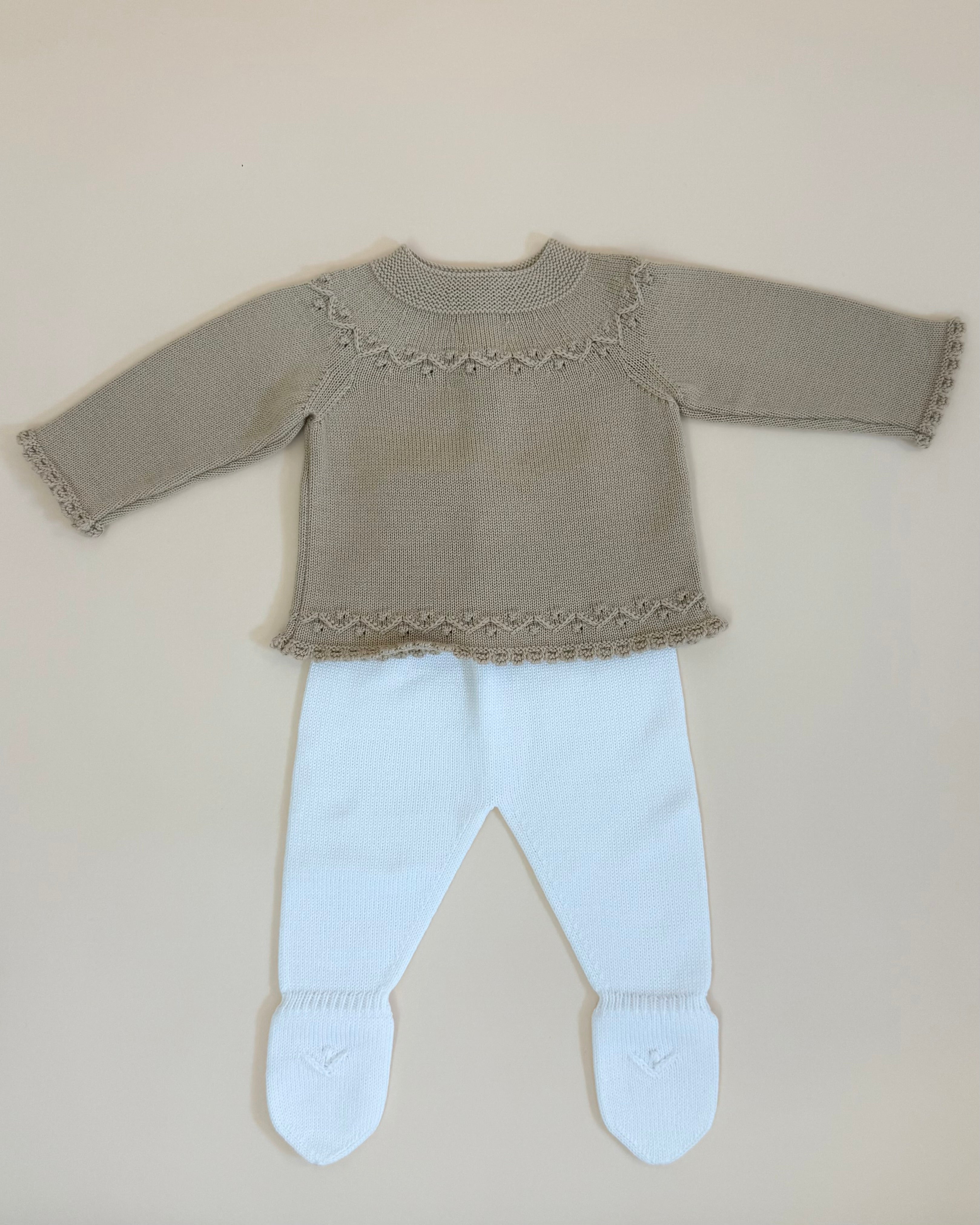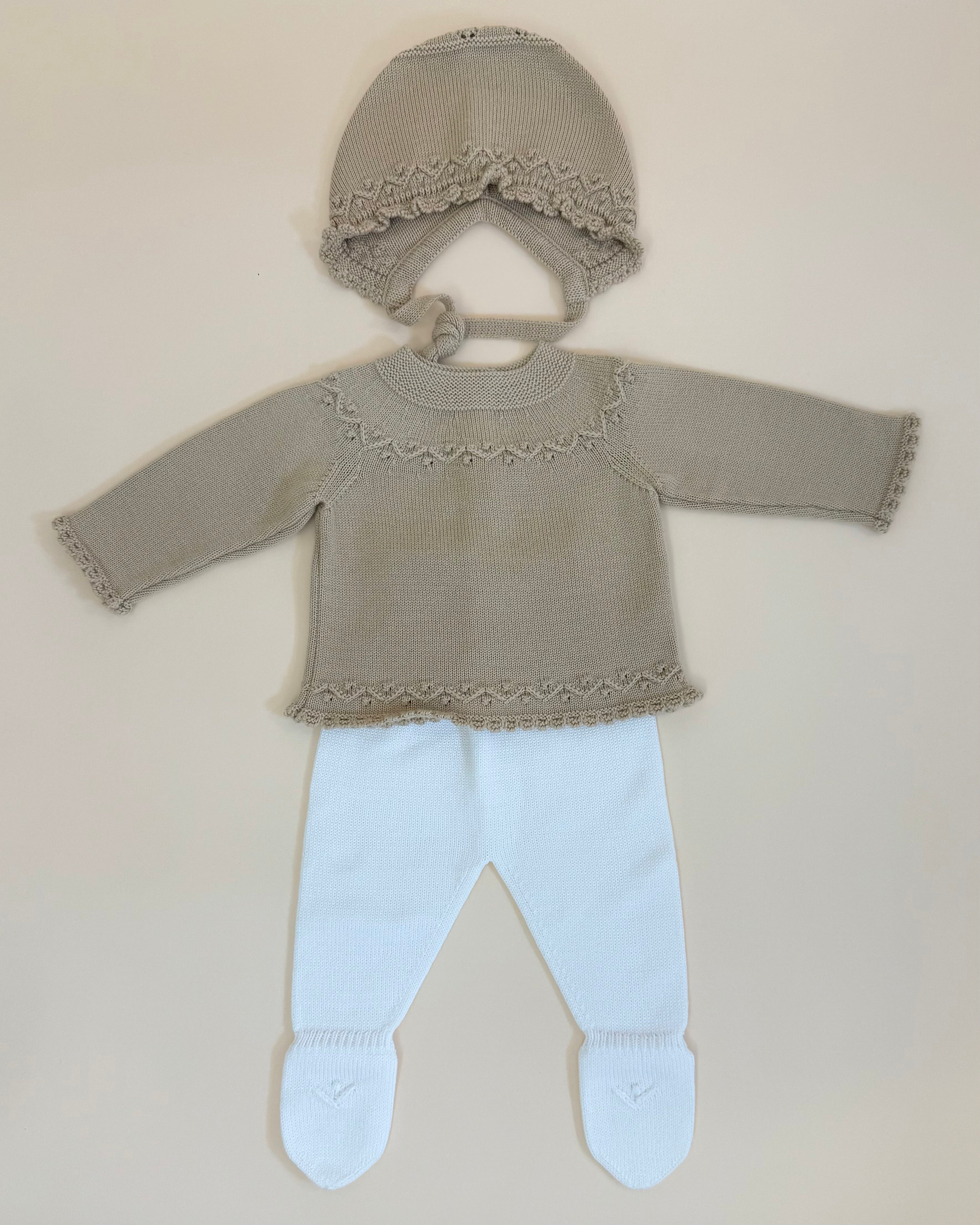 Handcrafted in Spain with exceptional care and quality, the set includes a beige knitted top with back button closure, white footed pants, and a matching beige bonnet—a perfectly coordinated ensemble designed for comfort and grace.