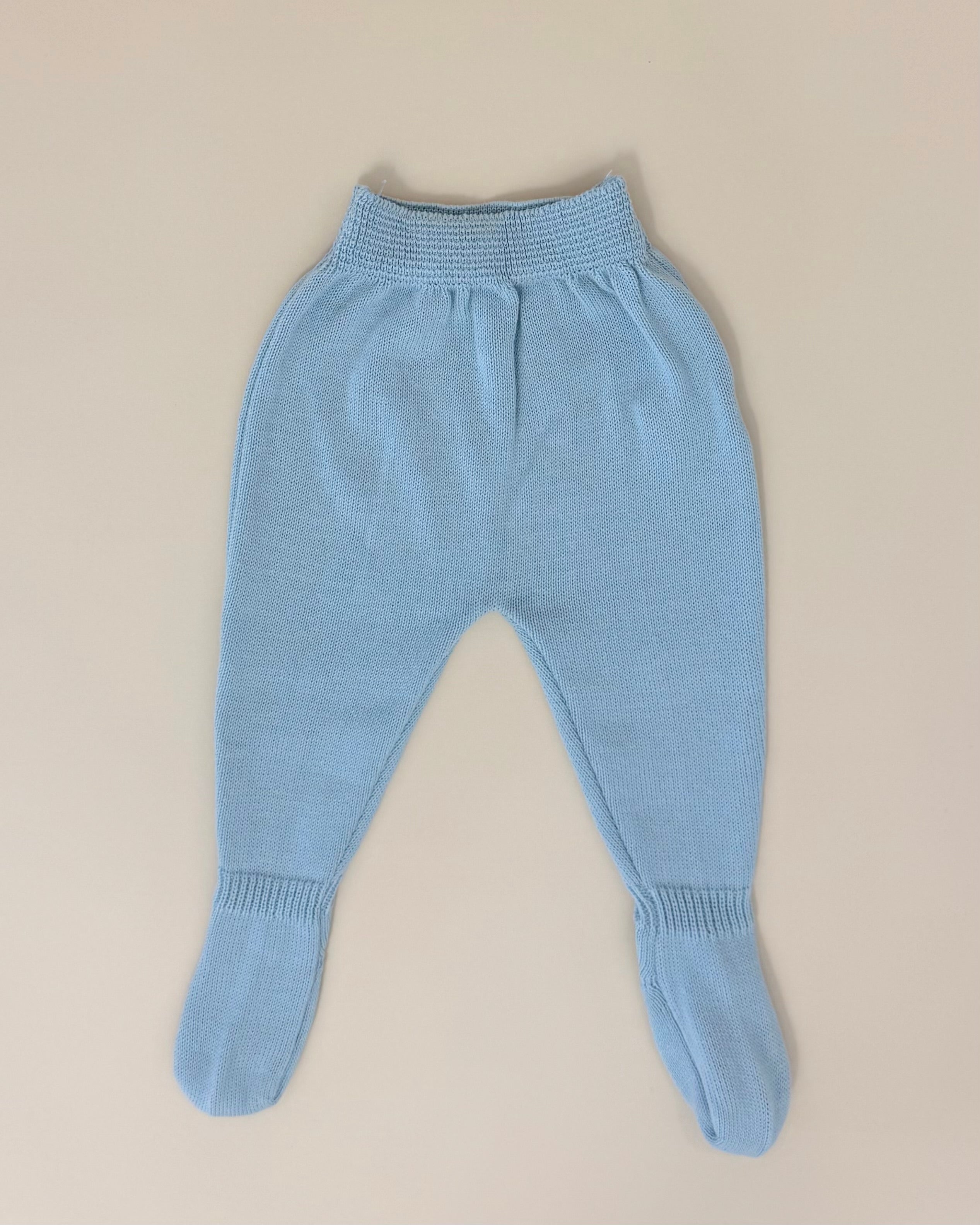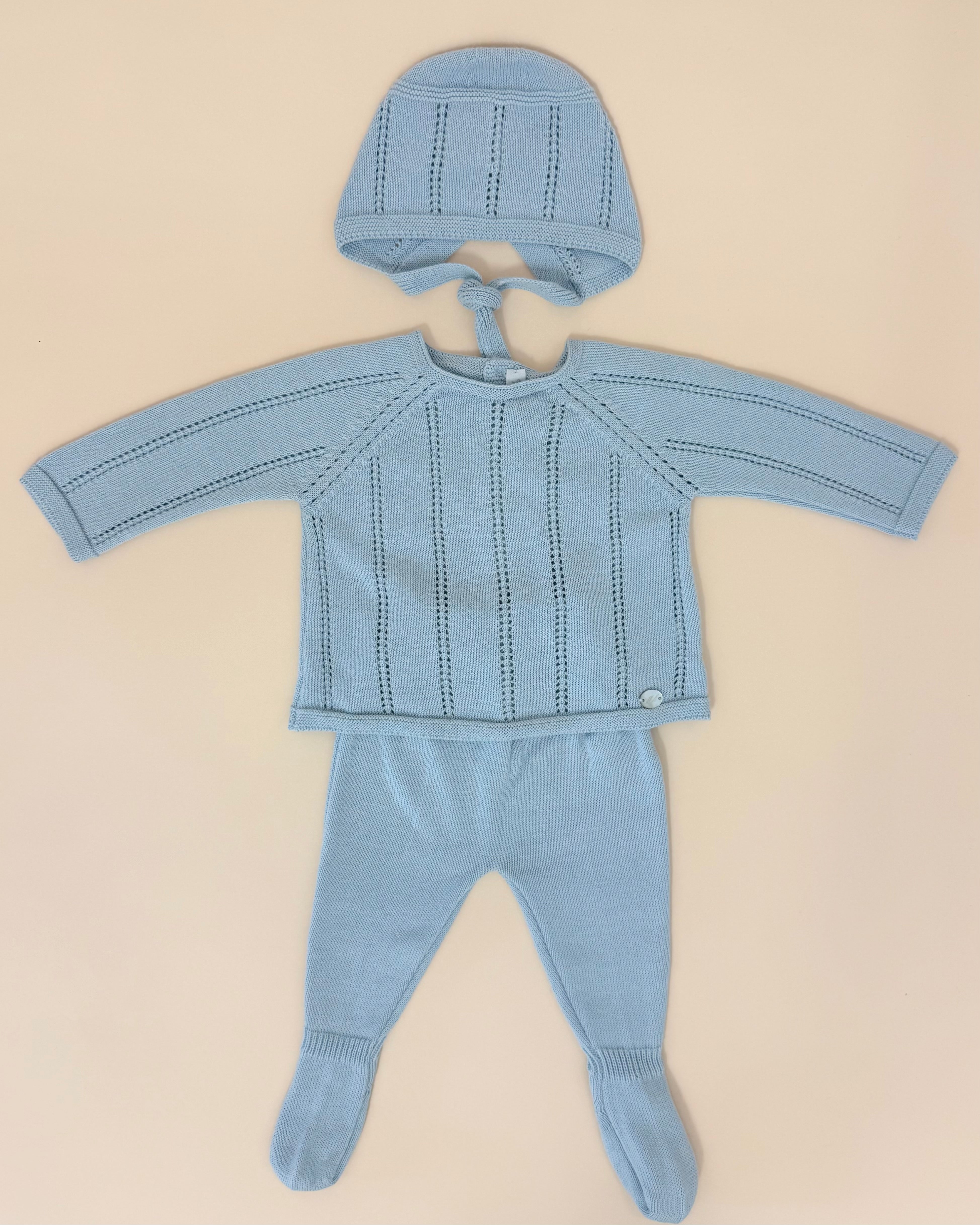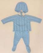 Handcrafted in Spain with exceptional attention to quality, the set includes a knitted top with back button closure, matching footed pants, and a coordinated bonnet for a classic, cohesive look.
