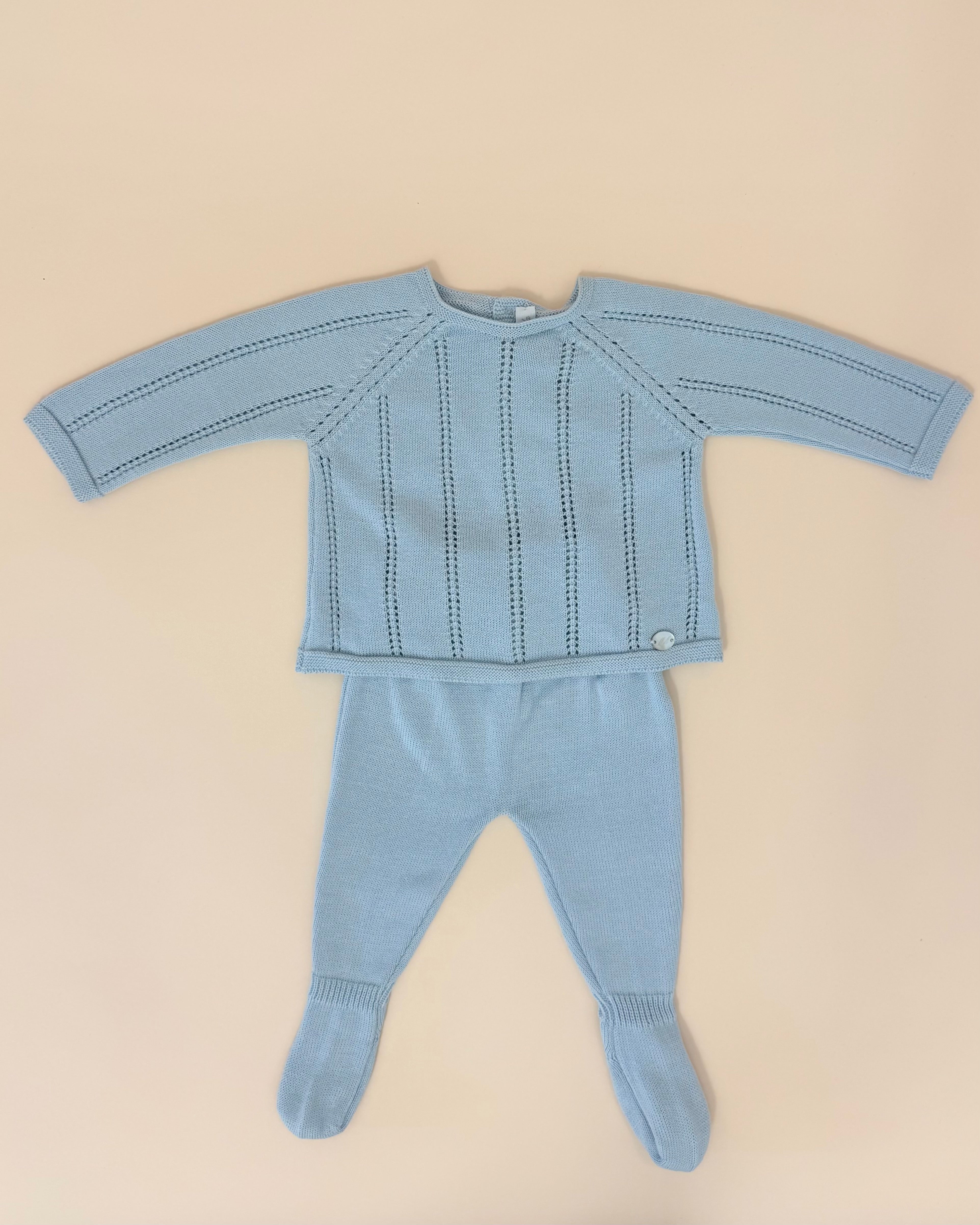 Understated and timeless, this cadet grey knitted outfit is a beautifully minimalist and traditional choice for welcoming your baby boy in style and comfort.