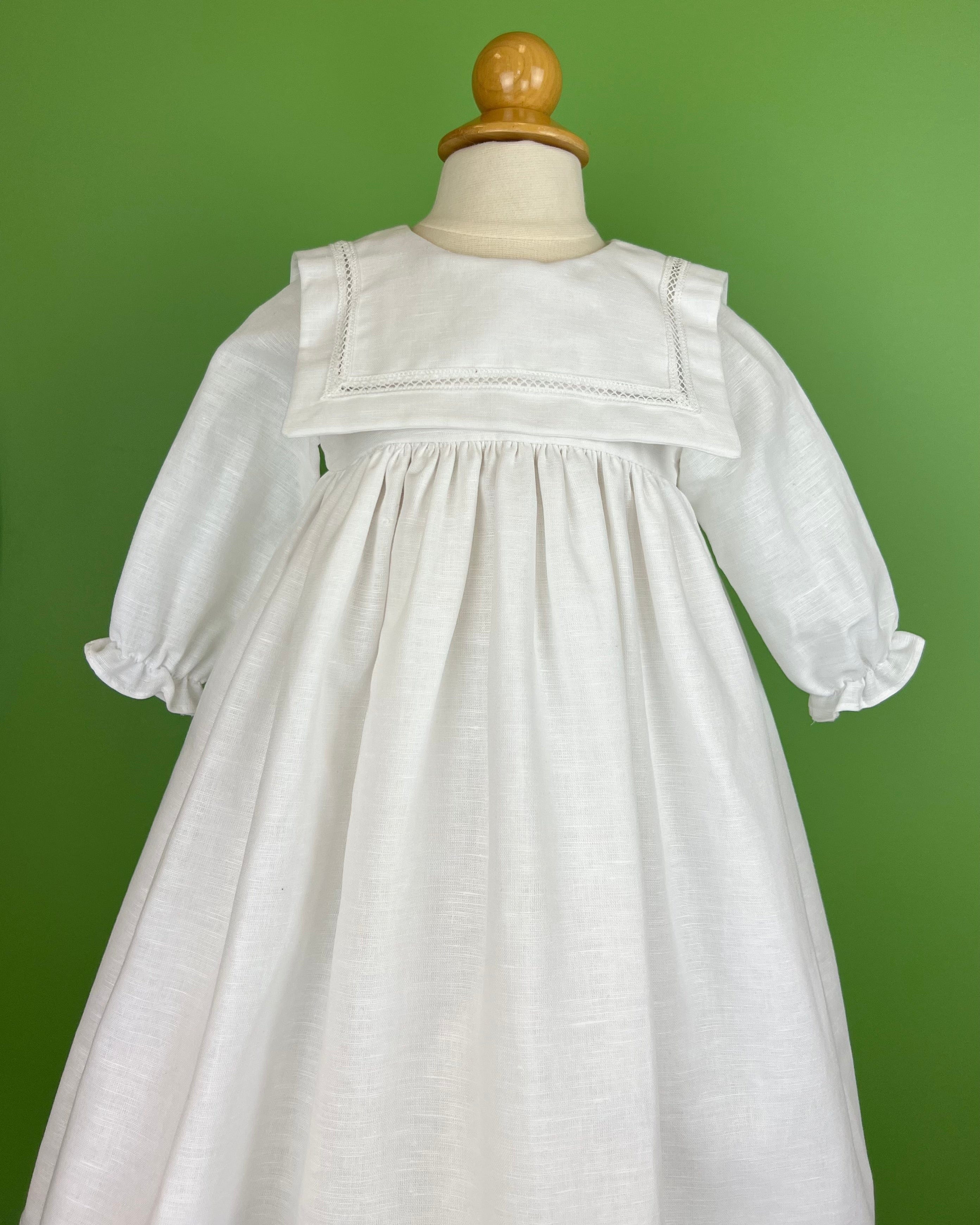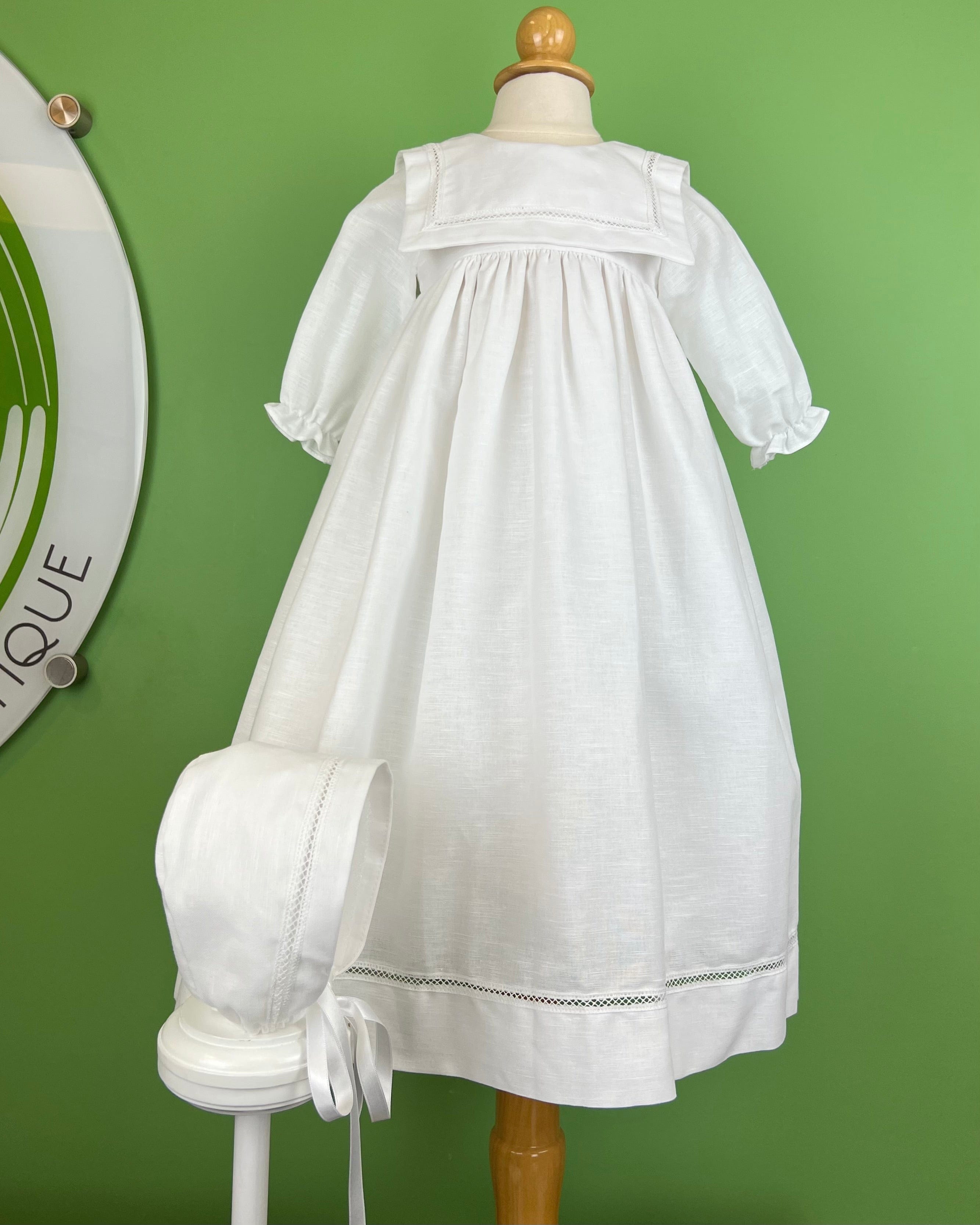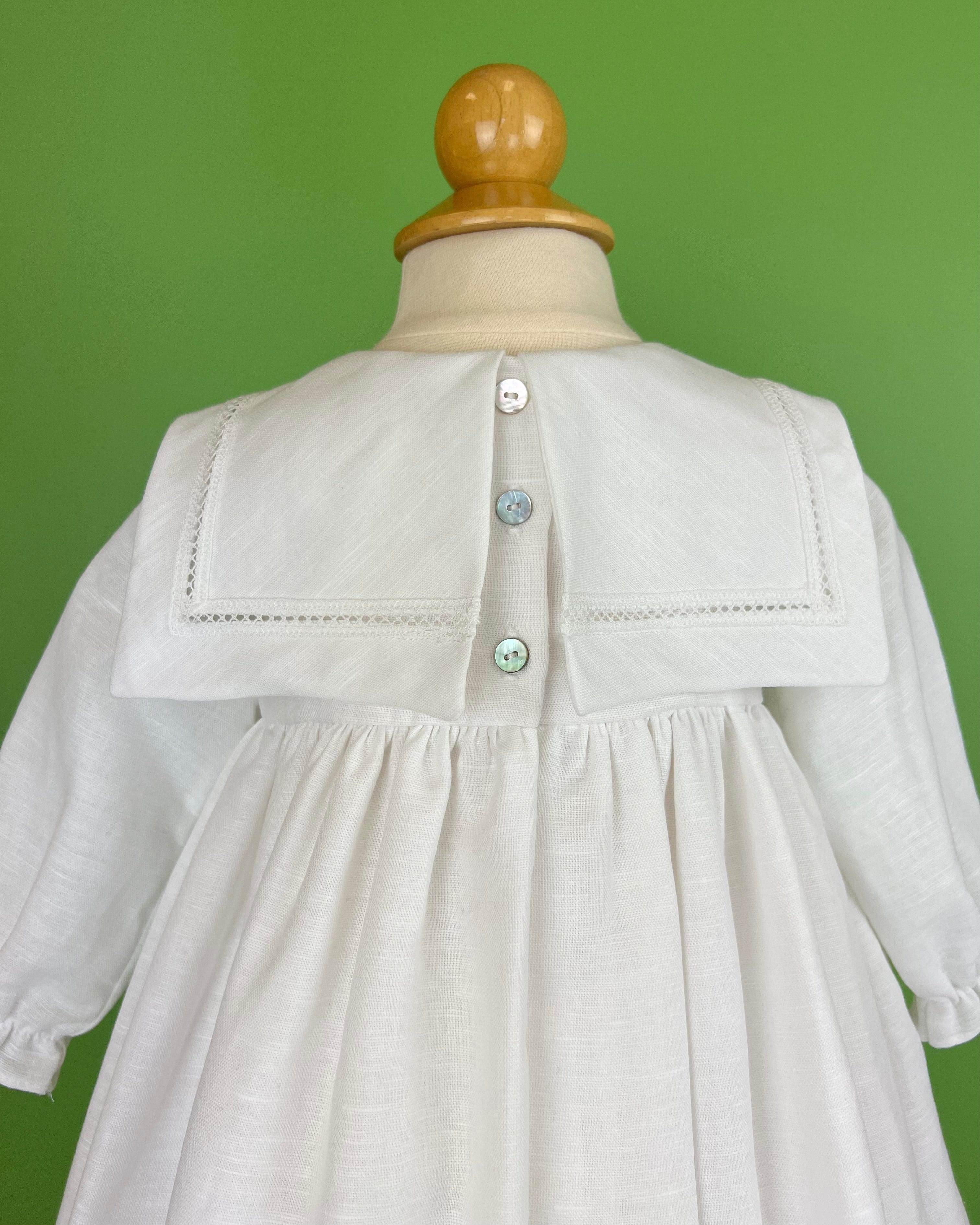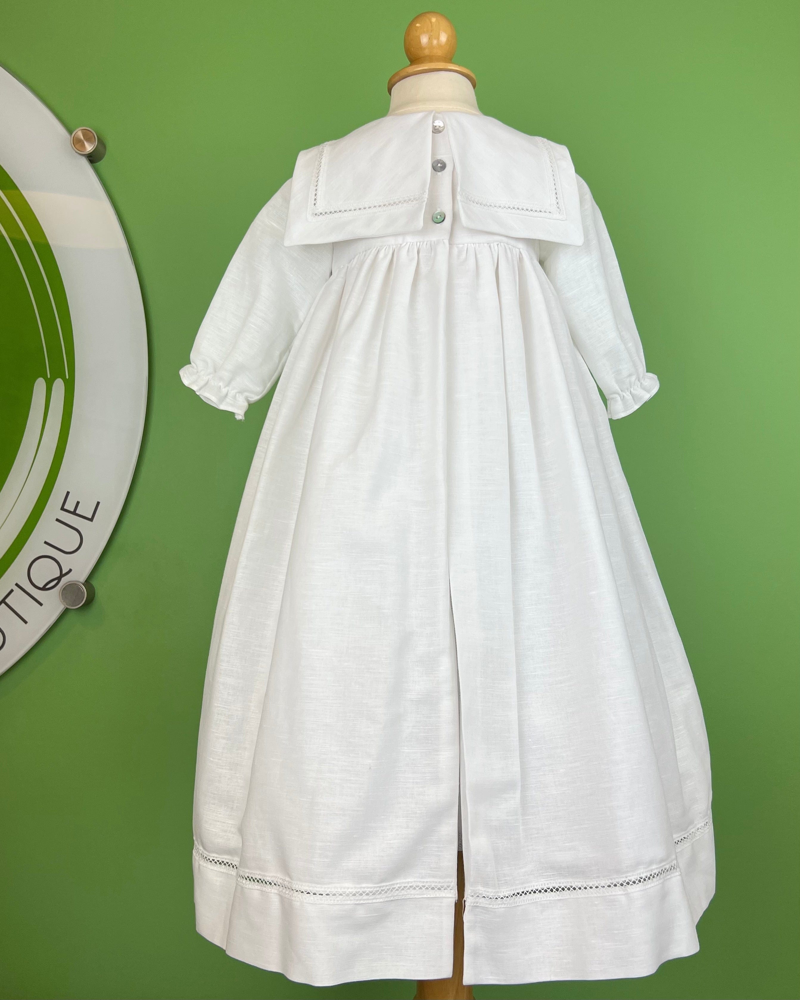 White linen christening gown. The gown has a square bib-like on the chest and a very minimalistic design overall, ideal for baby boys. The gown has buttons on the back for closure and the skirt is open at the back to be able to hold the little one more comfortably. Includes bonnet.