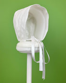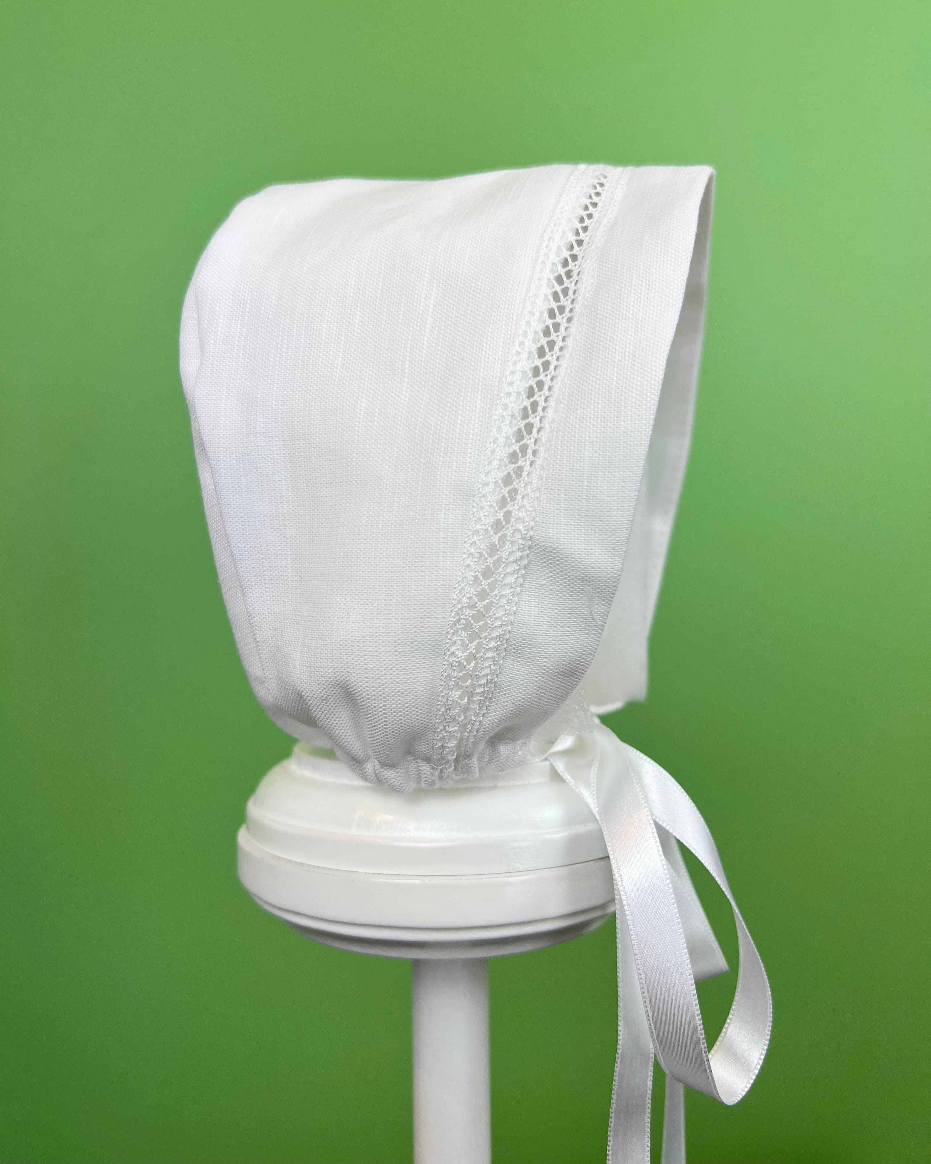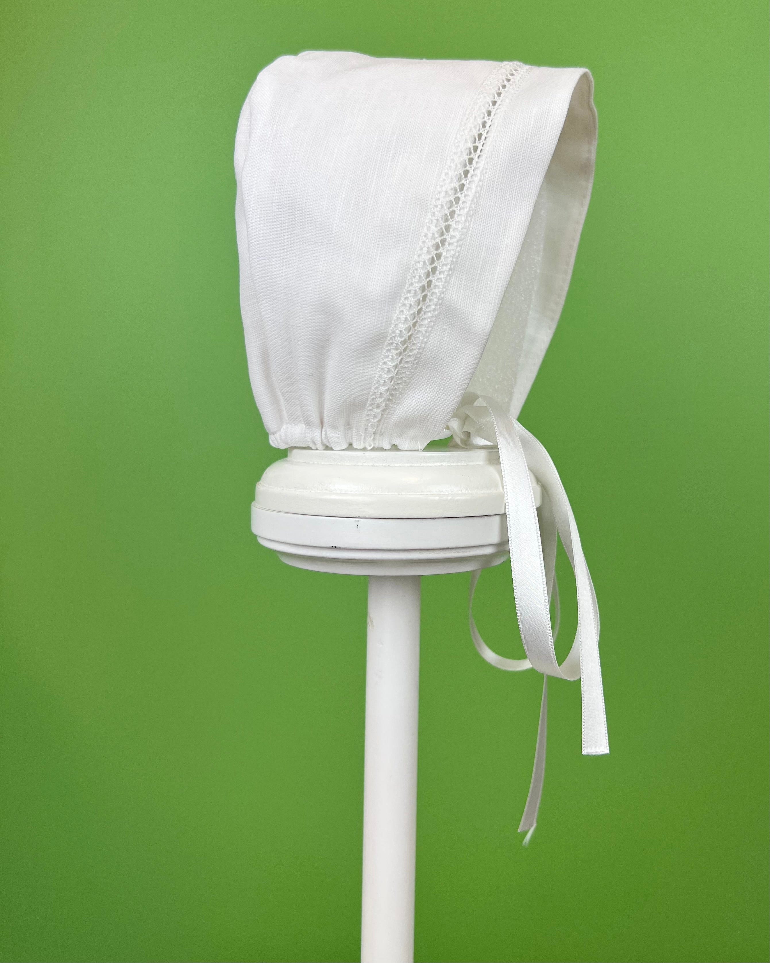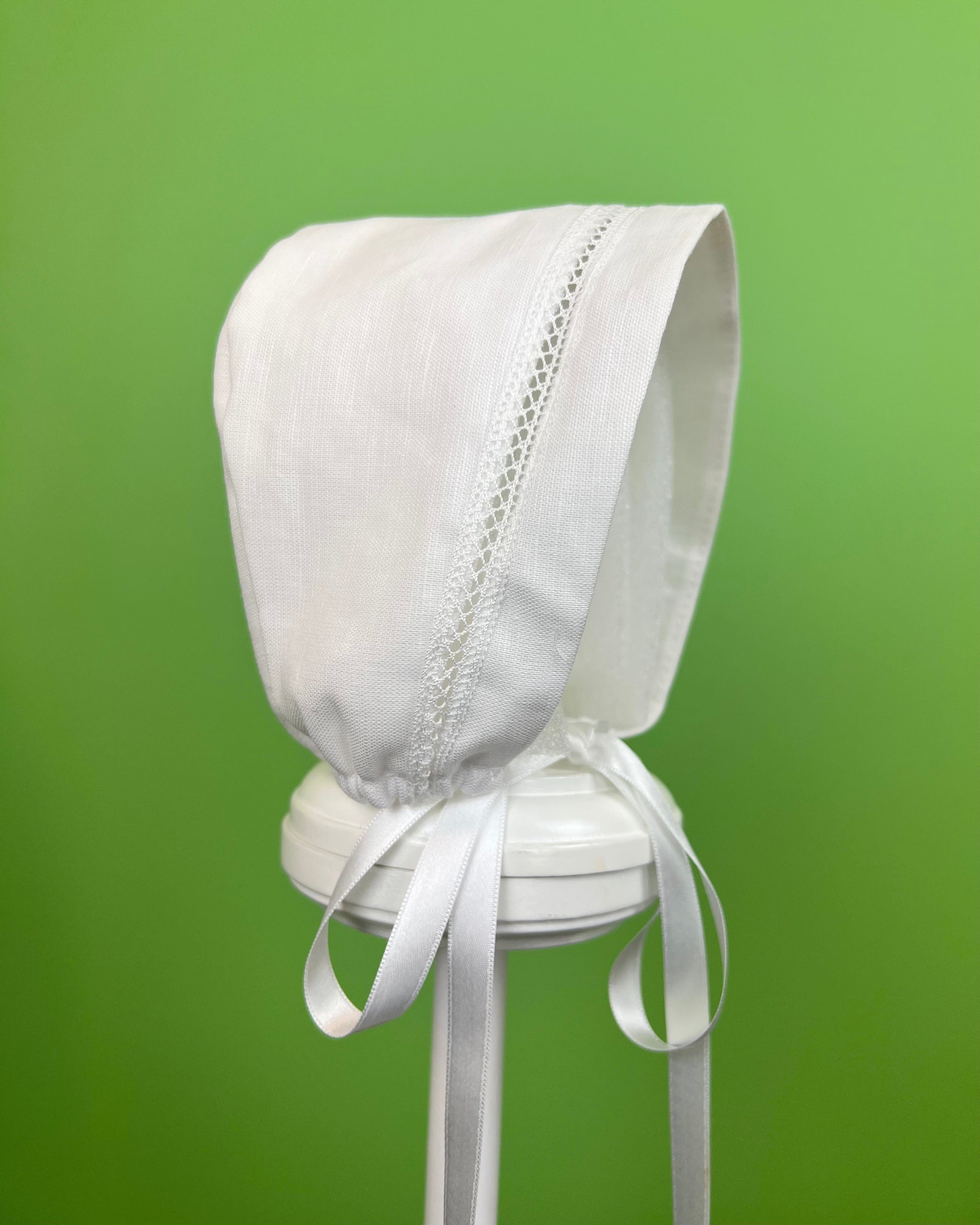 White linen christening gown. The gown has a square bib-like on the chest and a very minimalistic design overall, ideal for baby boys. The gown has buttons on the back for closure and the skirt is open at the back to be able to hold the little one more comfortably. Includes bonnet.