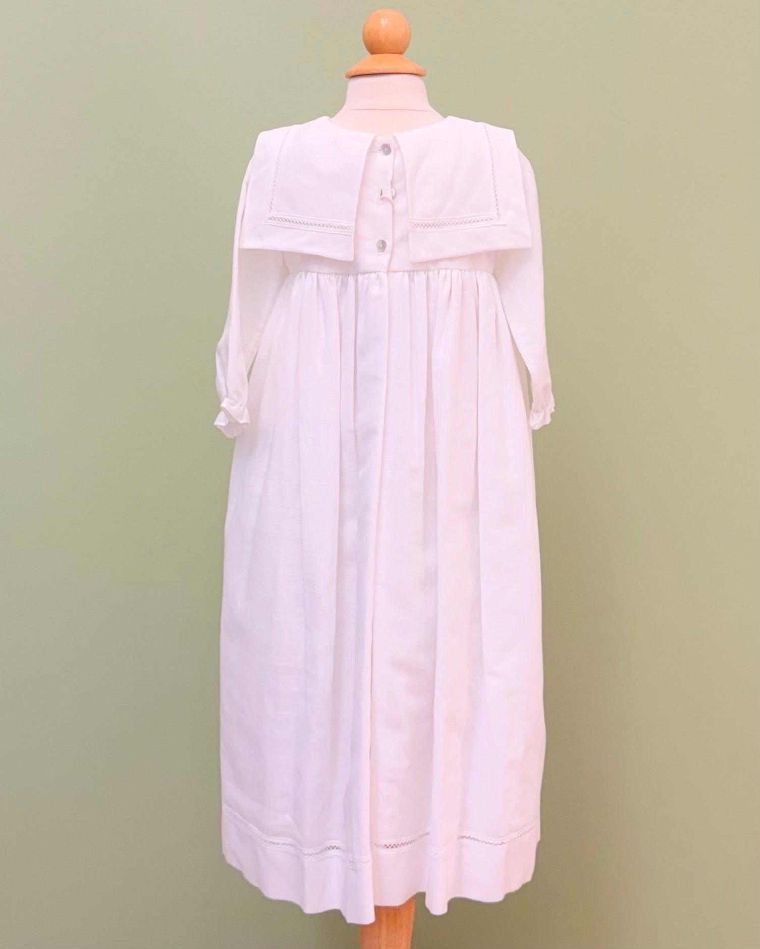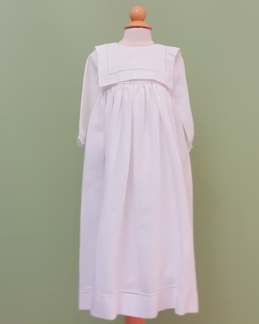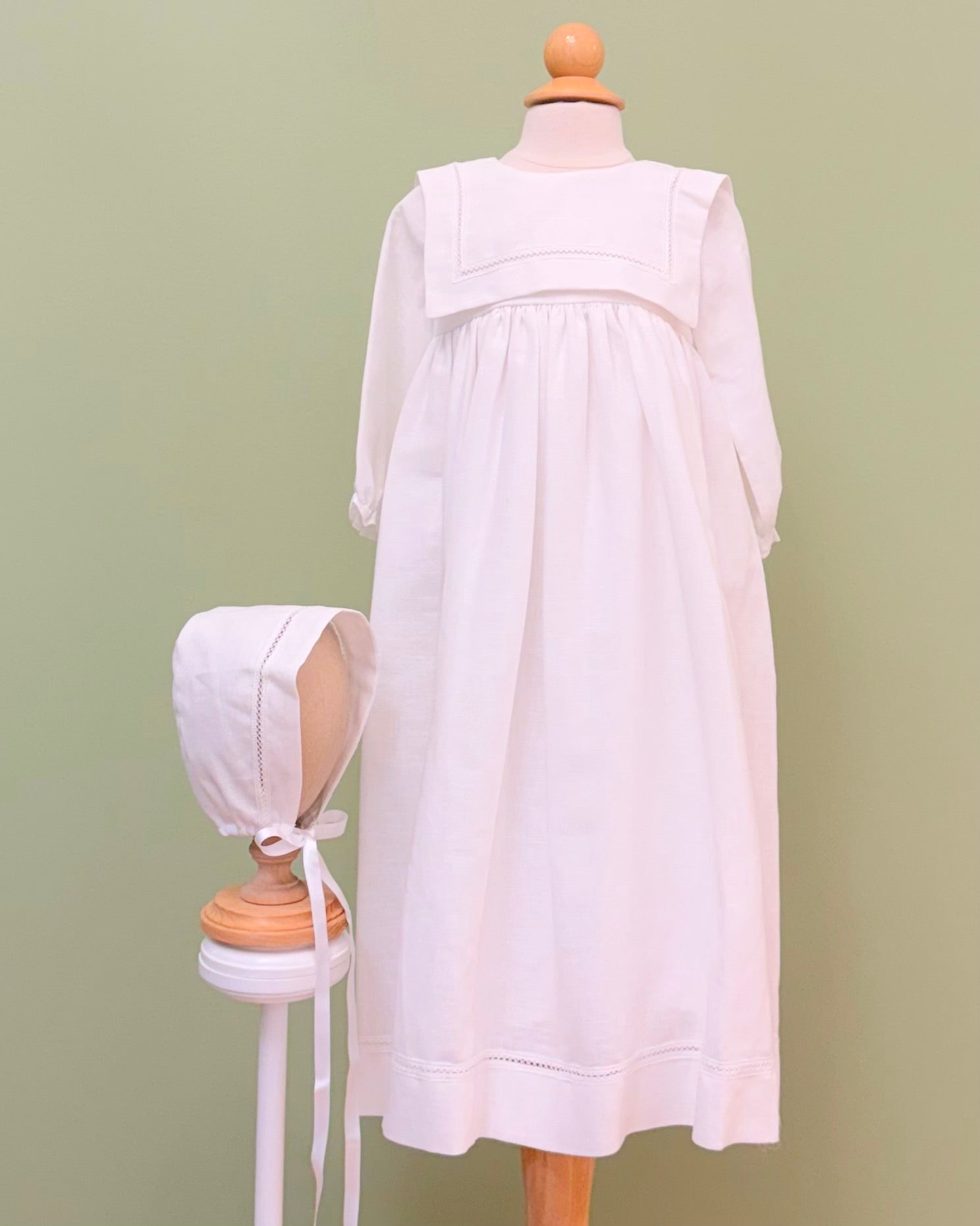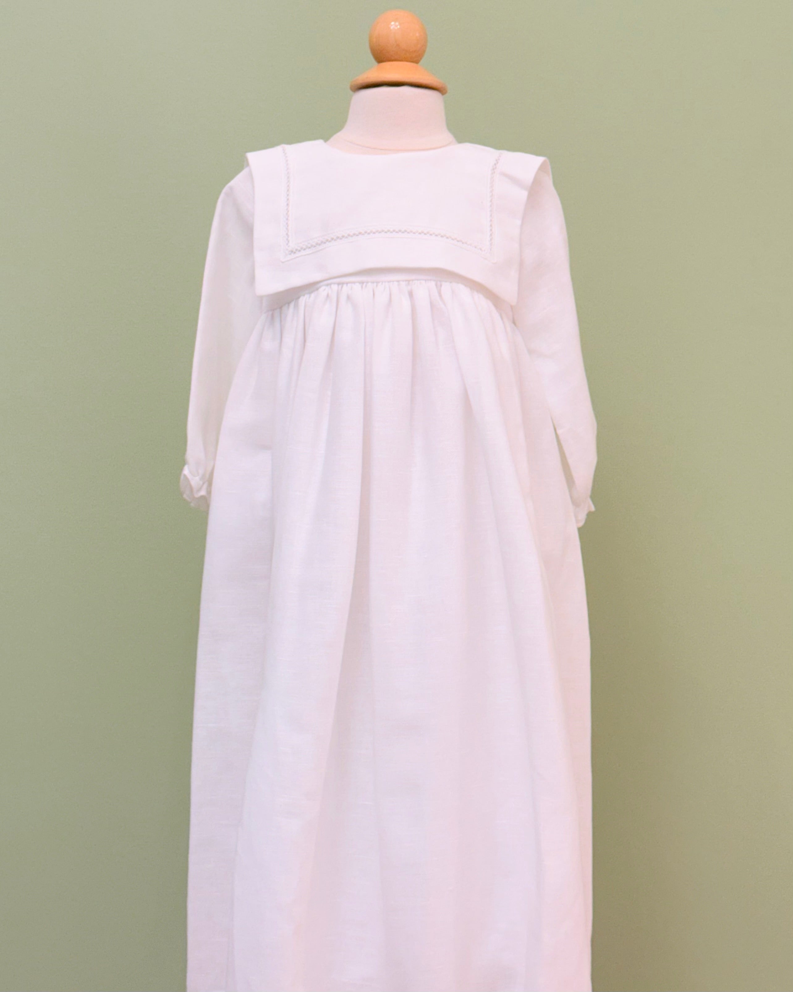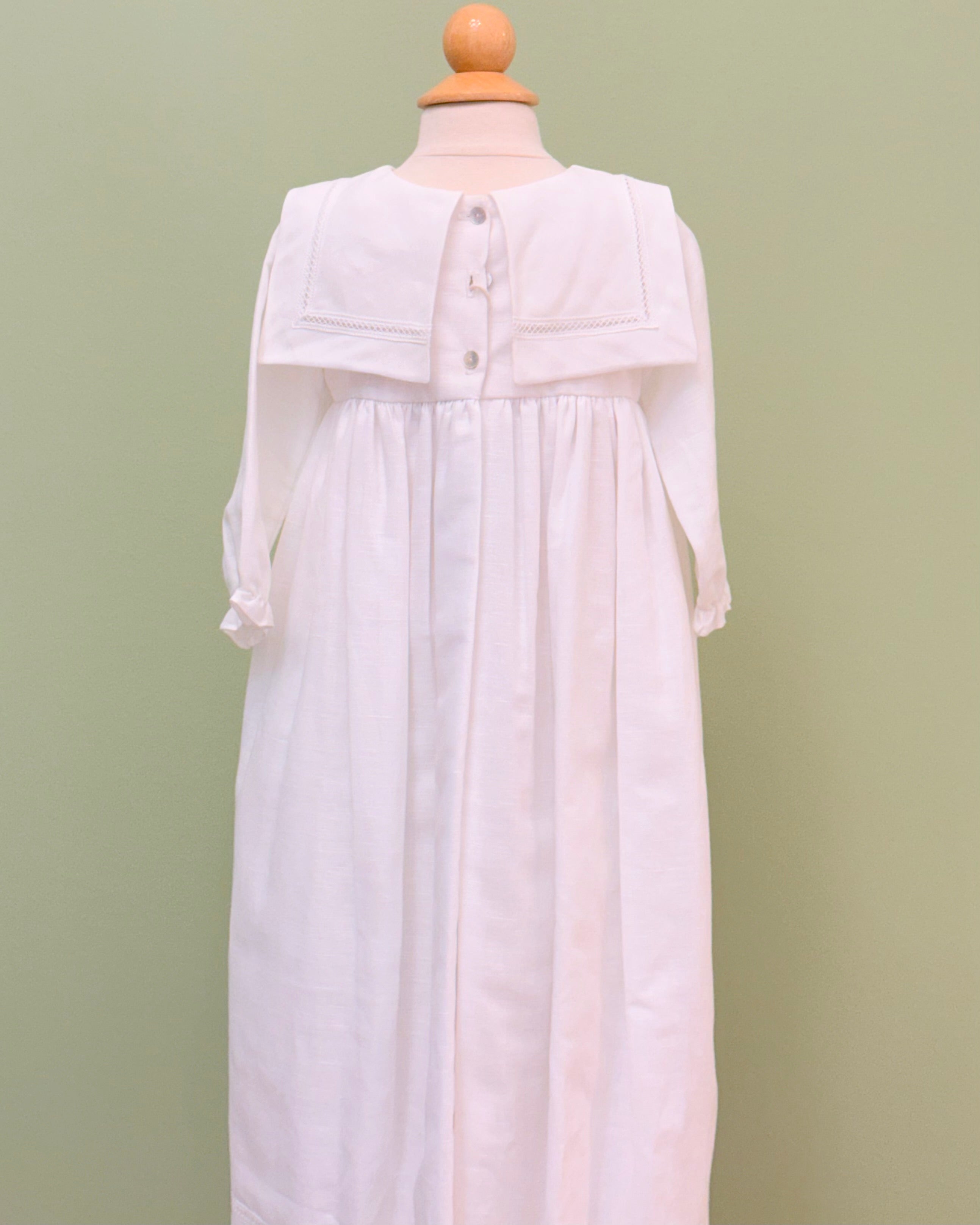 White linen christening gown. The gown has a square bib-like on the chest and a very minimalistic design overall, ideal for baby boys. The gown has buttons on the back for closure and the skirt is open at the back to be able to hold the little one more comfortably. Includes bonnet.