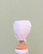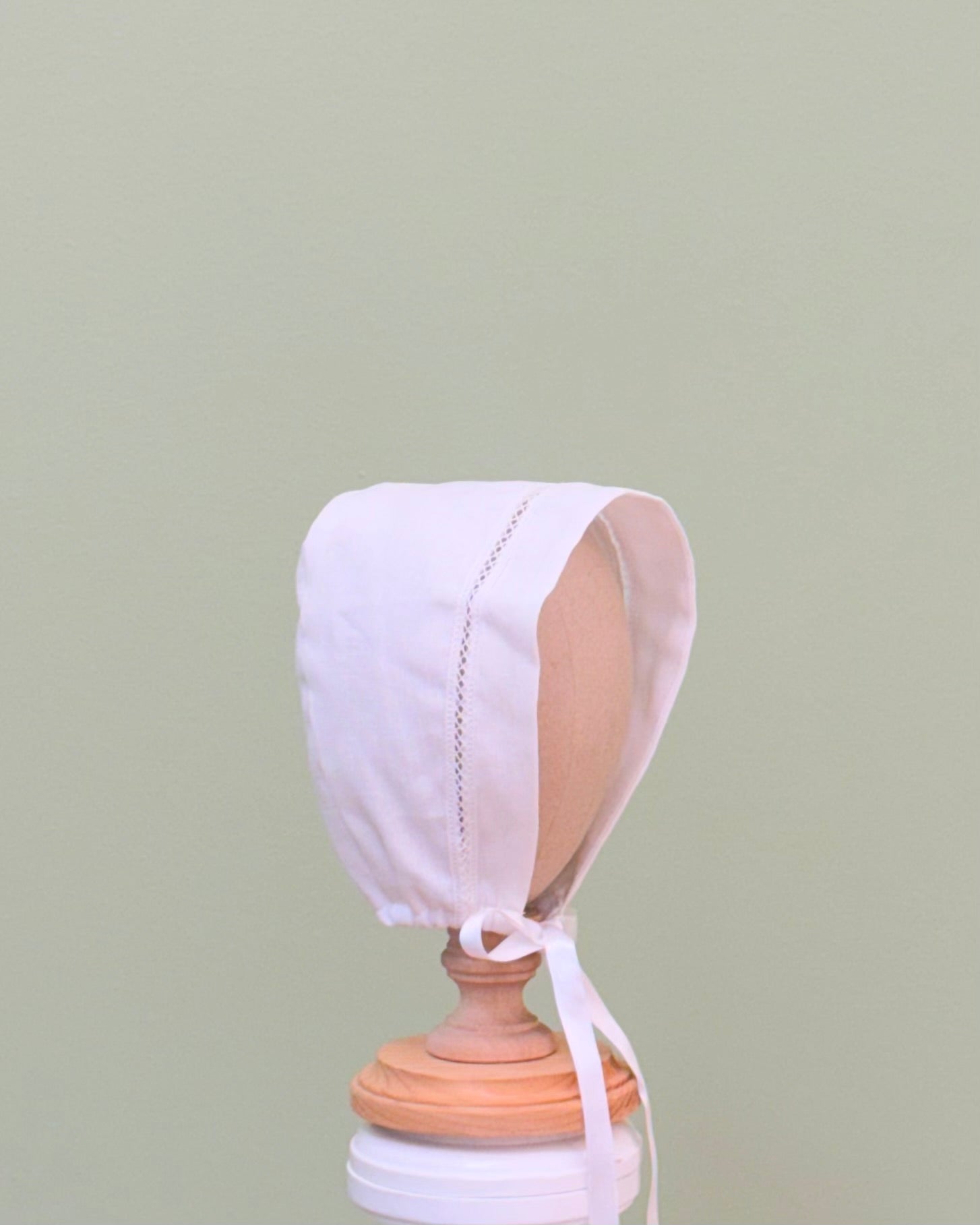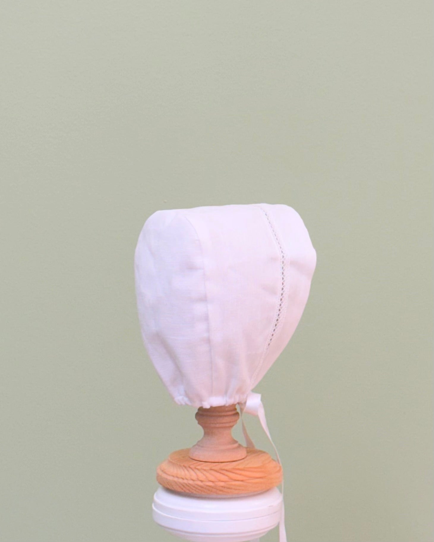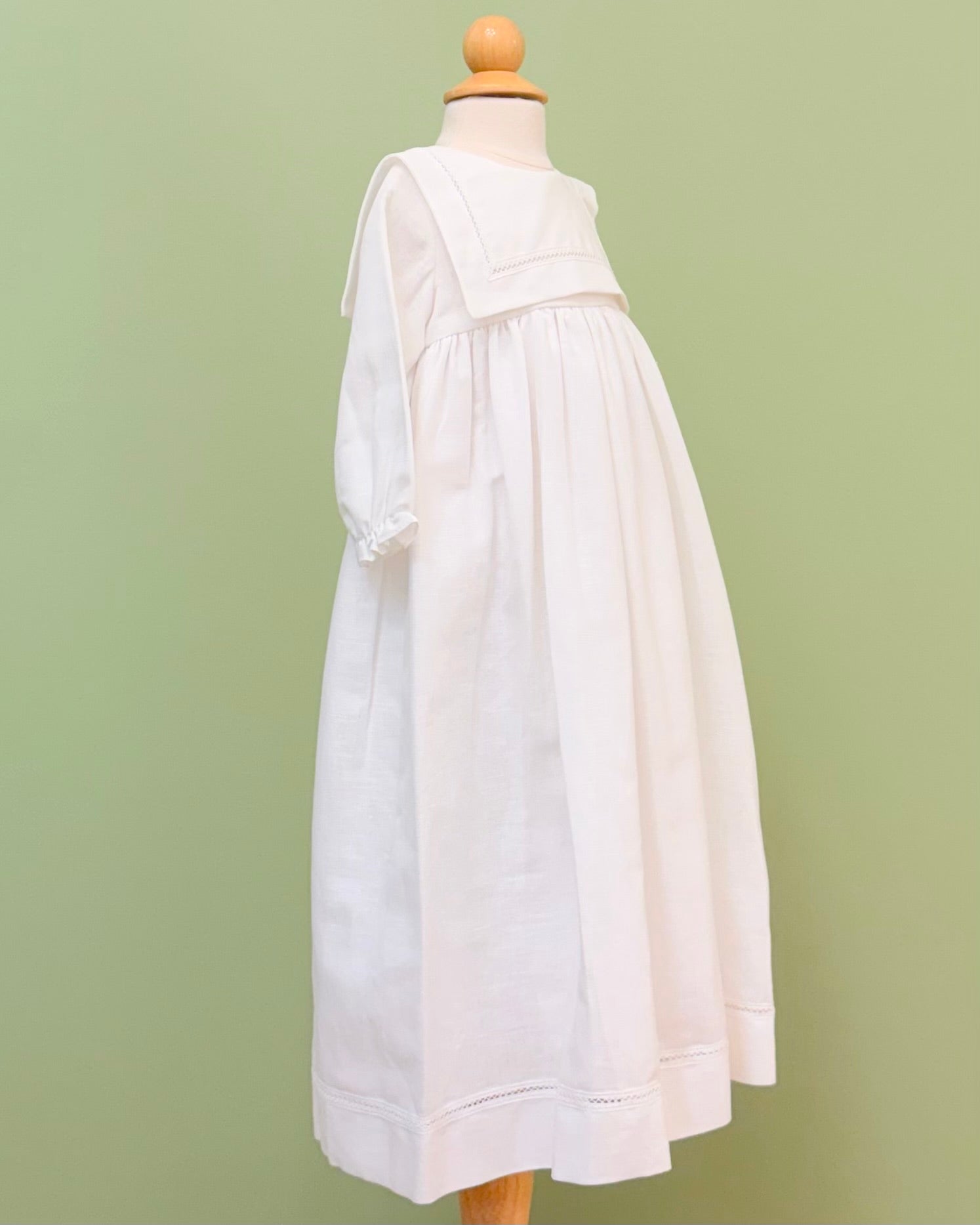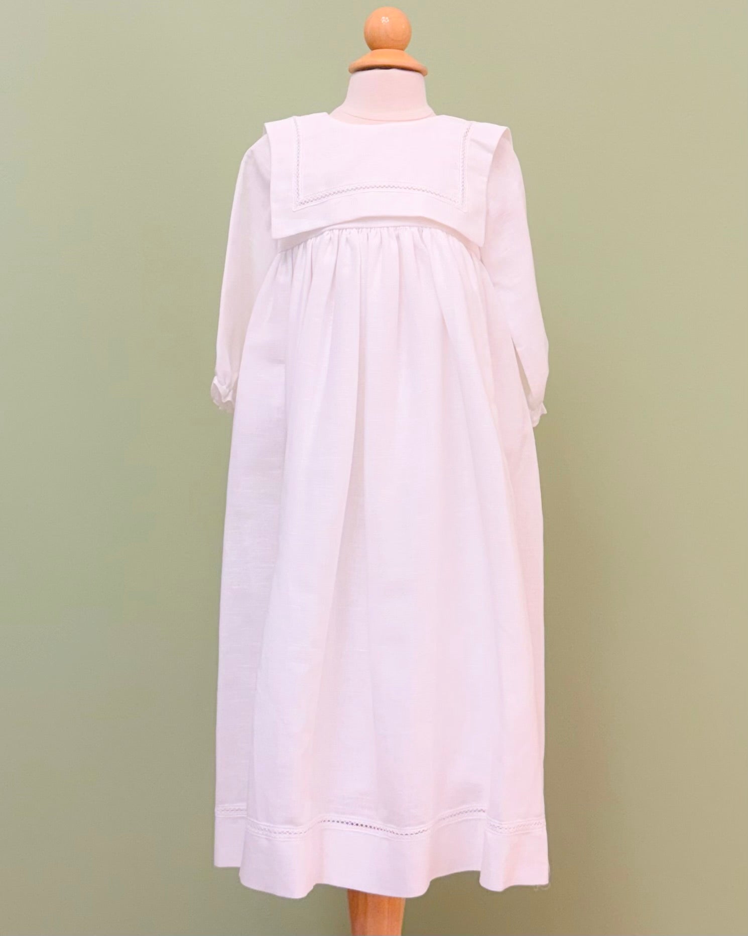 White linen christening gown. The gown has a square bib-like on the chest and a very minimalistic design overall, ideal for baby boys. The gown has buttons on the back for closure and the skirt is open at the back to be able to hold the little one more comfortably. Includes bonnet.