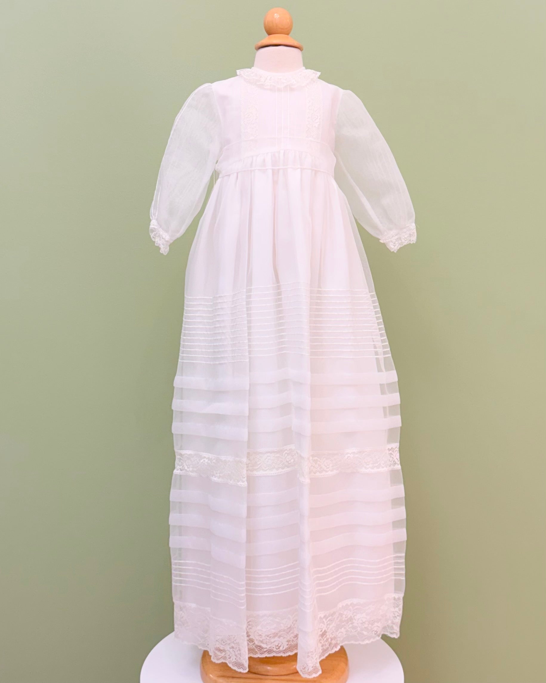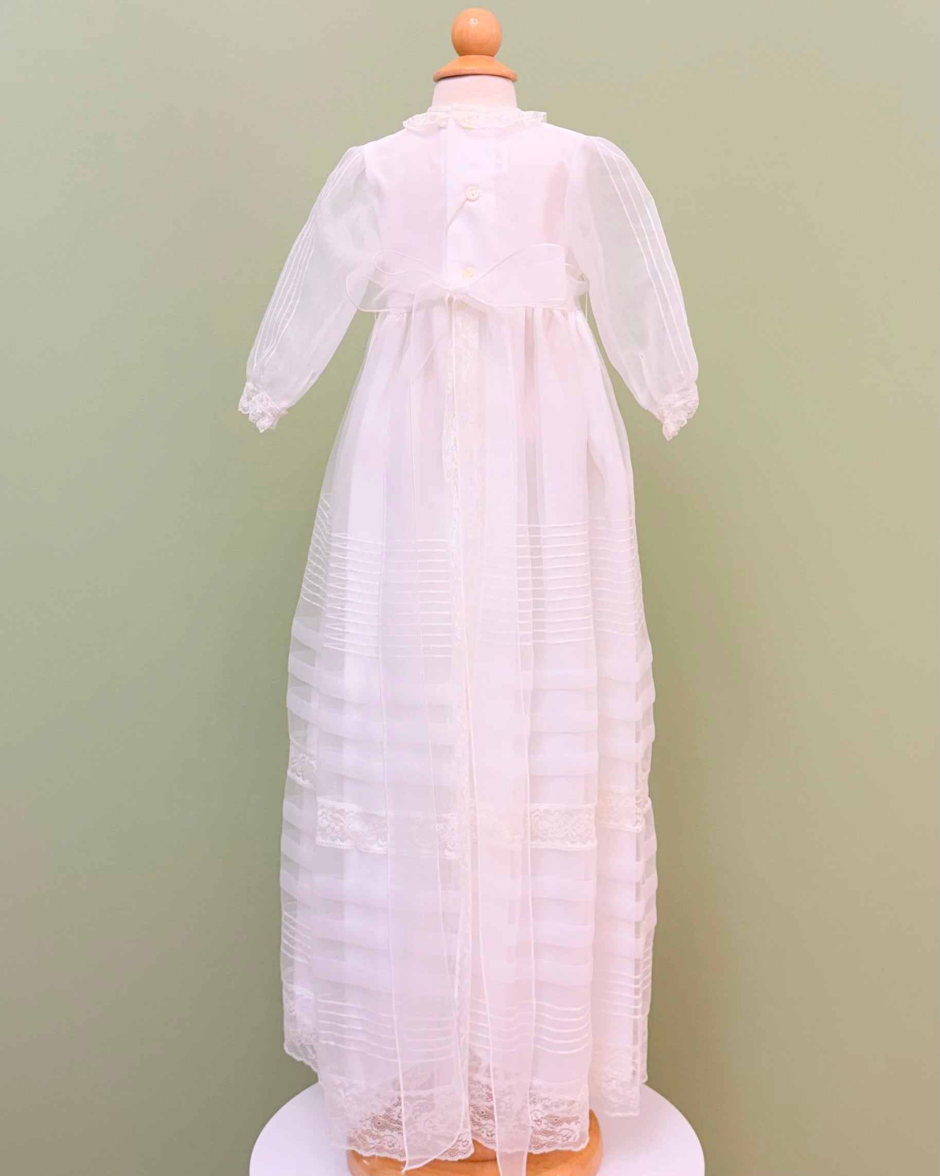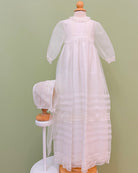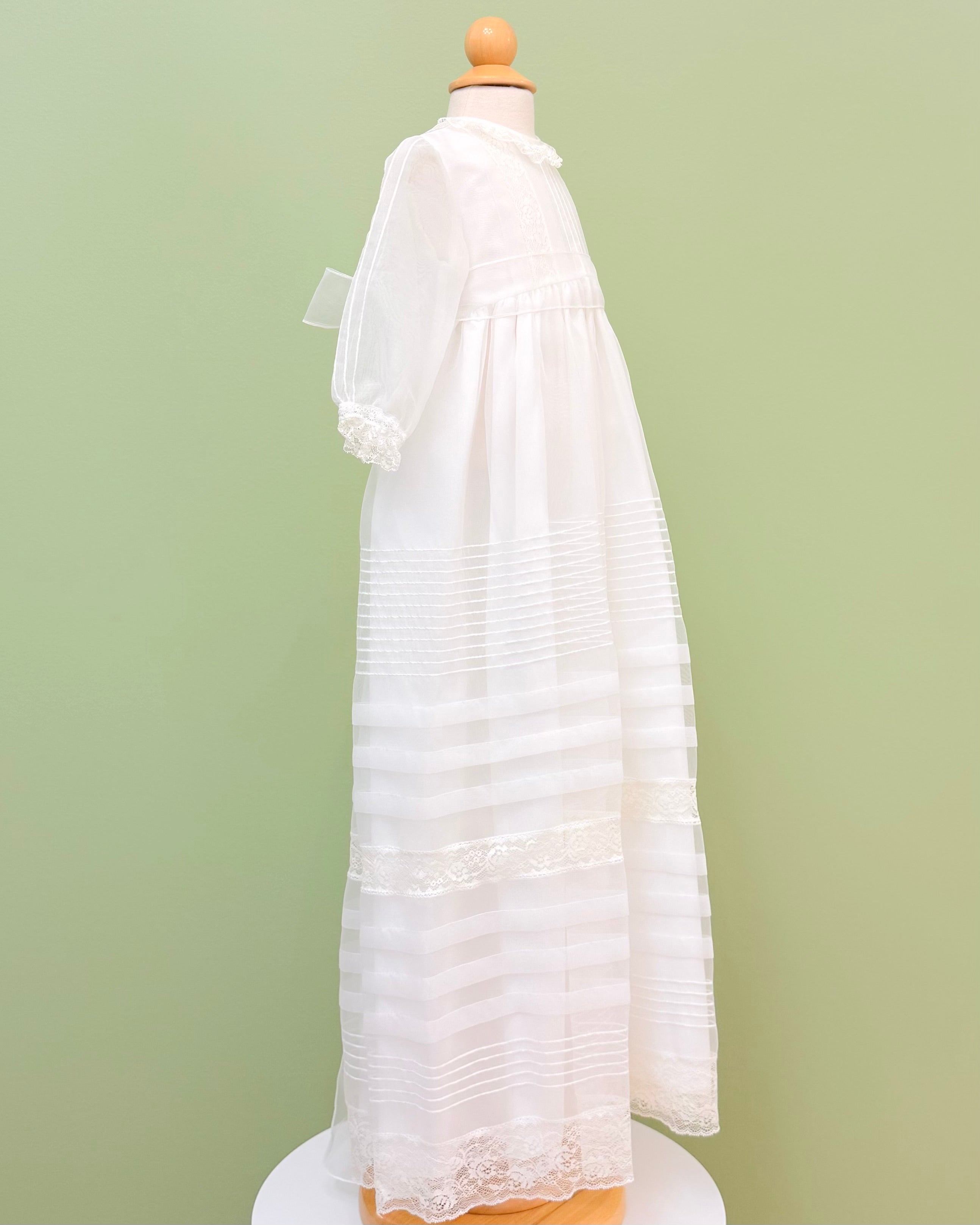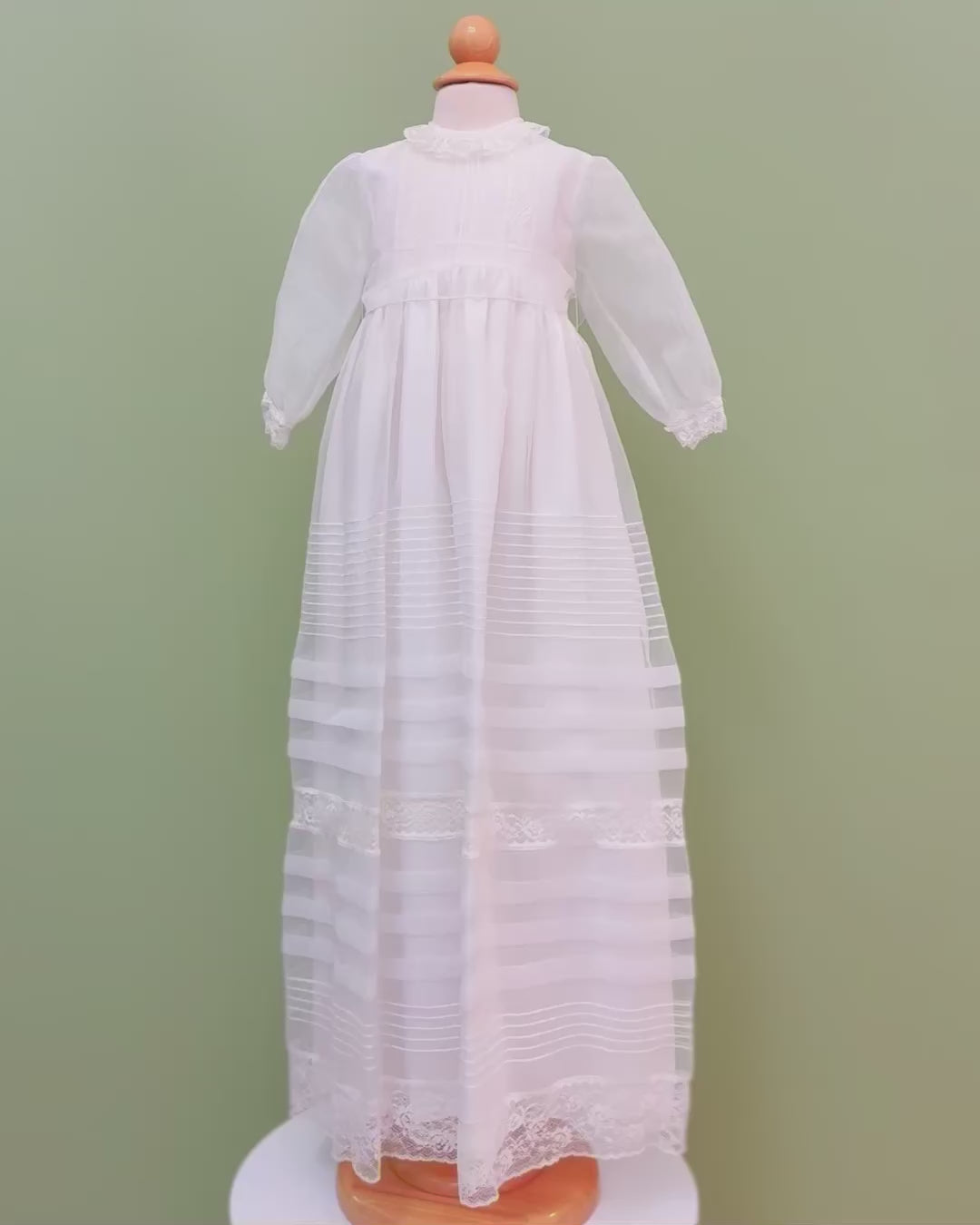 Pamplona is a delicate and traditional christening gown made with white organza and laces. It has beautiful pleats and lace details throughout, and an organza string which can form a bow or be removed. It comes with matching bonnet. It is gender neutral.