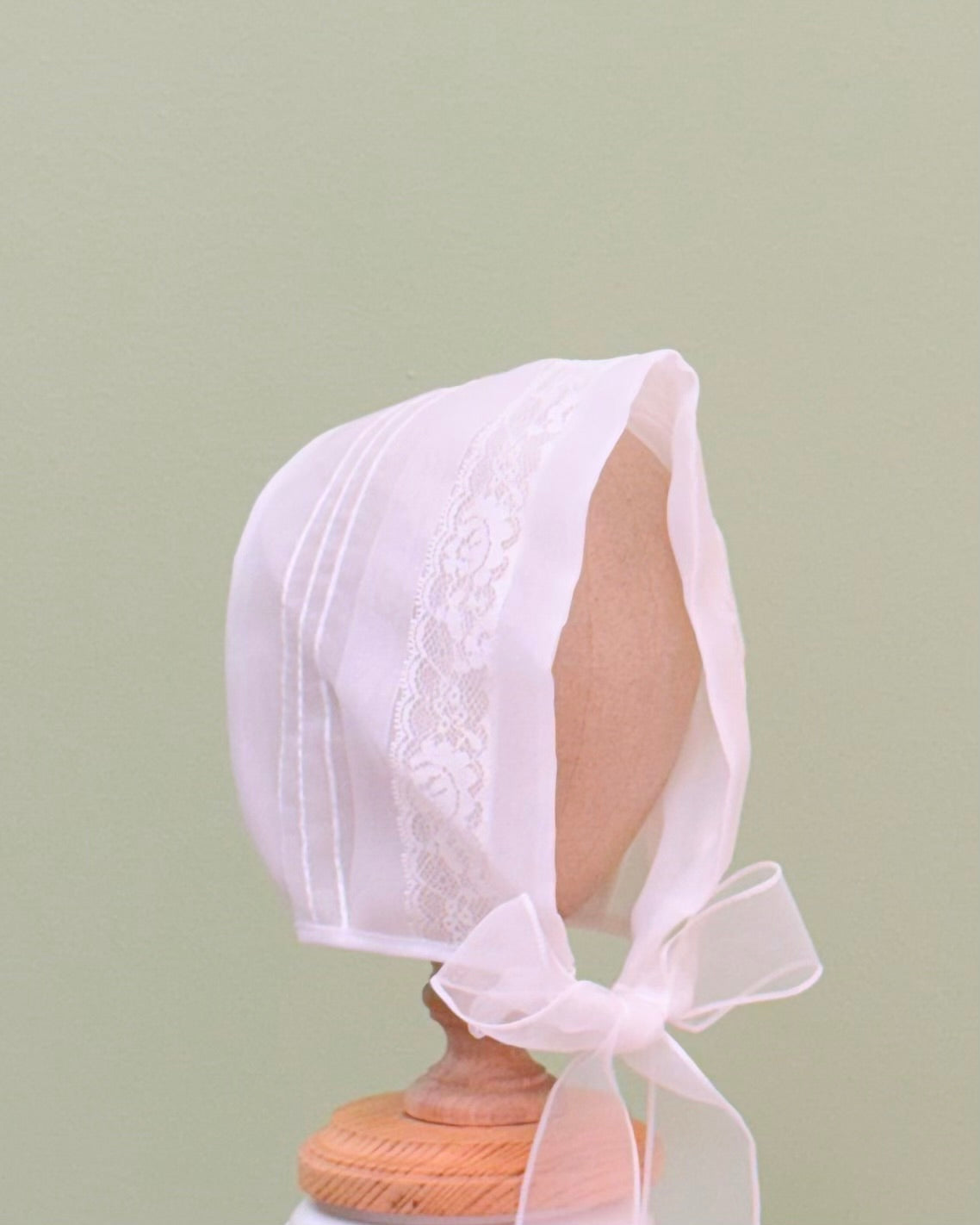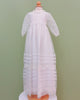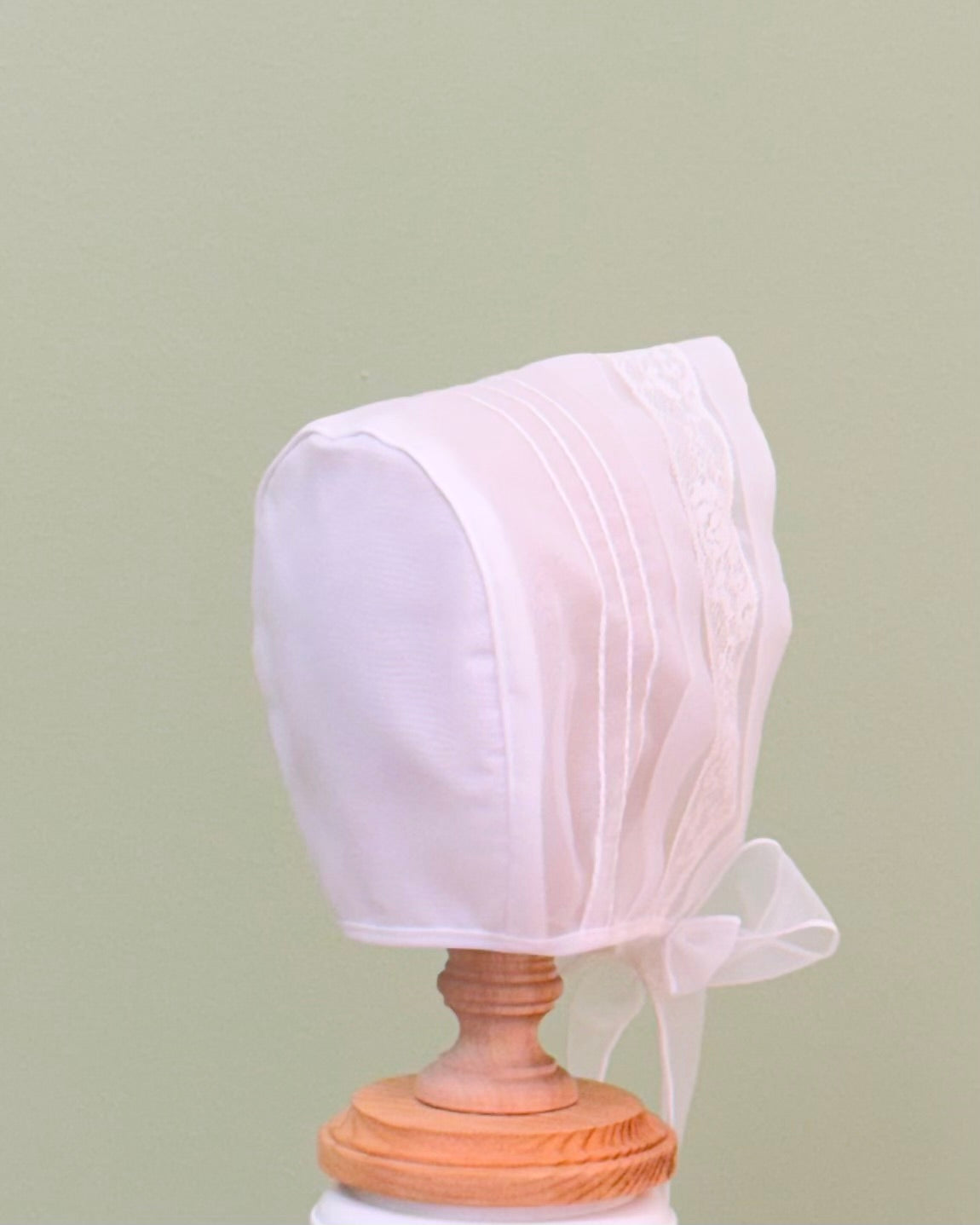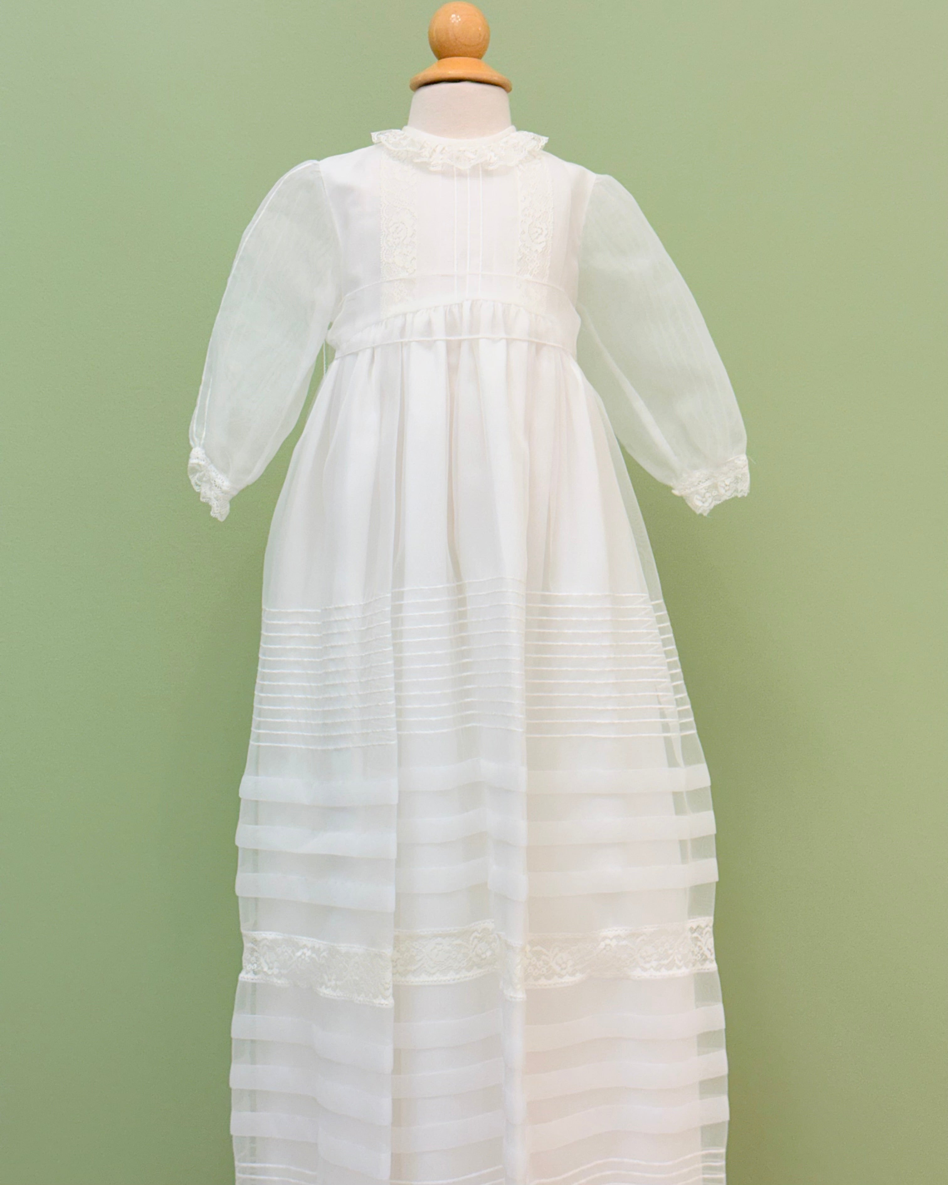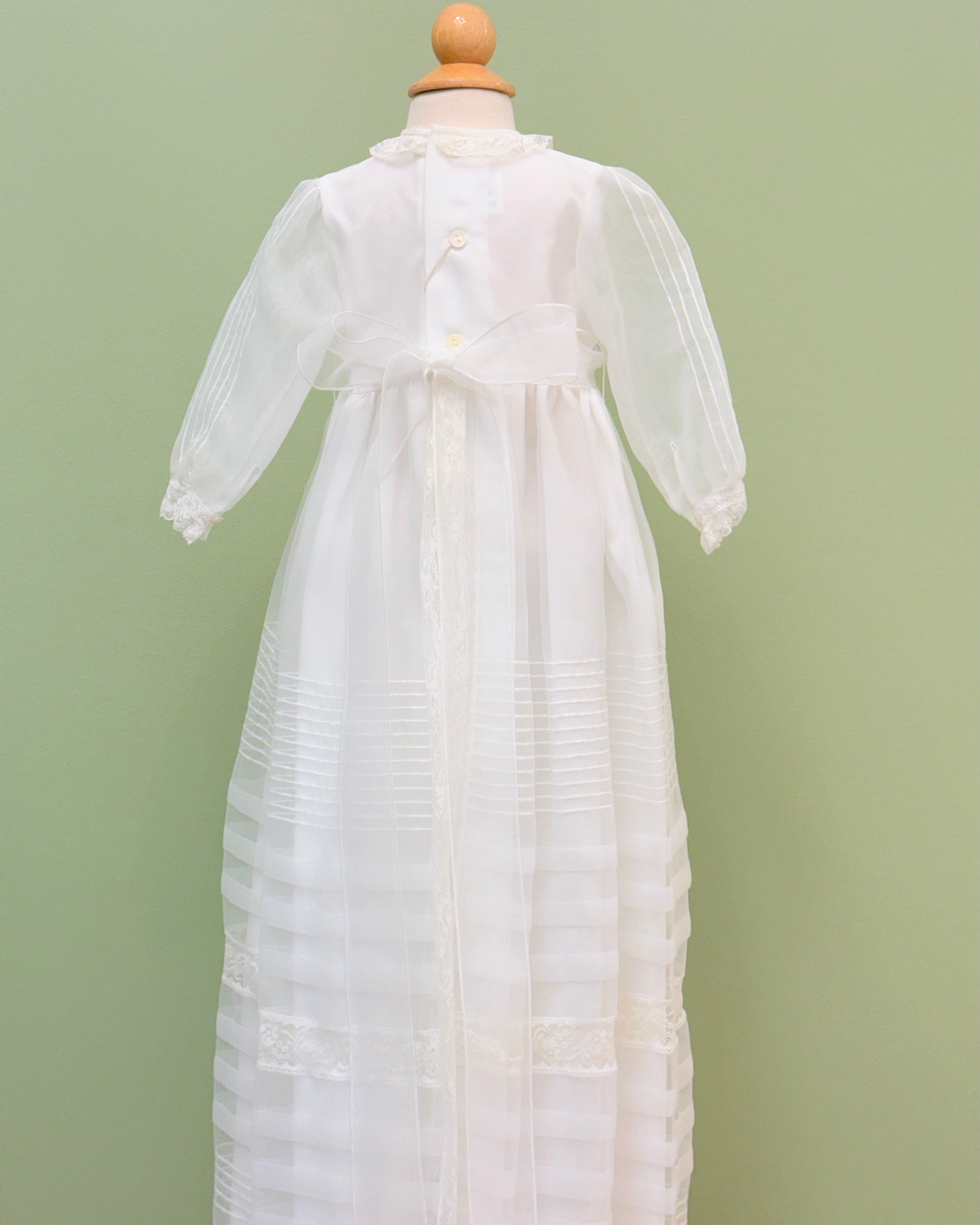 Pamplona is a delicate and traditional christening gown made with white organza and laces. It has beautiful pleats and lace details throughout, and an organza string which can form a bow or be removed. It comes with matching bonnet. It is gender neutral.