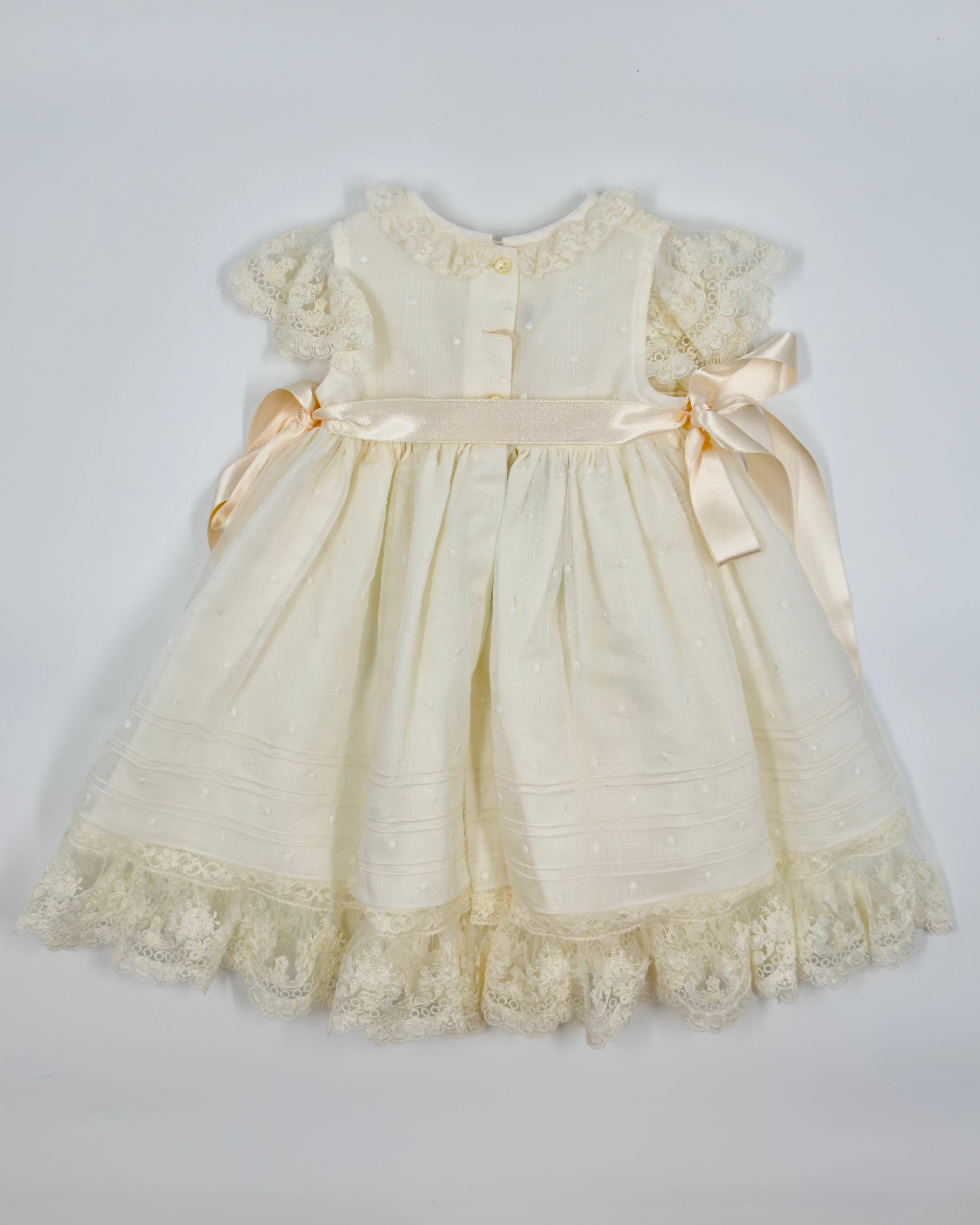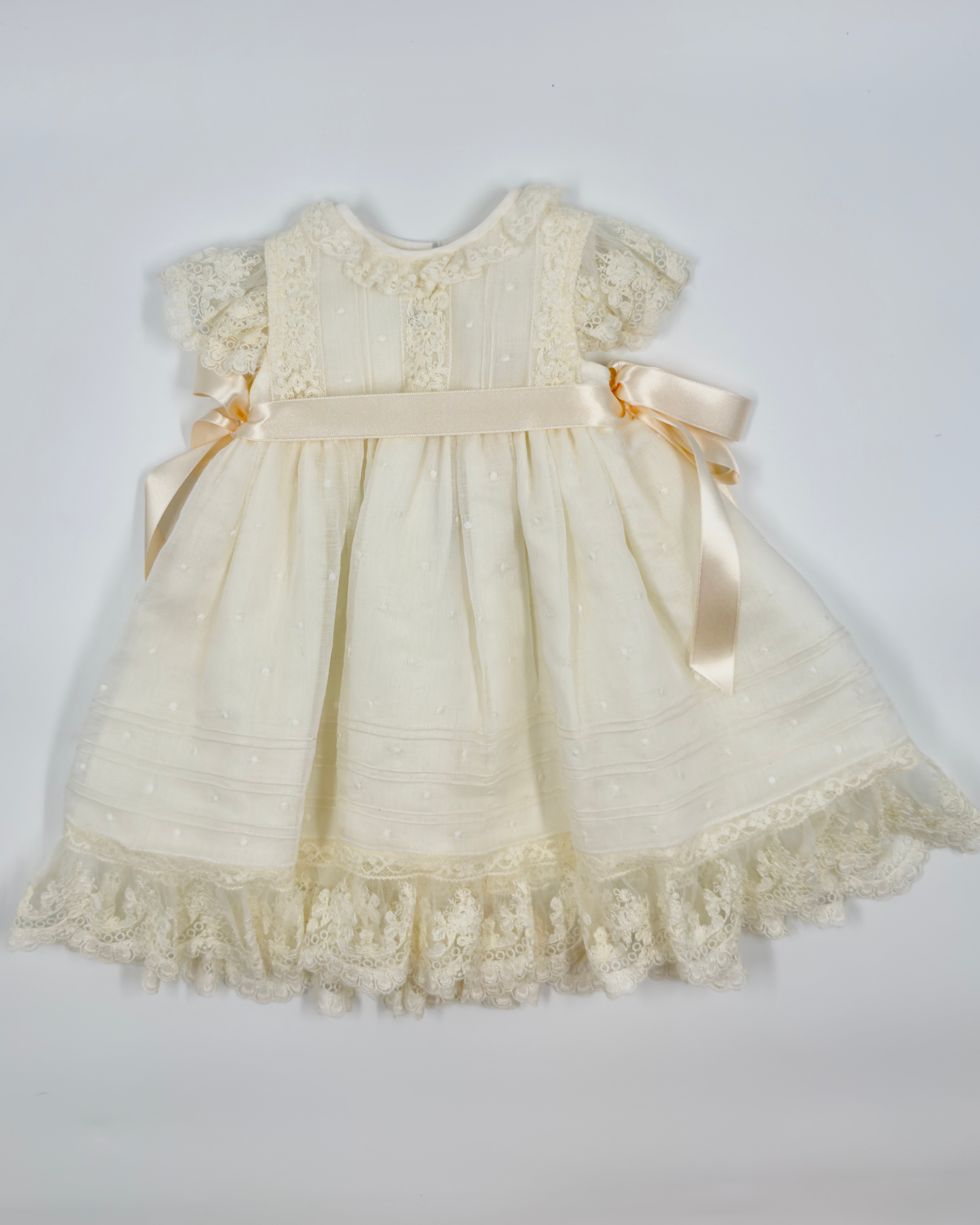 The Clementina dress is a beautifully delicate piece, perfect for celebrating your little one's most special milestones. Made from off-white embroidered tulle with exquisite lace detailing, this empire-cut dress features a soft, graceful silhouette full of timeless charm. Ideal for christenings, birthdays, baby presentations, and kindergarten graduations.