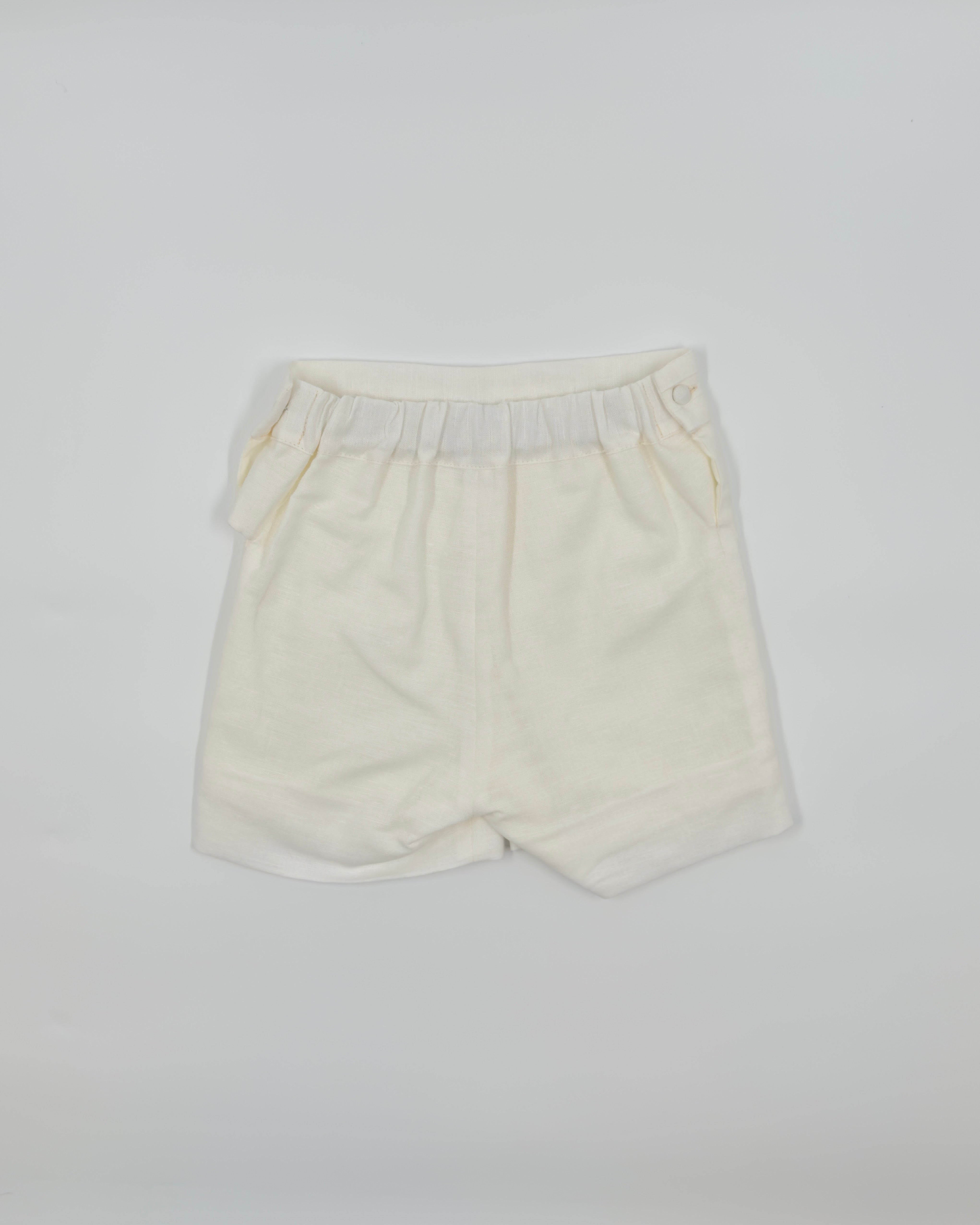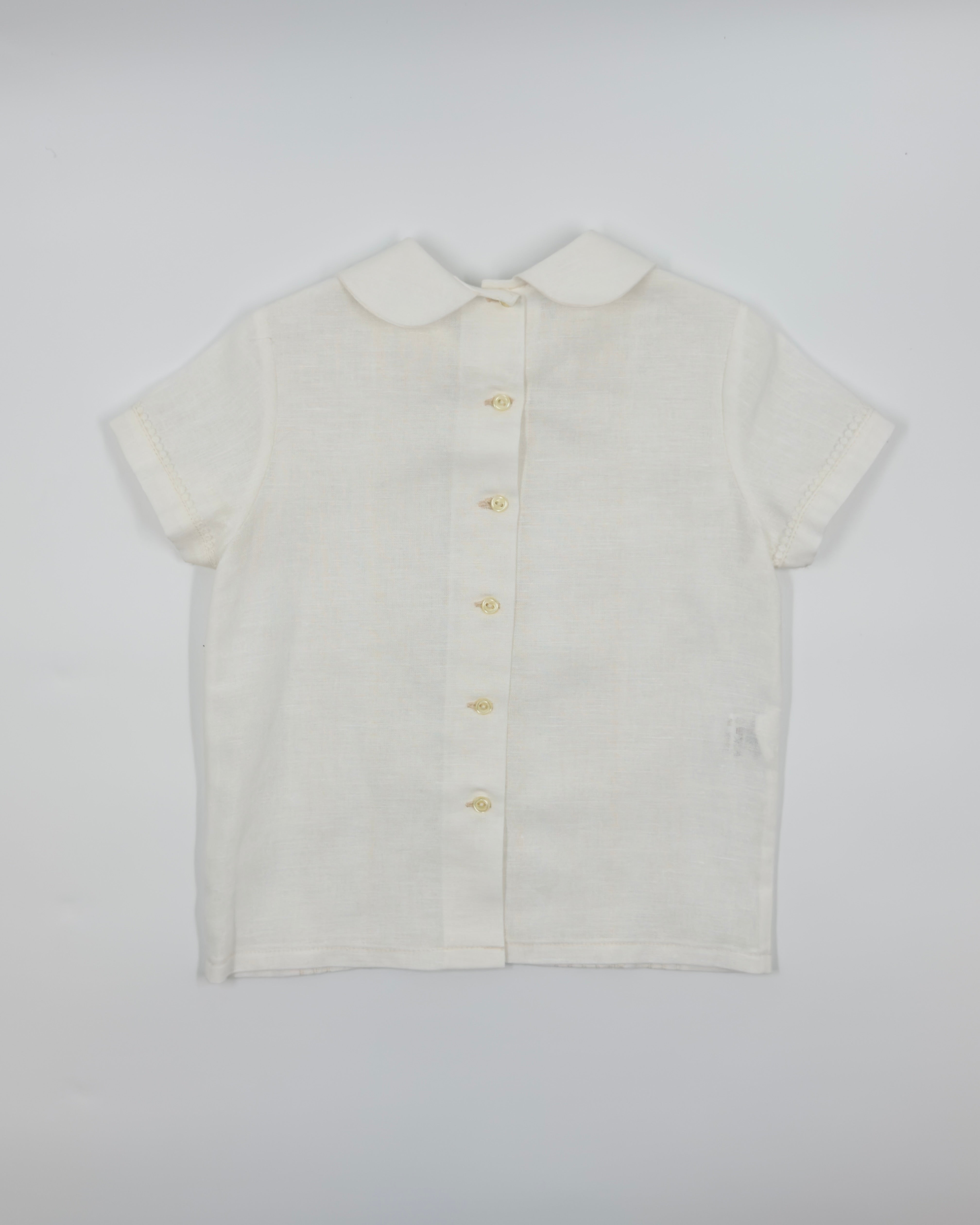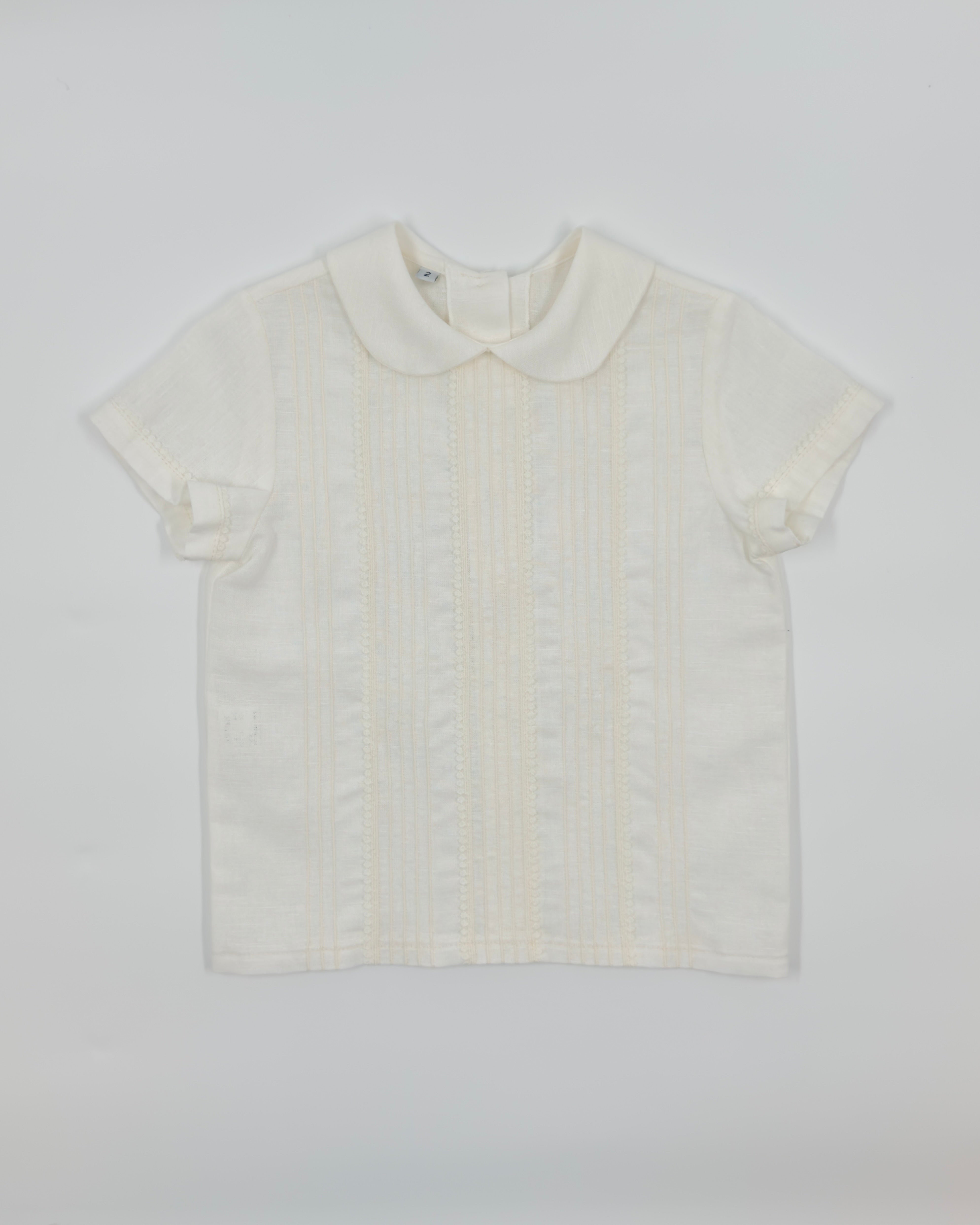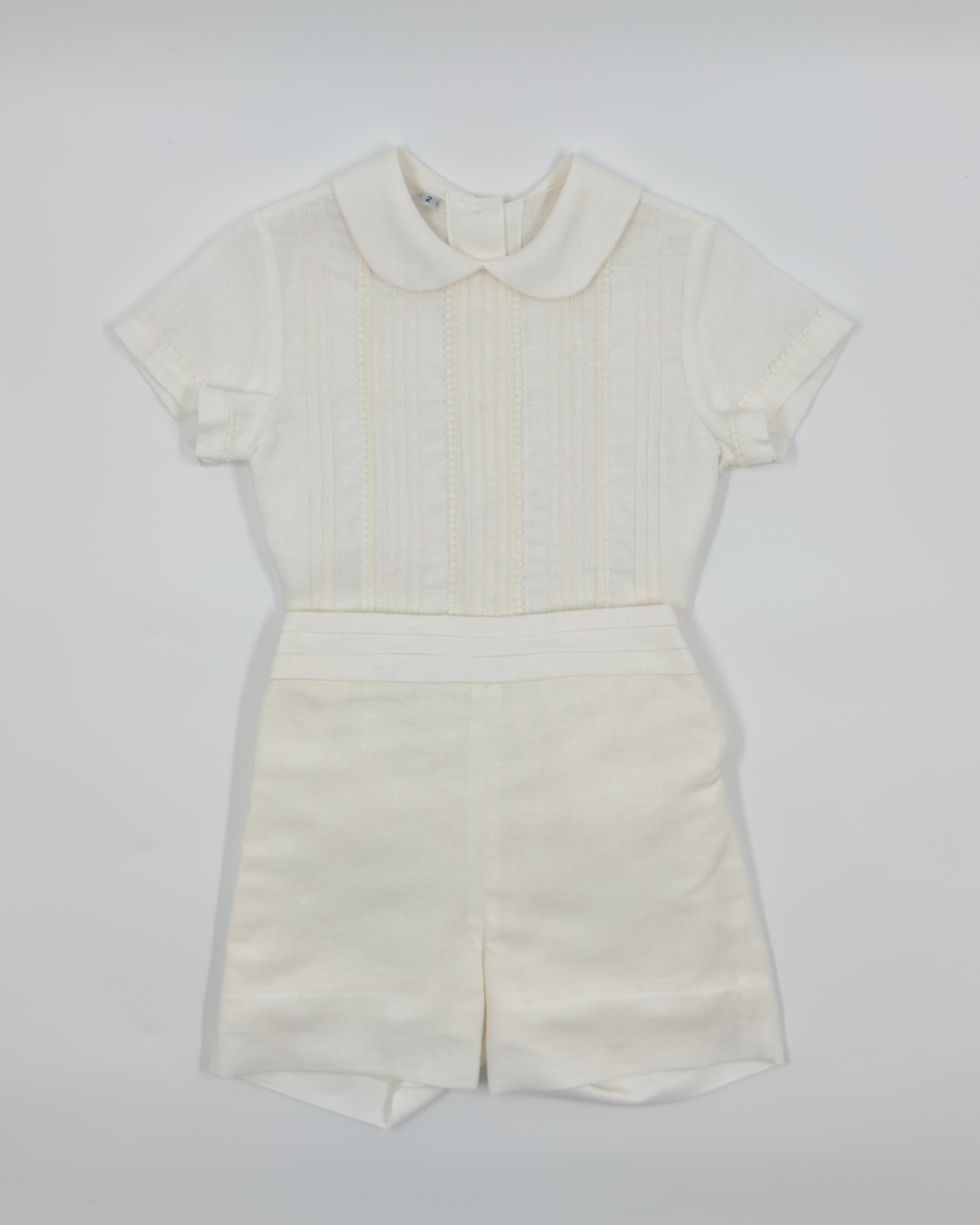 The Cristóbal outfit is a timeless two-piece set for toddler boys, perfect for formal occasions and special celebrations. Crafted from soft off-white linen, the shirt features refined pleats, a delicate lace panel, and a classic Peter Pan collar. The back button closure adds a traditional touch, while the straight shorts with an elastic back ensure comfort and a tailored fit. Ideal for weddings, christenings, and elegant gatherings.