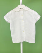 The Danilo outfit is a classic two-piece set for toddler boys, perfect for formal events and meaningful celebrations. Made from soft off-white linen, the shirt features refined pleats, a delicate lace accent, and a traditional Peter Pan collar. Front button closure adds a polished finish, while the straight shorts with an elastic back ensure comfort and a tailored fit. Ideal for weddings, christenings, and special occasions.