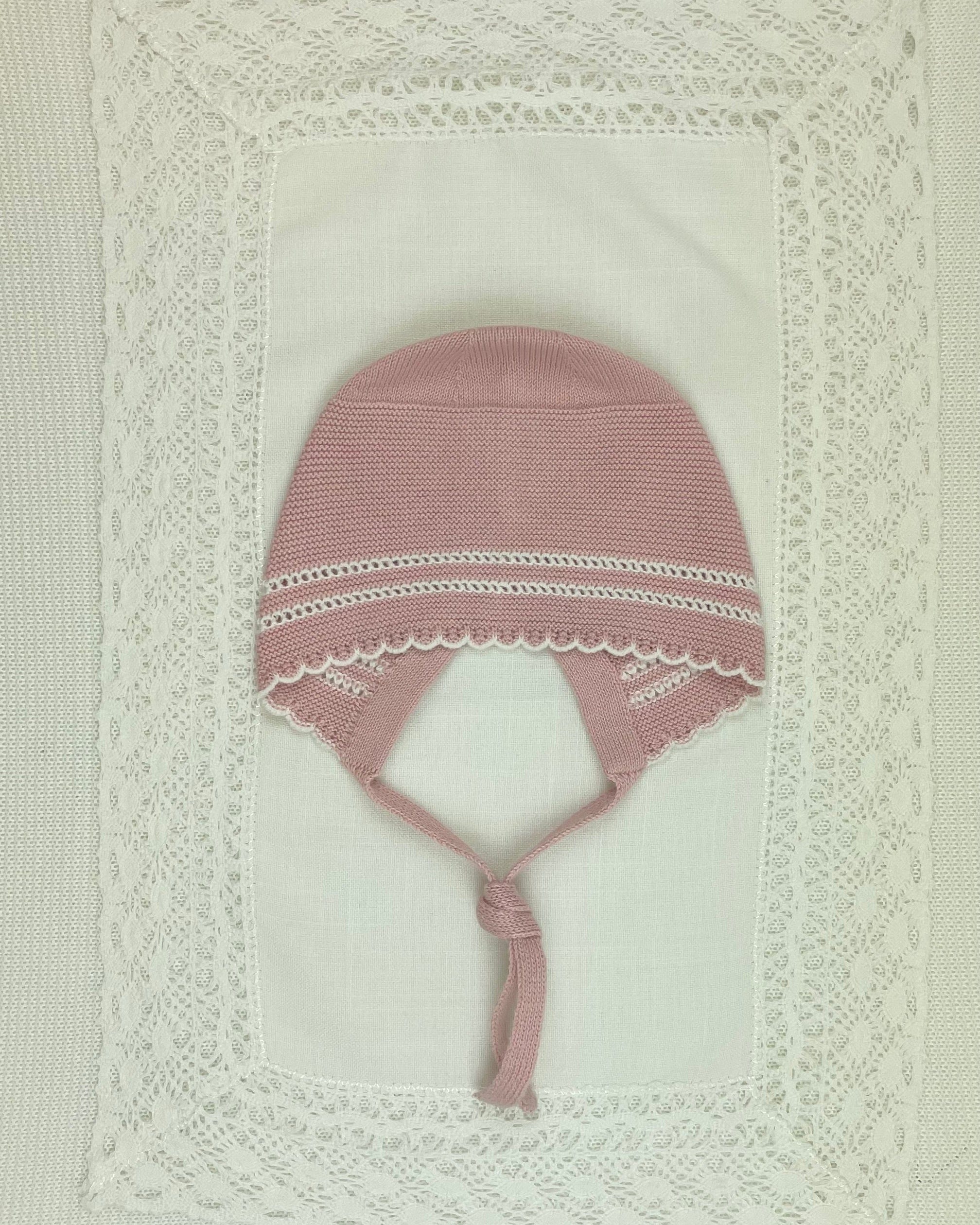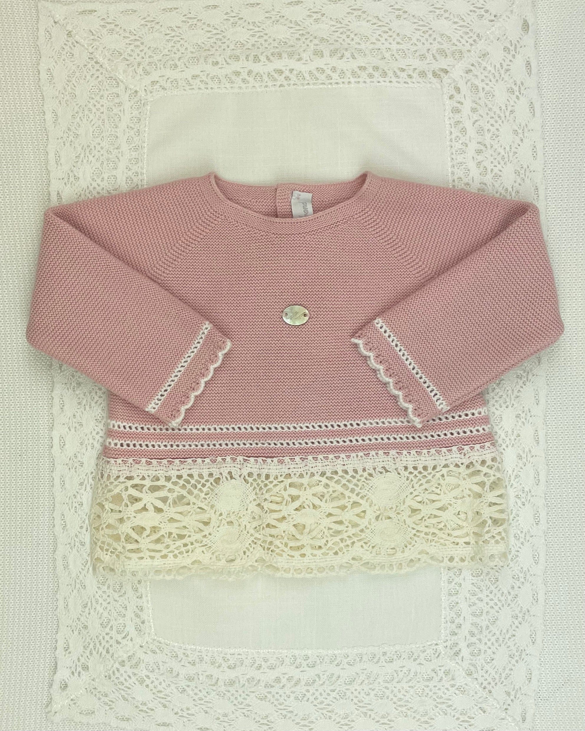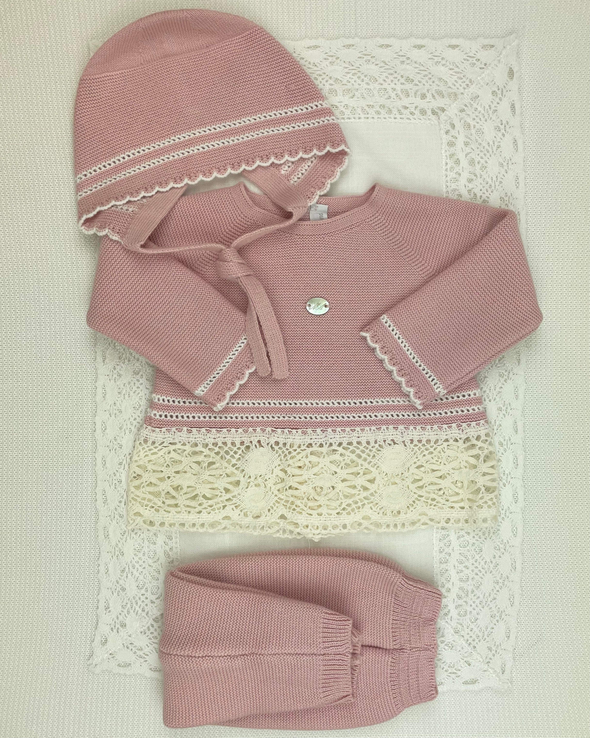 Handcrafted in Spain with exquisite care, the set includes a knitted top with delicate lace trim and back button closure, matching footless pants, and a coordinated bonnet—a beautifully cohesive ensemble ideal for memorable moments.