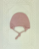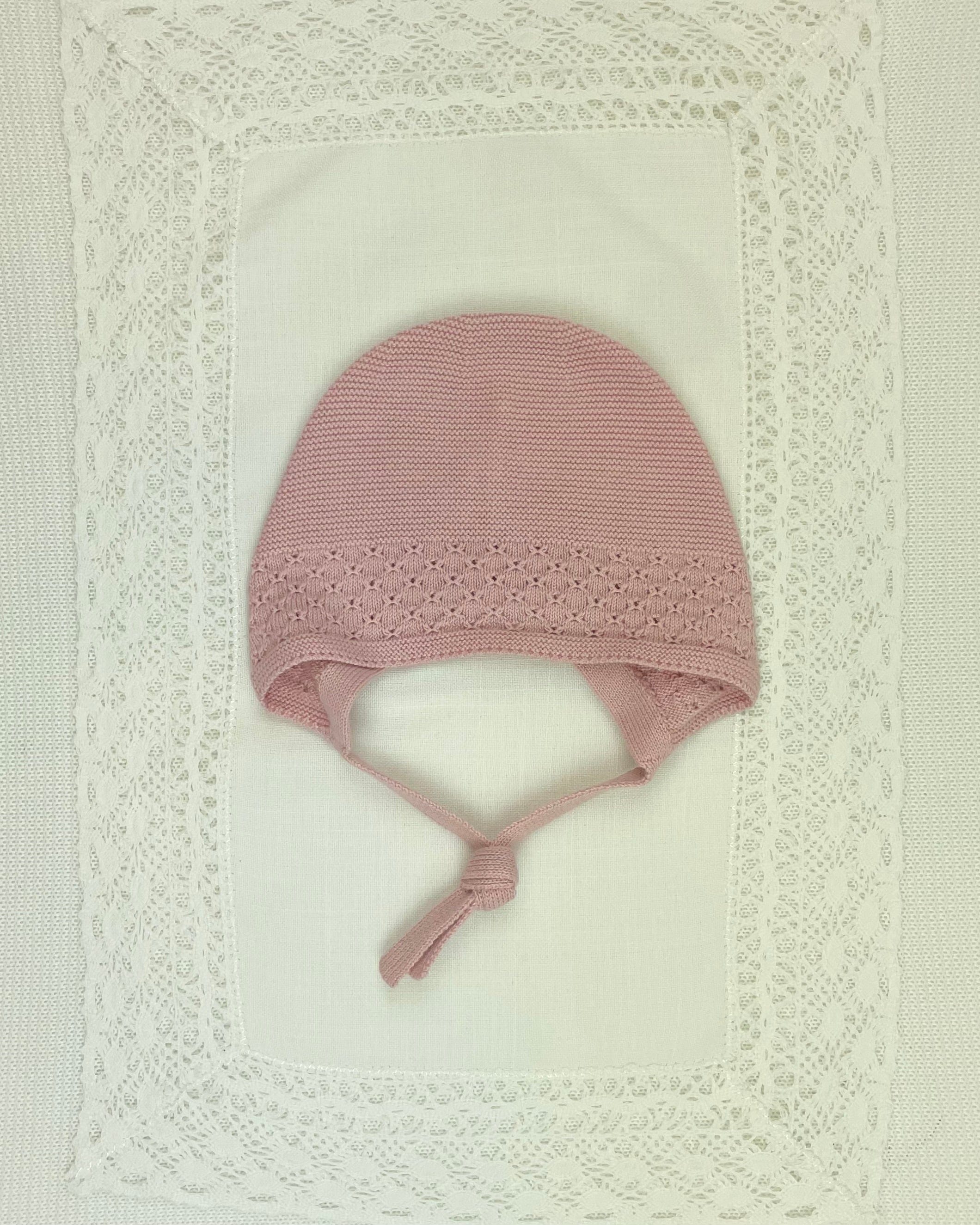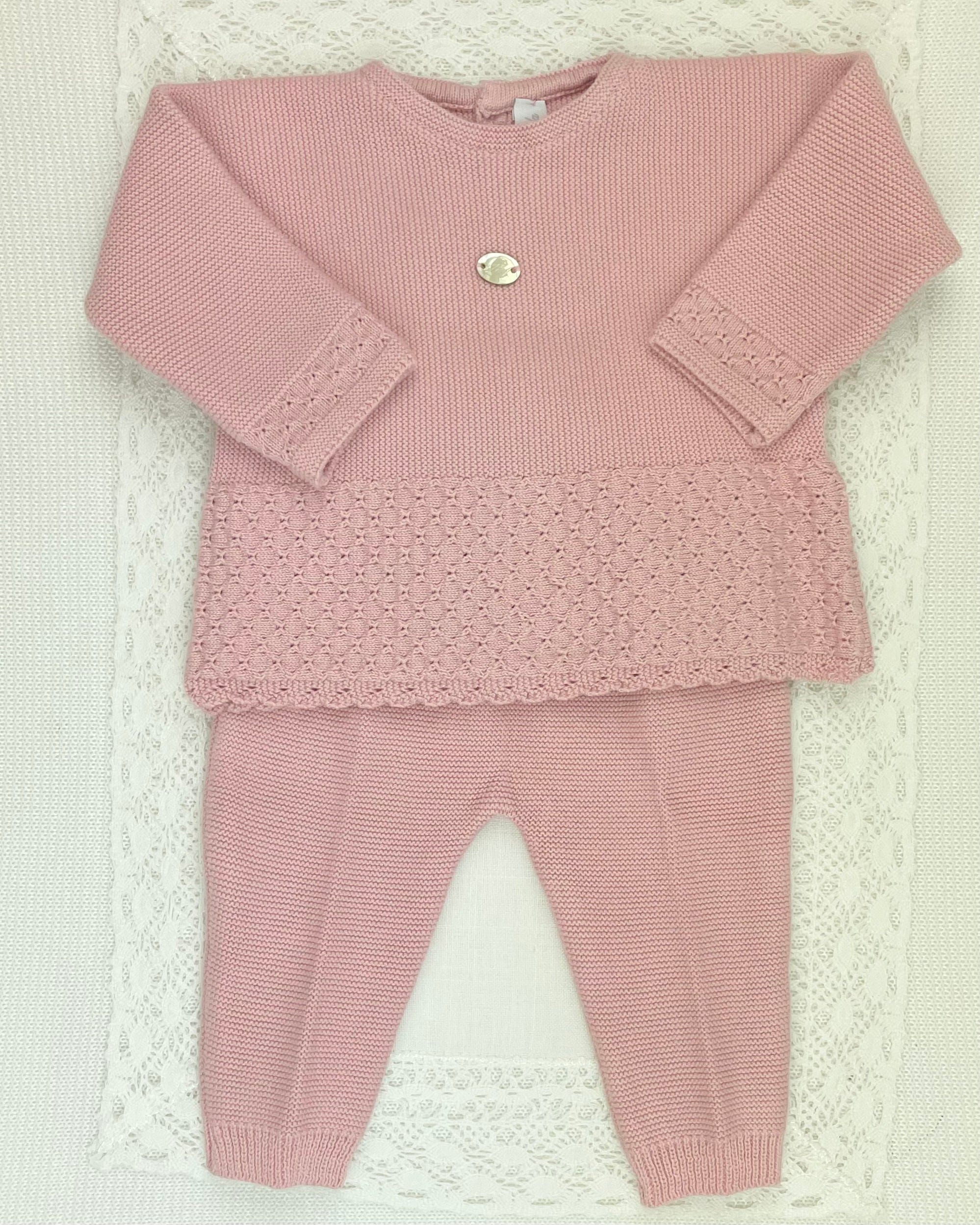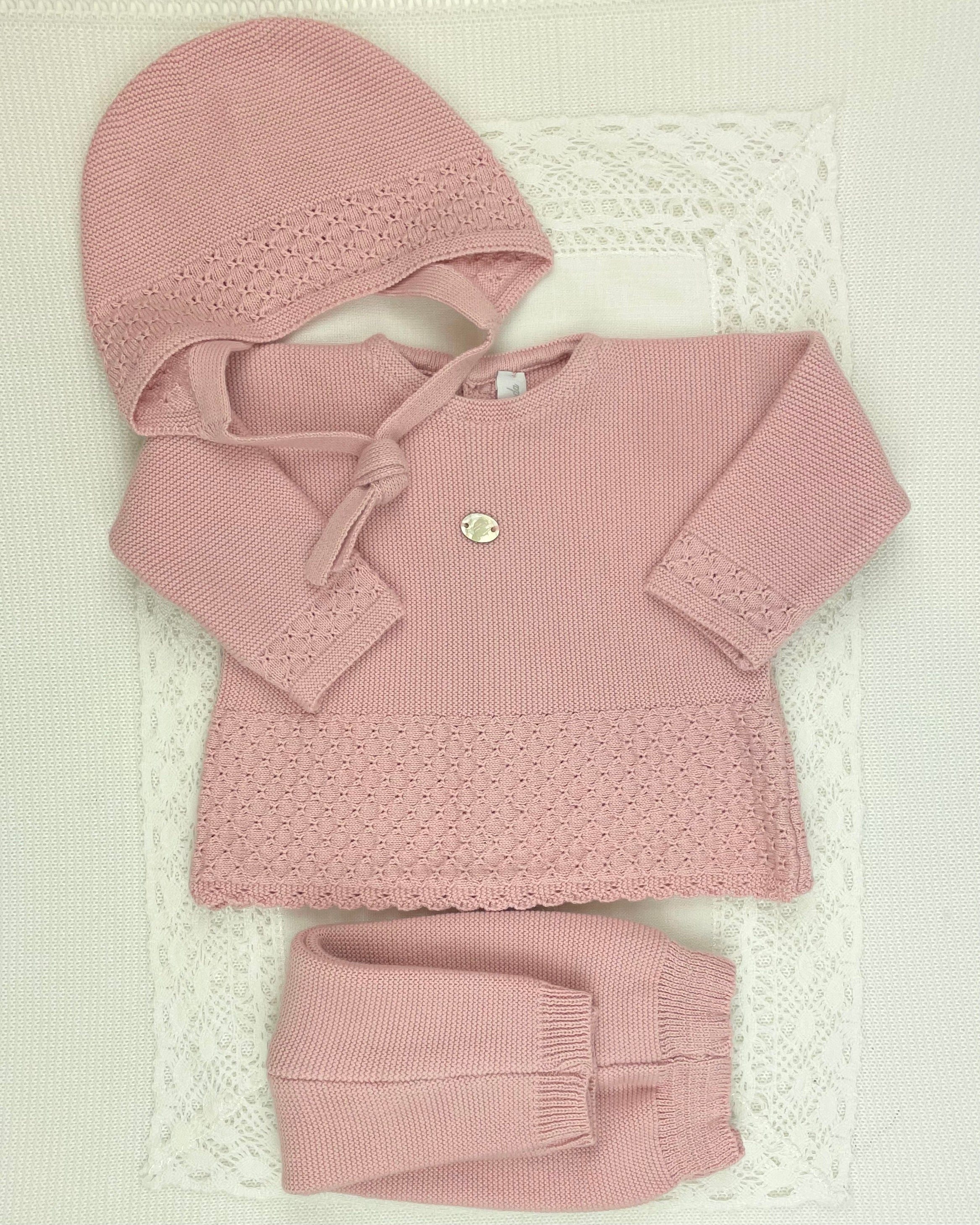 Handcrafted in Spain with exceptional quality, the set includes a dusty rose knitted top with back button closure, matching footless pants, and a coordinated bonnet for a beautifully coordinated and graceful ensemble.