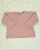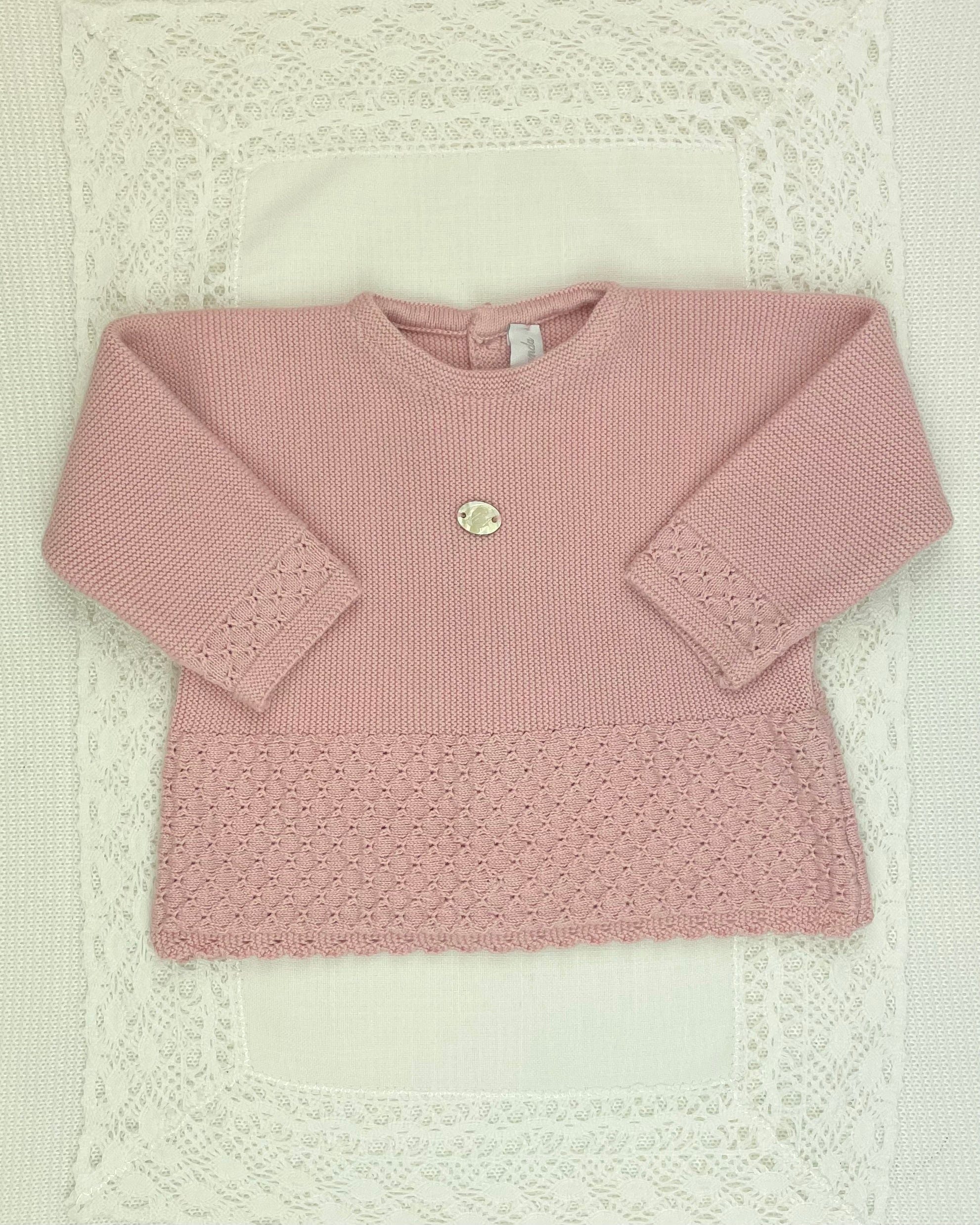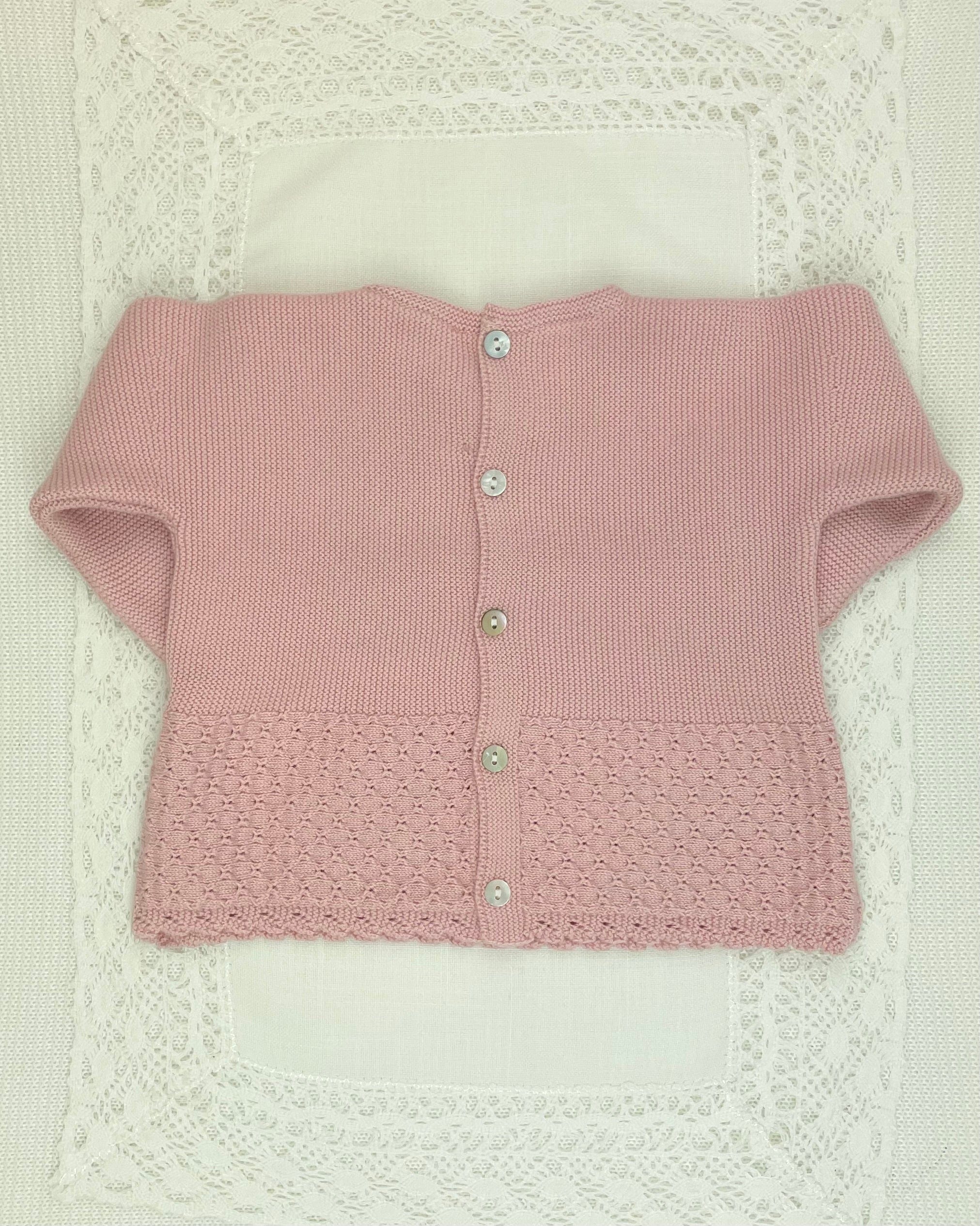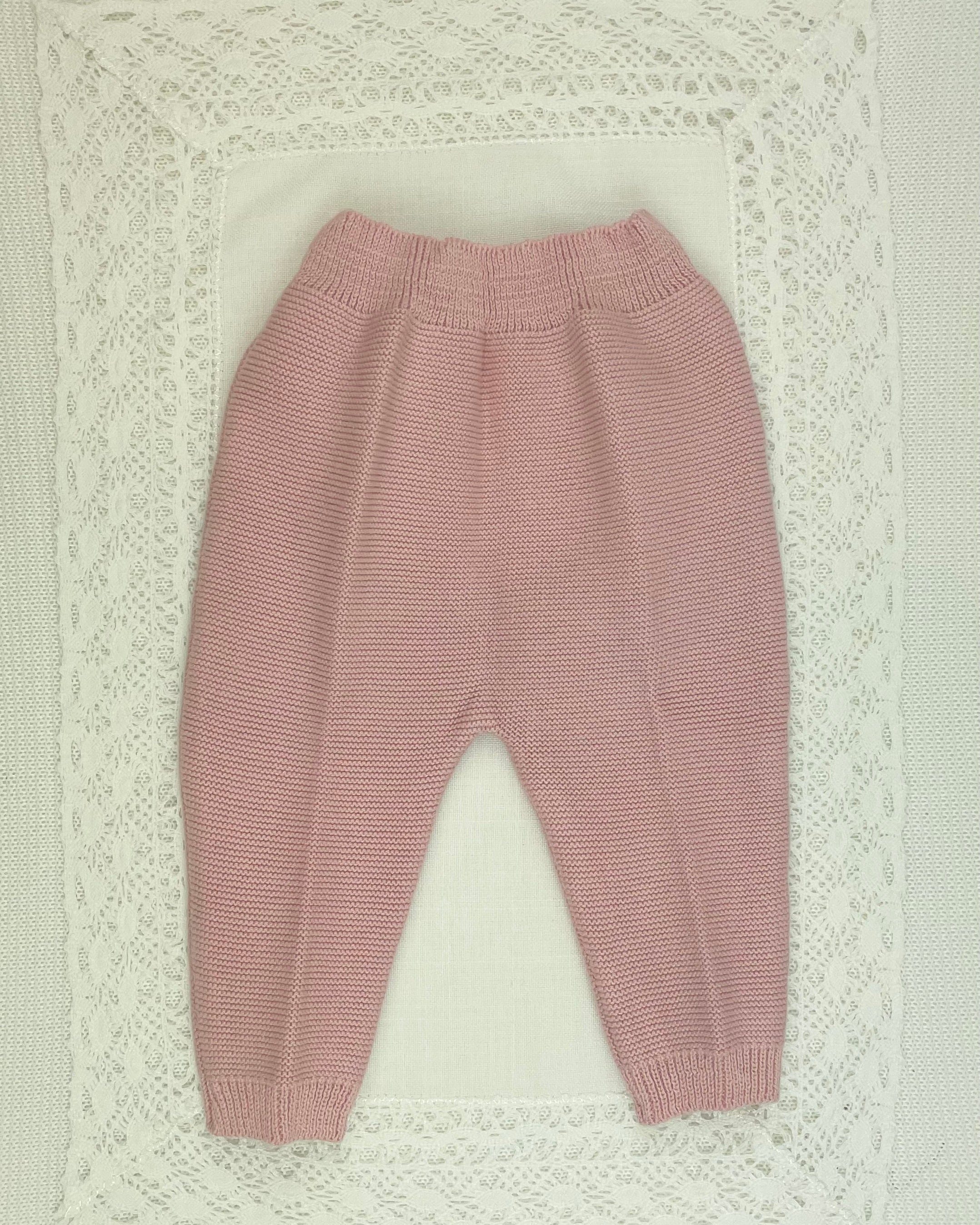 Handcrafted in Spain with exceptional quality, the set includes a dusty rose knitted top with back button closure, matching footless pants, and a coordinated bonnet for a beautifully coordinated and graceful ensemble.