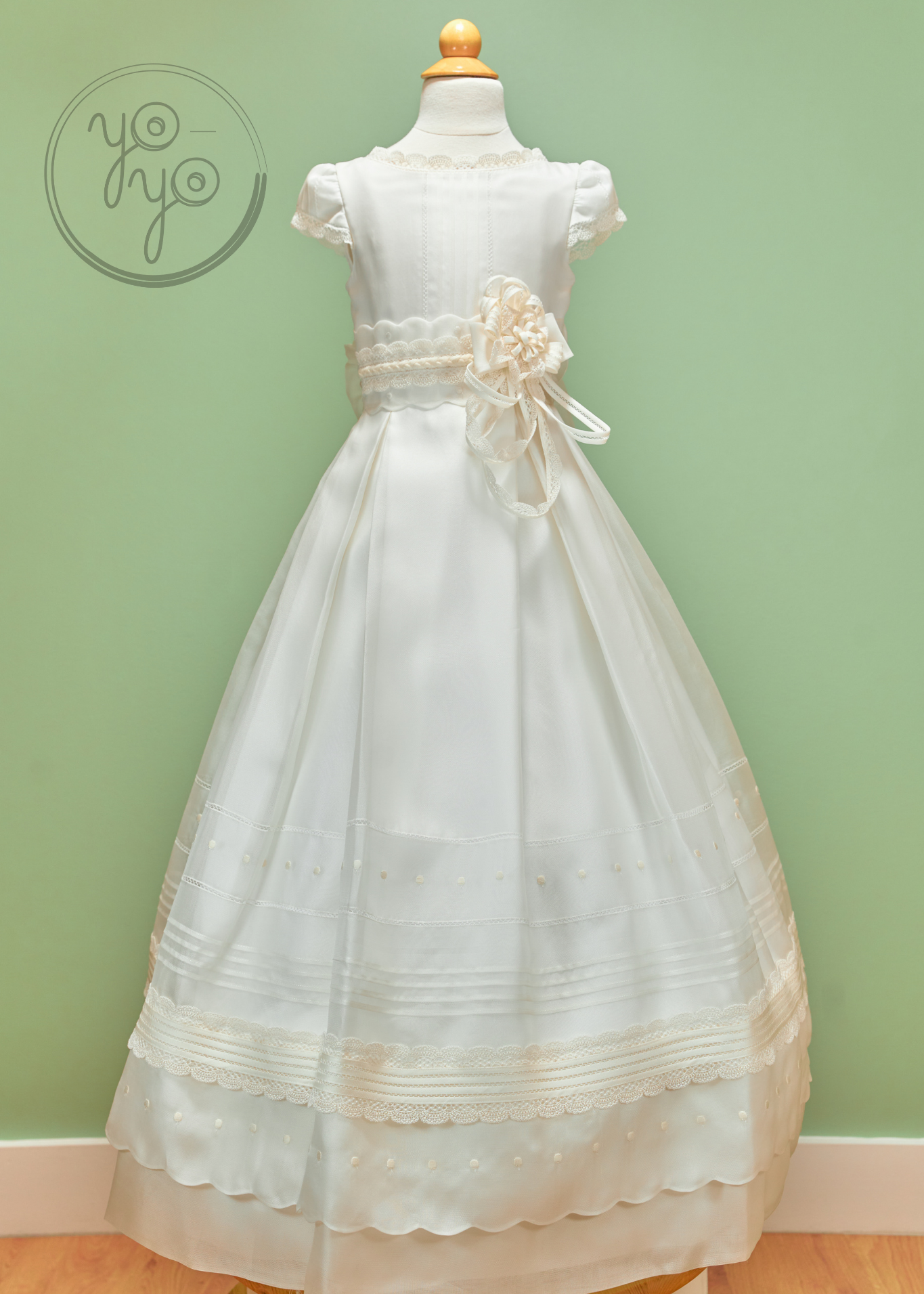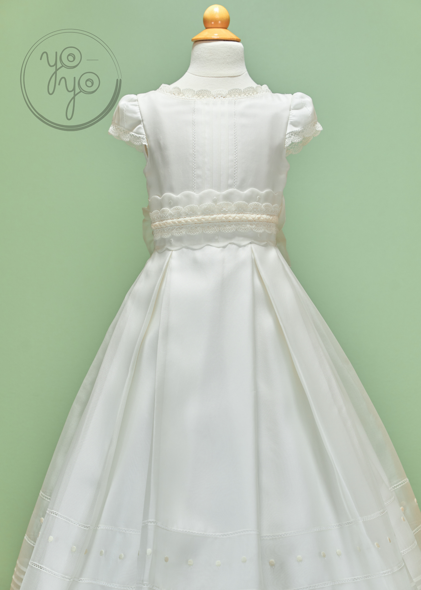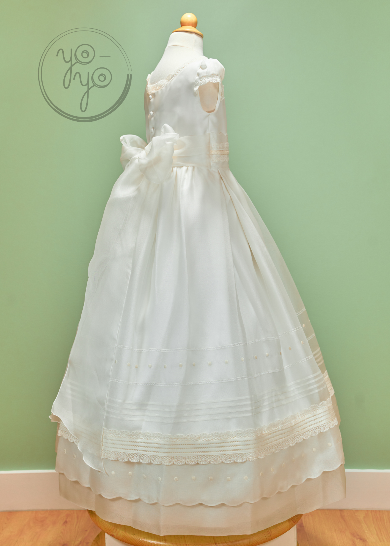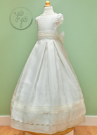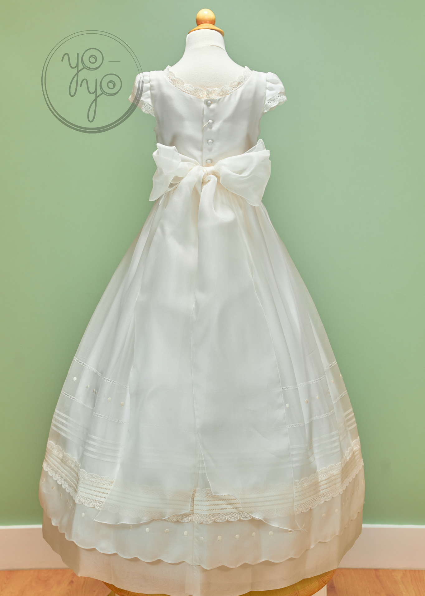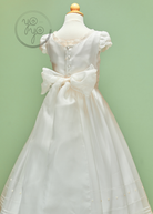 A removable appliqué allows for a touch of personalization, while the back is finished with covered buttons and soft sashes that tie into a full bow. Lightweight yet regal, Margarita is designed for a memorable and refined First Communion celebration.