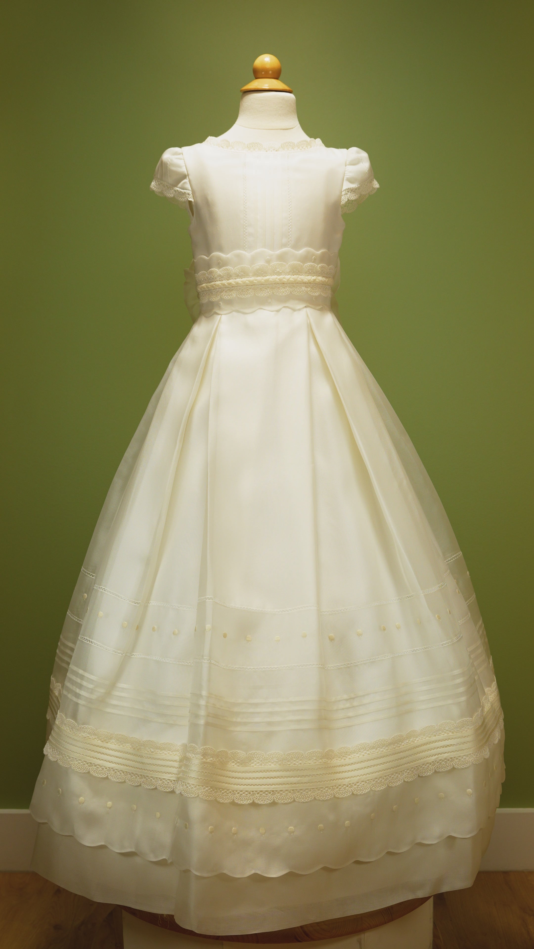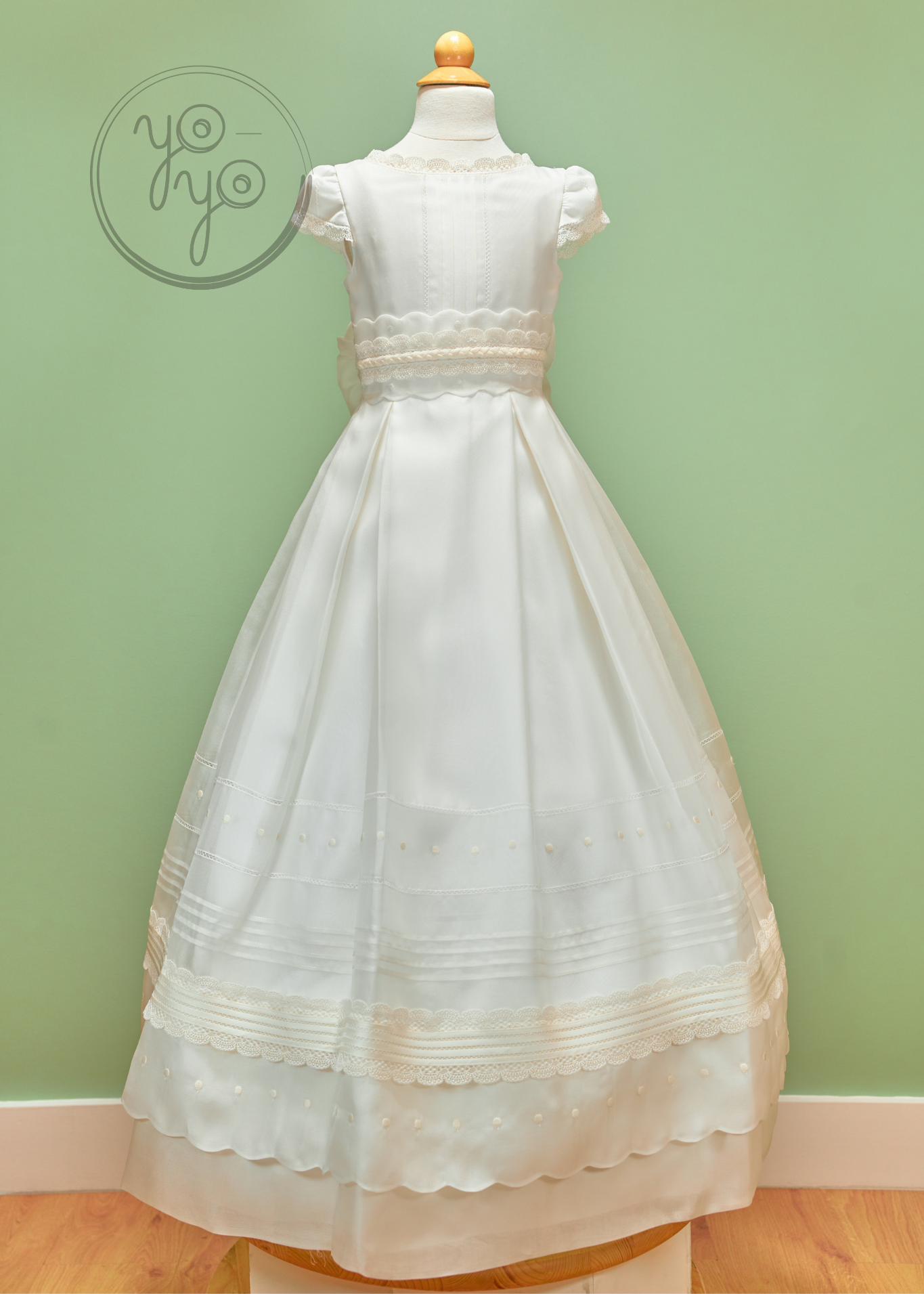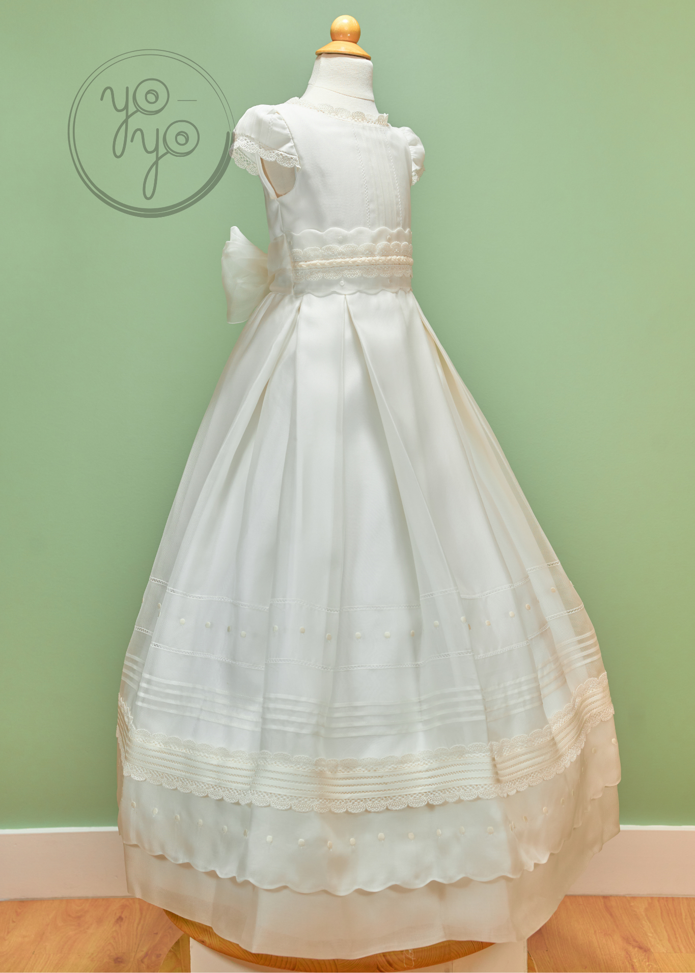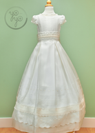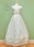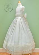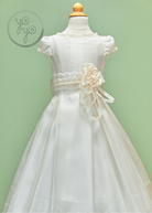 The Margarita First Communion Dress is an exquisite blend of elegance and tradition. Crafted from luxurious off-white silk, it features delicate lace accents that add texture and timeless beauty. The pleated skirt flows gracefully, adorned with subtle detailing throughout.