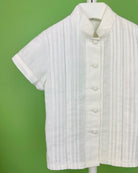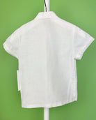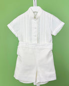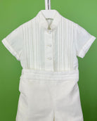 The Gerardo outfit is a refined two-piece set for toddler boys, thoughtfully designed for special occasions. Crafted from soft off-white linen, the shirt features classic pleats, delicate lace detailing, and a modern Mao collar for a clean, sophisticated look. Front button closure adds to its timeless charm, while the straight shorts with an elastic back offer a comfortable and tailored fit. Perfect for weddings, christenings, and formal celebrations.