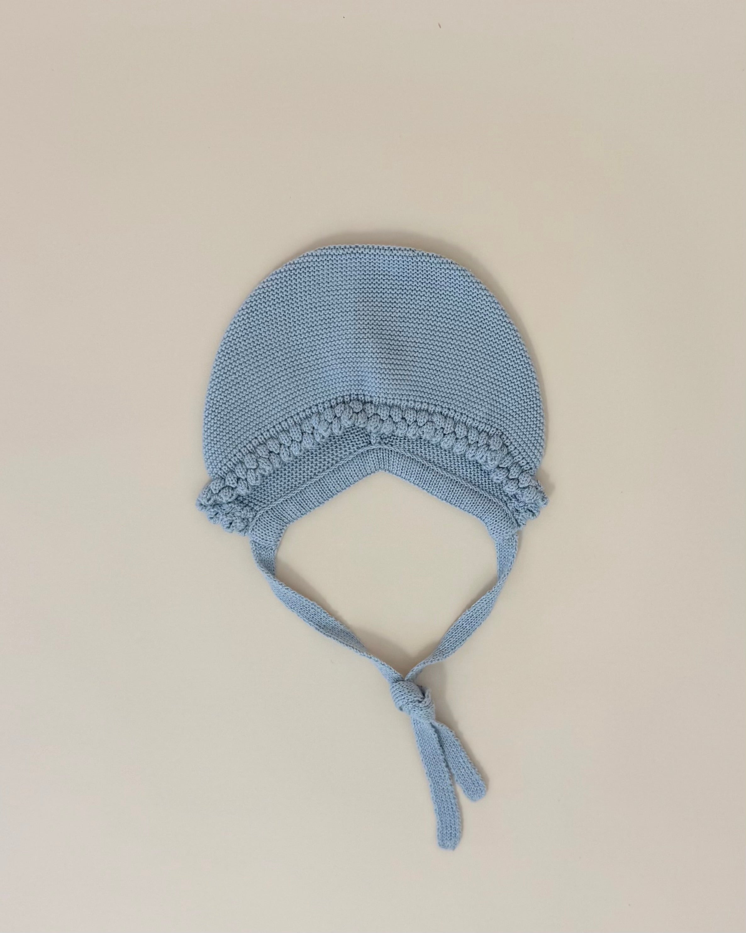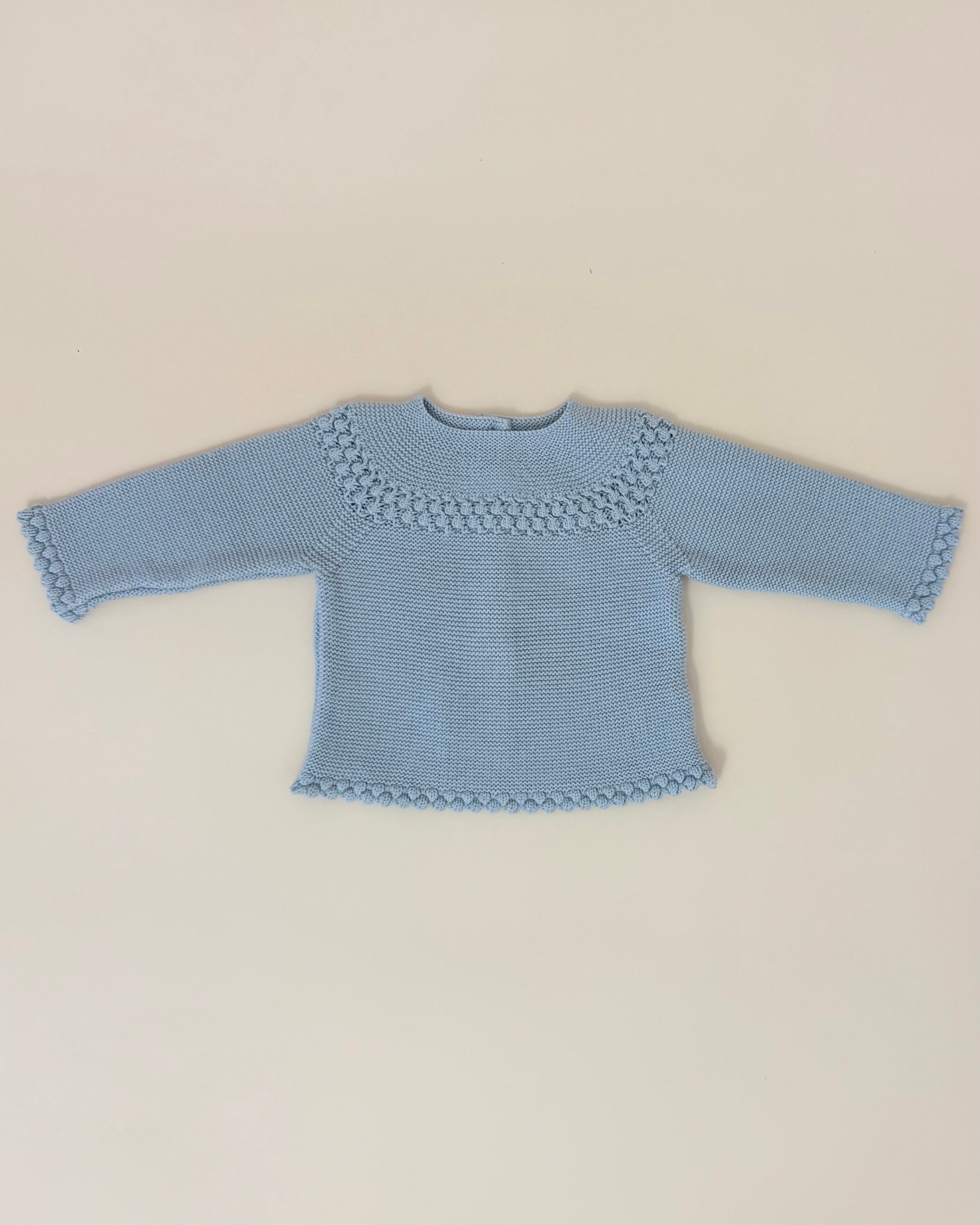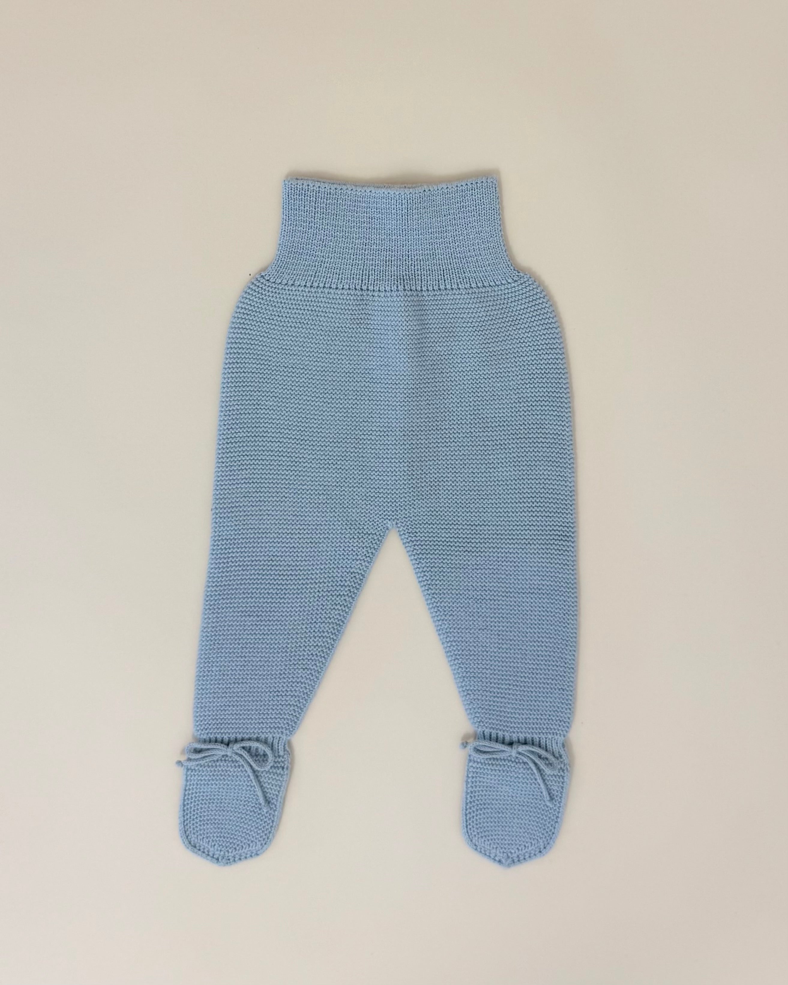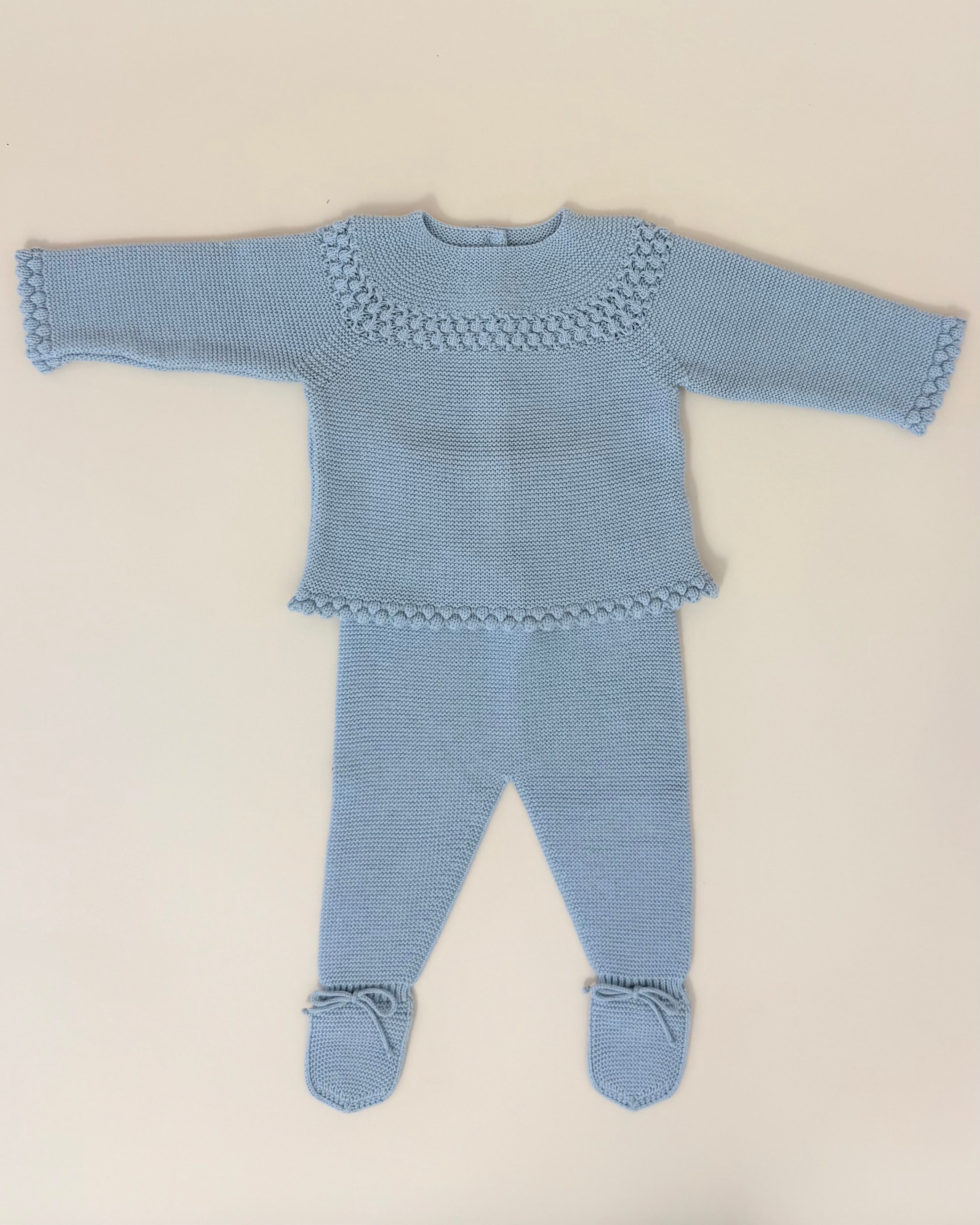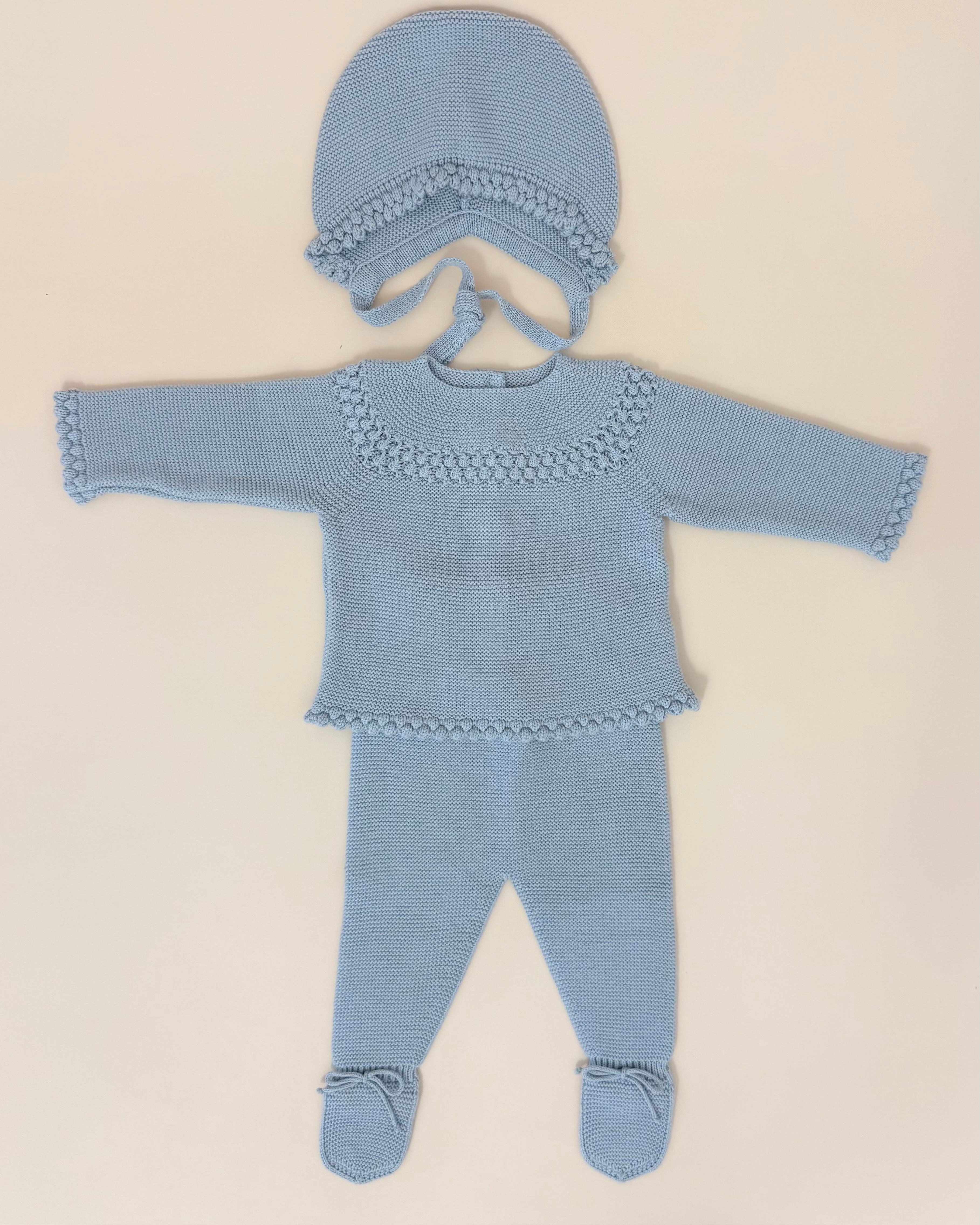 Handcrafted in Spain with exceptional quality and care, the set includes a grey knitted top with back button closure, matching footed pants, and a coordinated bonnet for a refined and cozy look.