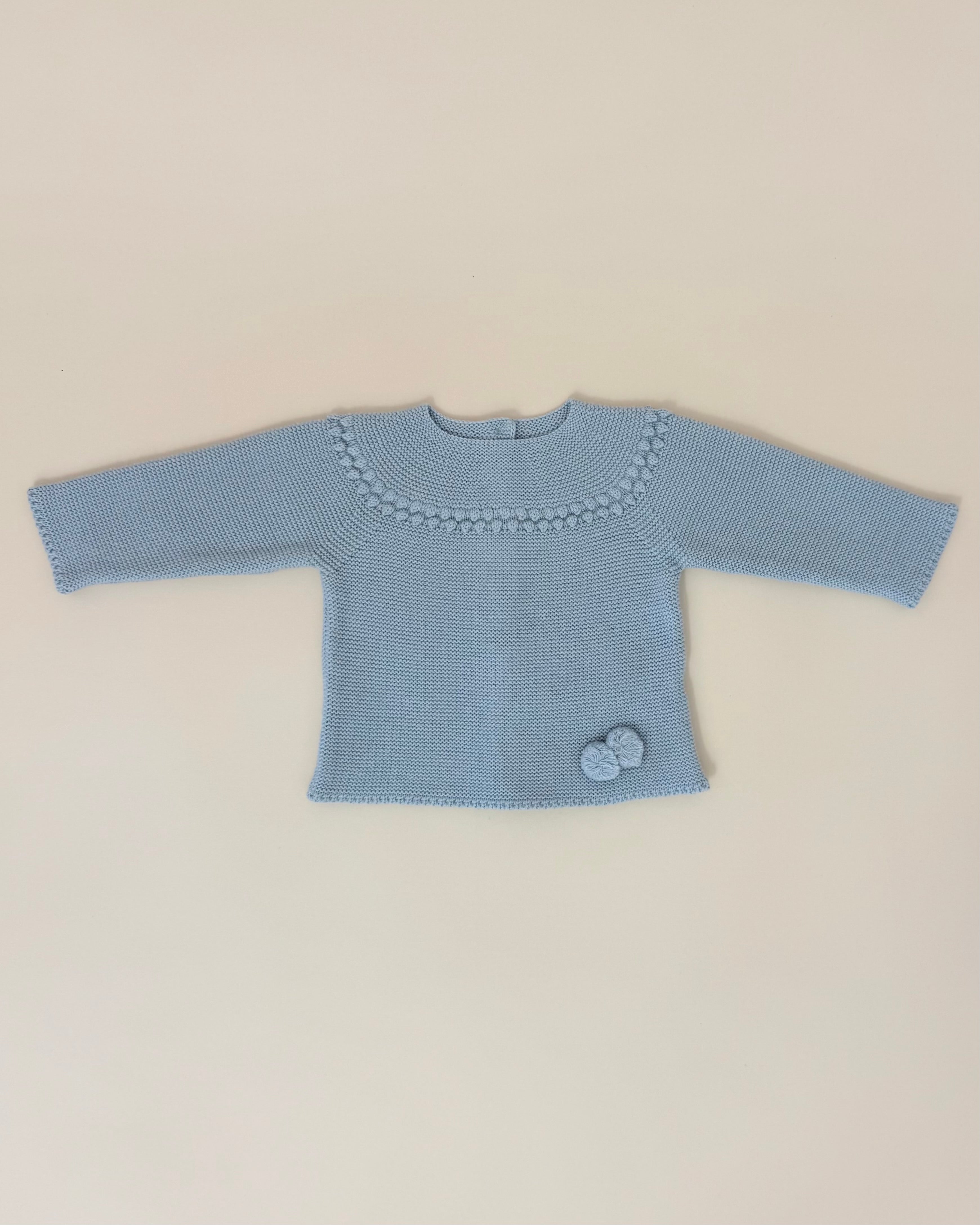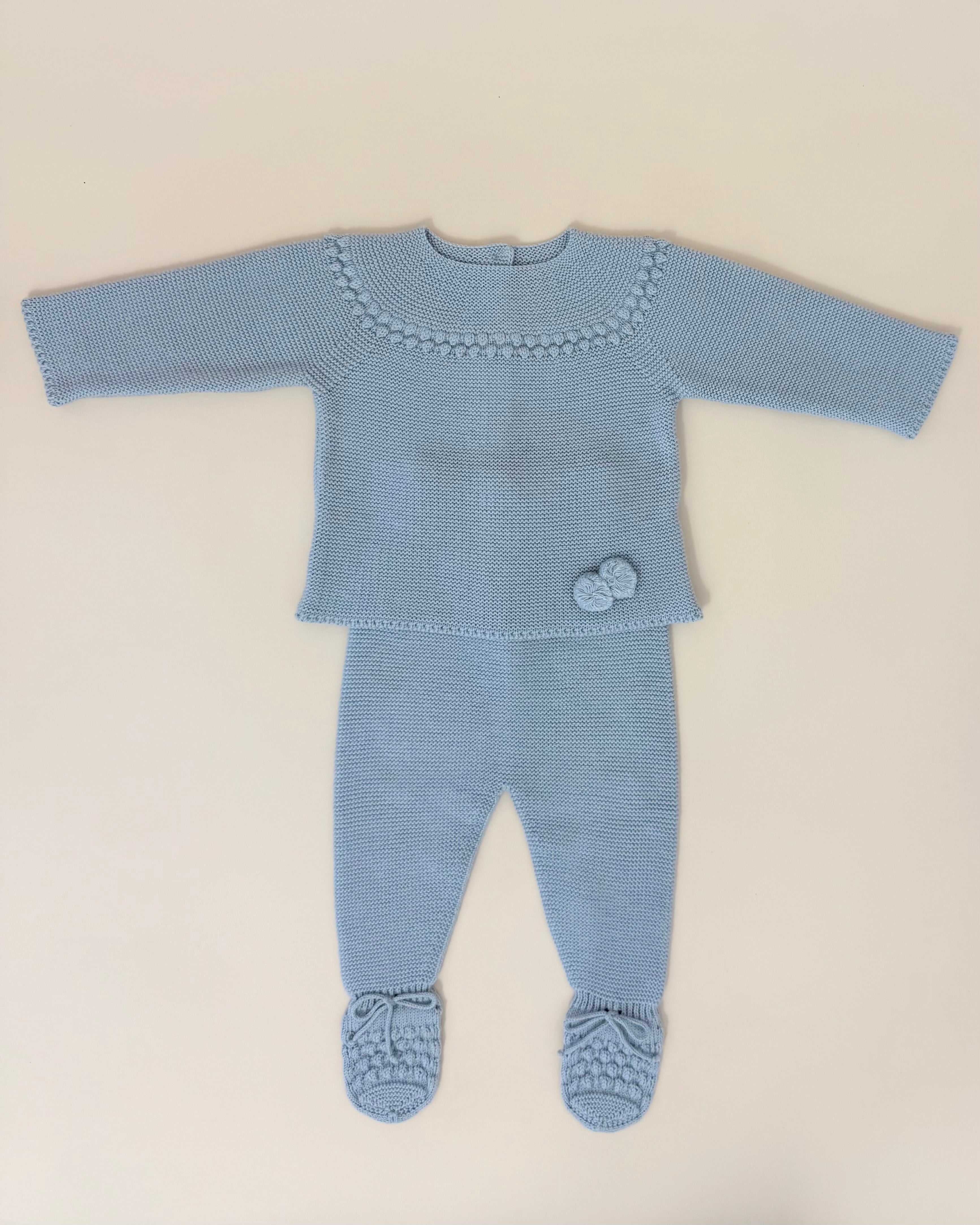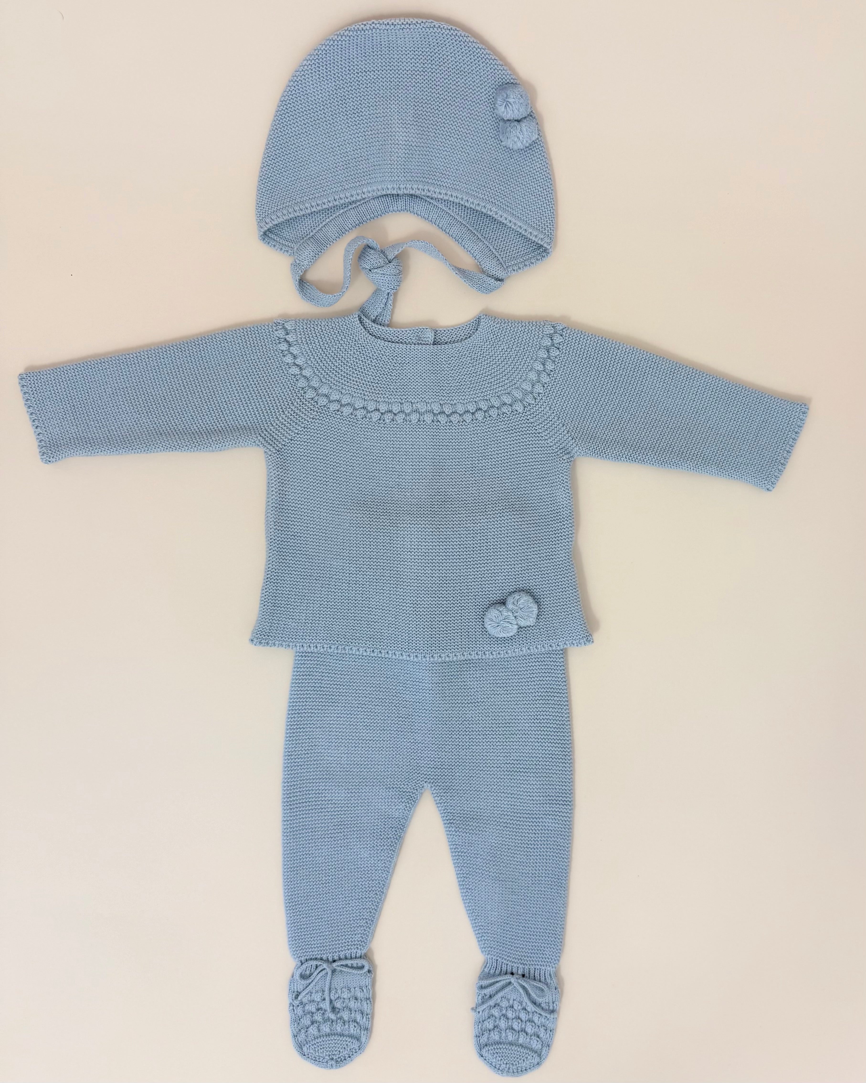 Handcrafted in Spain with exceptional attention to detail, the set includes a knitted top with back button closure and two soft pompoms, matching footed pants, and a coordinated bonnet also adorned with two playful pompoms—creating a cozy and picture-perfect look.