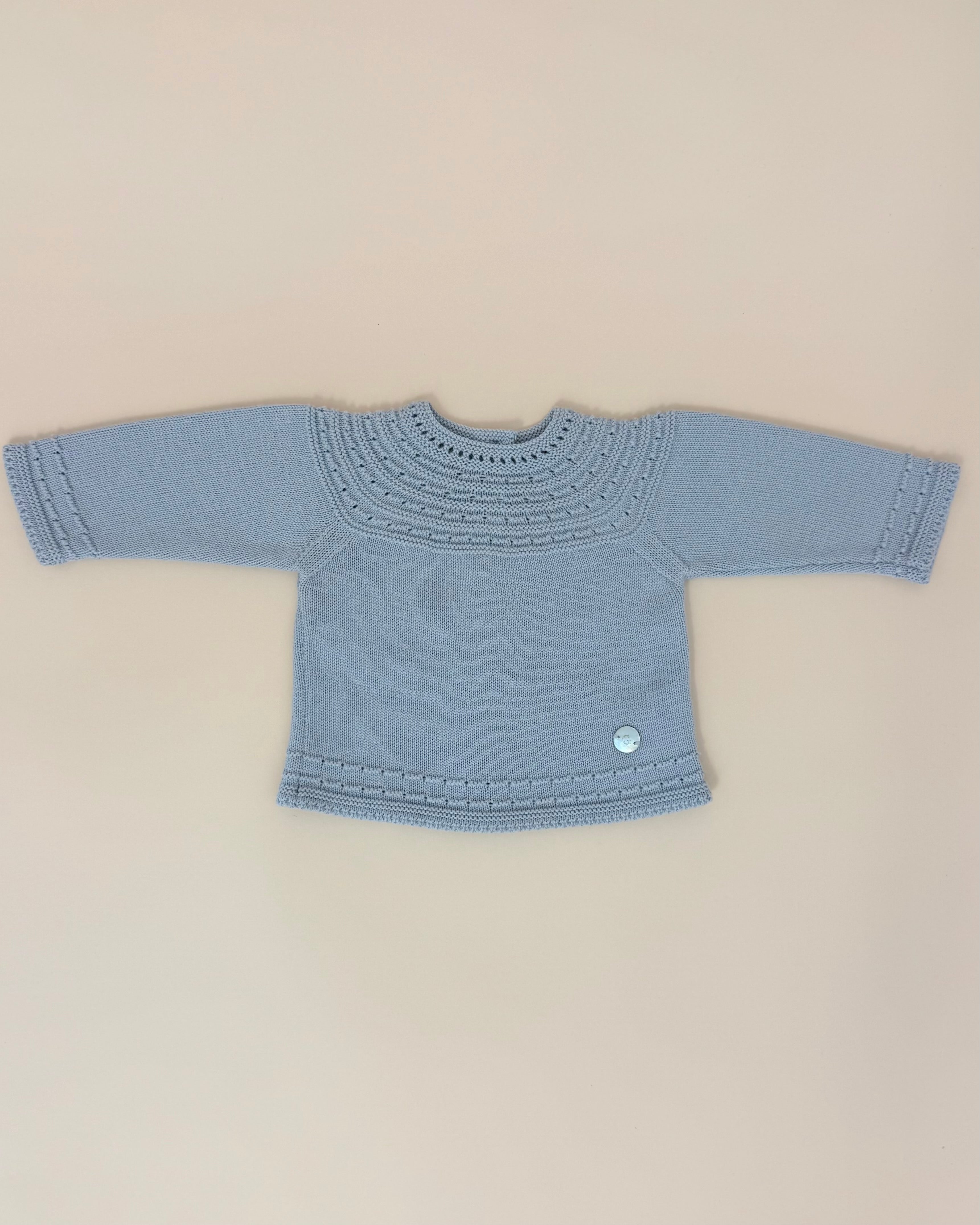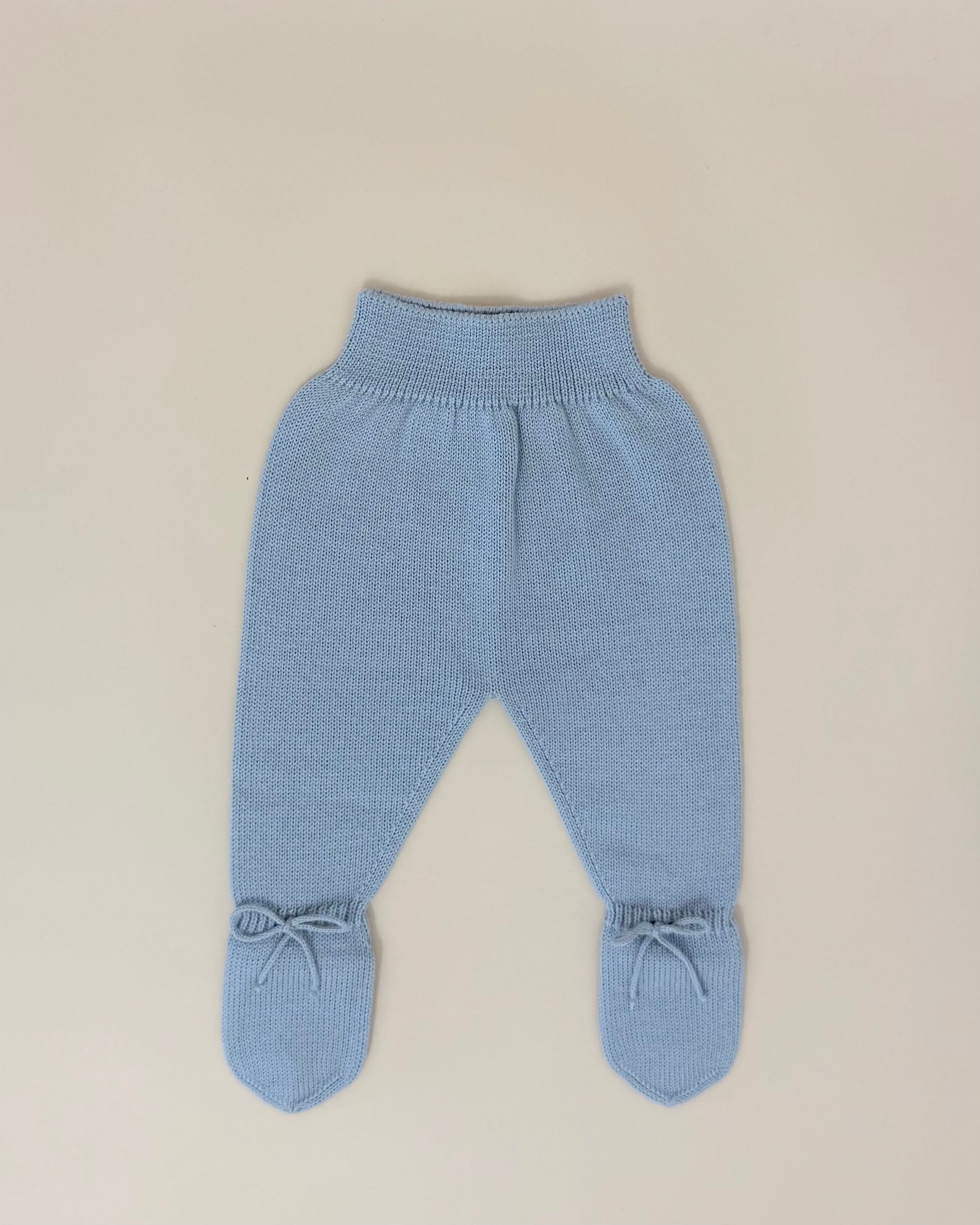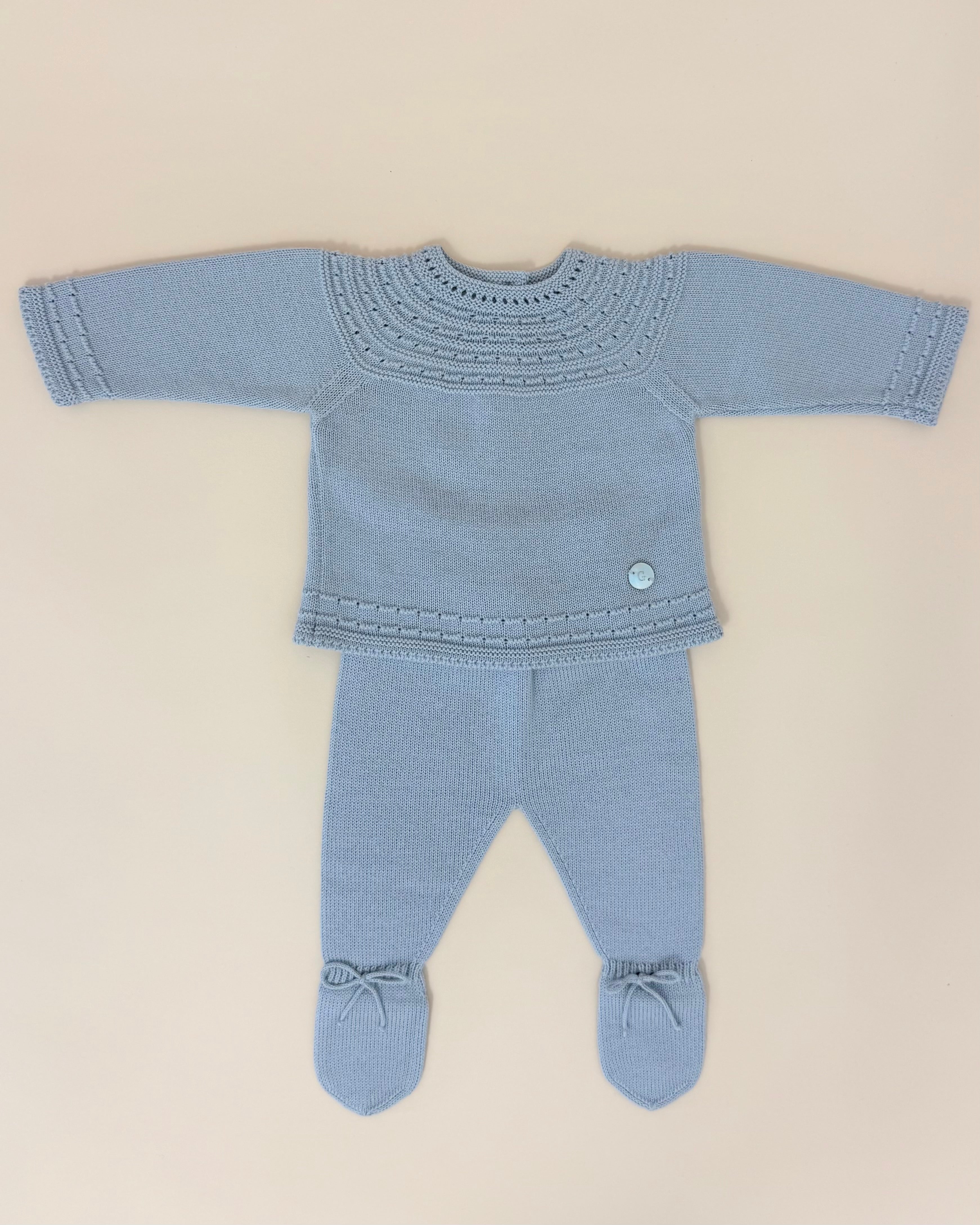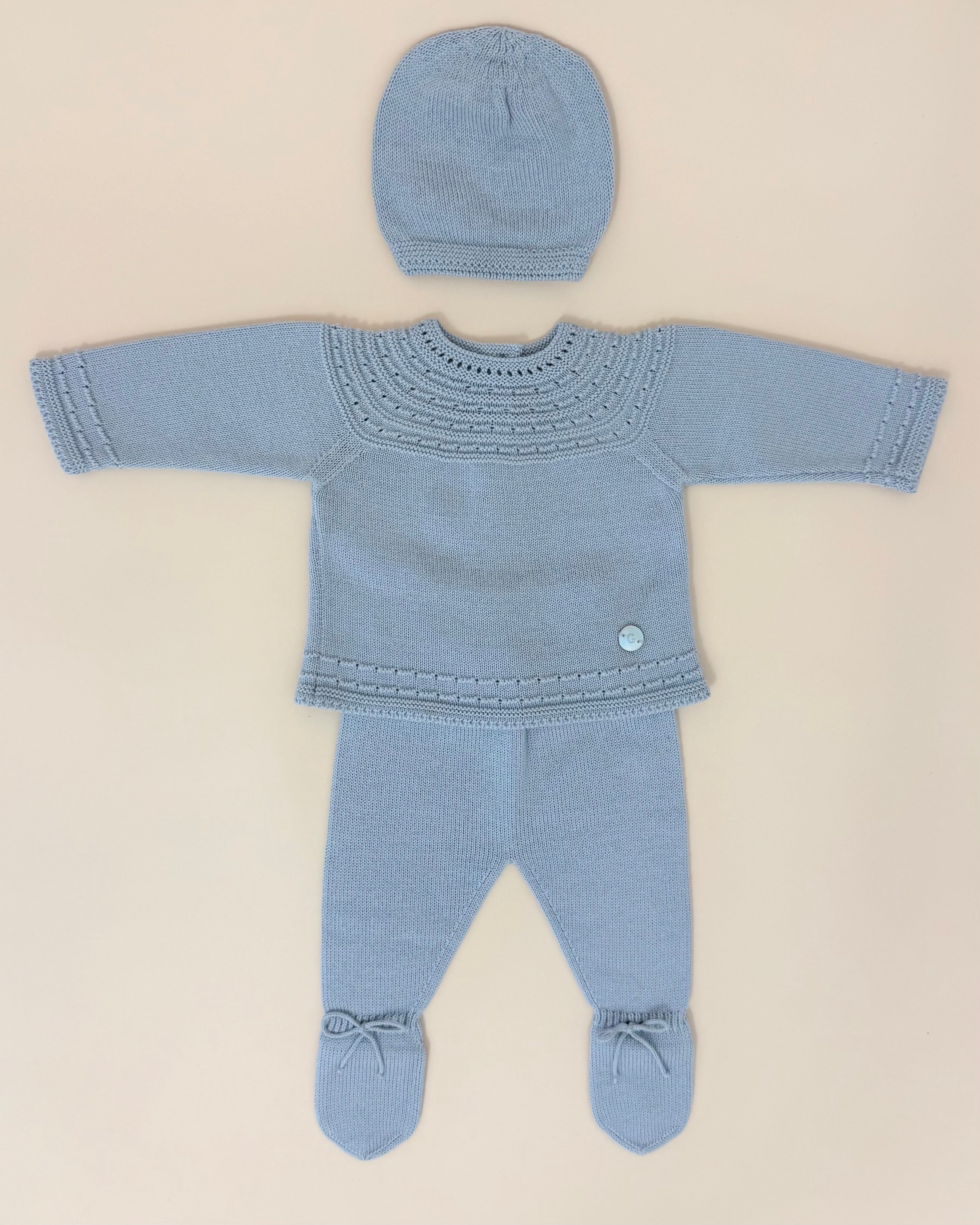 Handcrafted in Spain with exceptional attention to quality, the set includes a knitted top with back button closure, matching footed pants, and a coordinated bonnet—creating a soft, refined ensemble that’s both cozy and sophisticated.