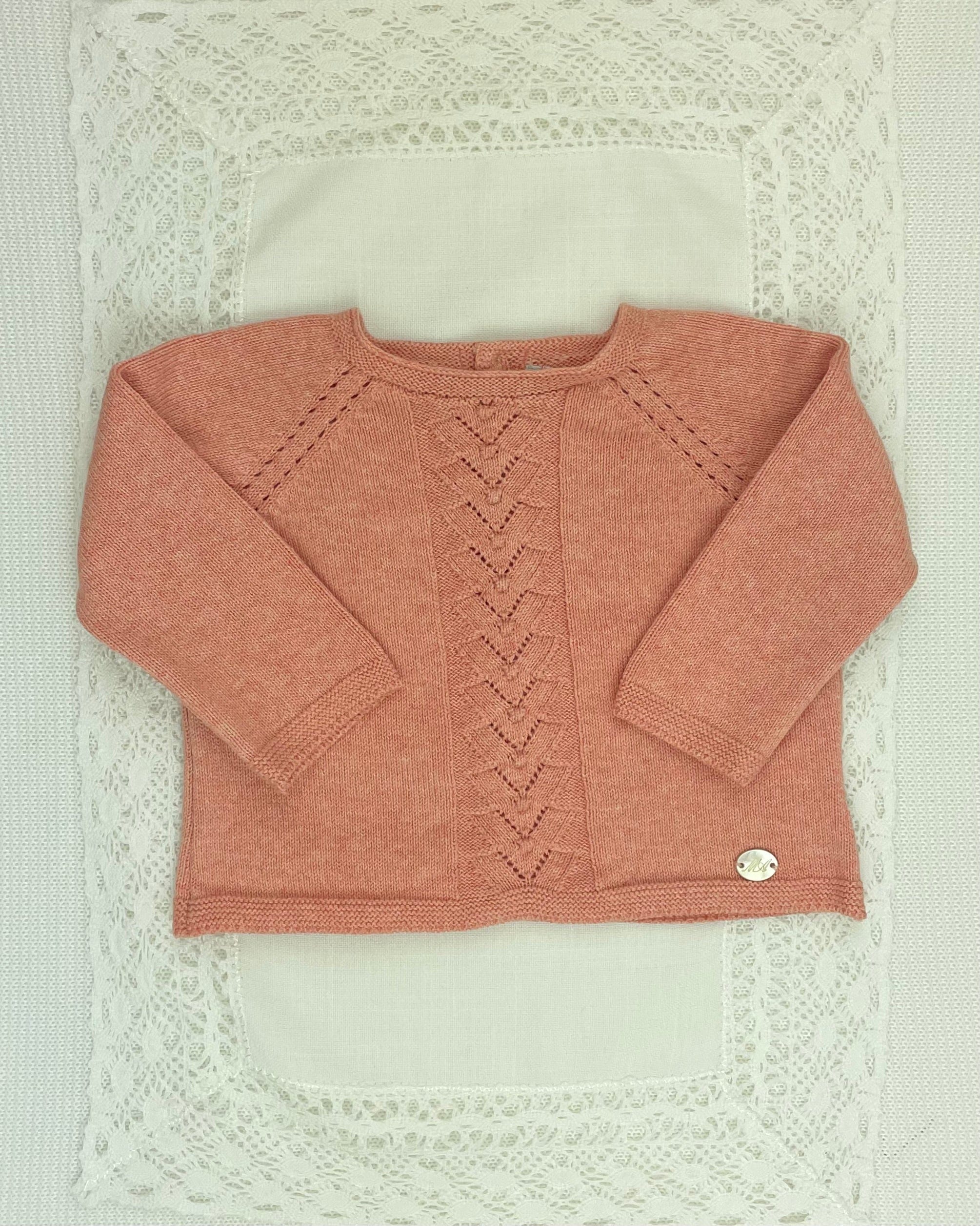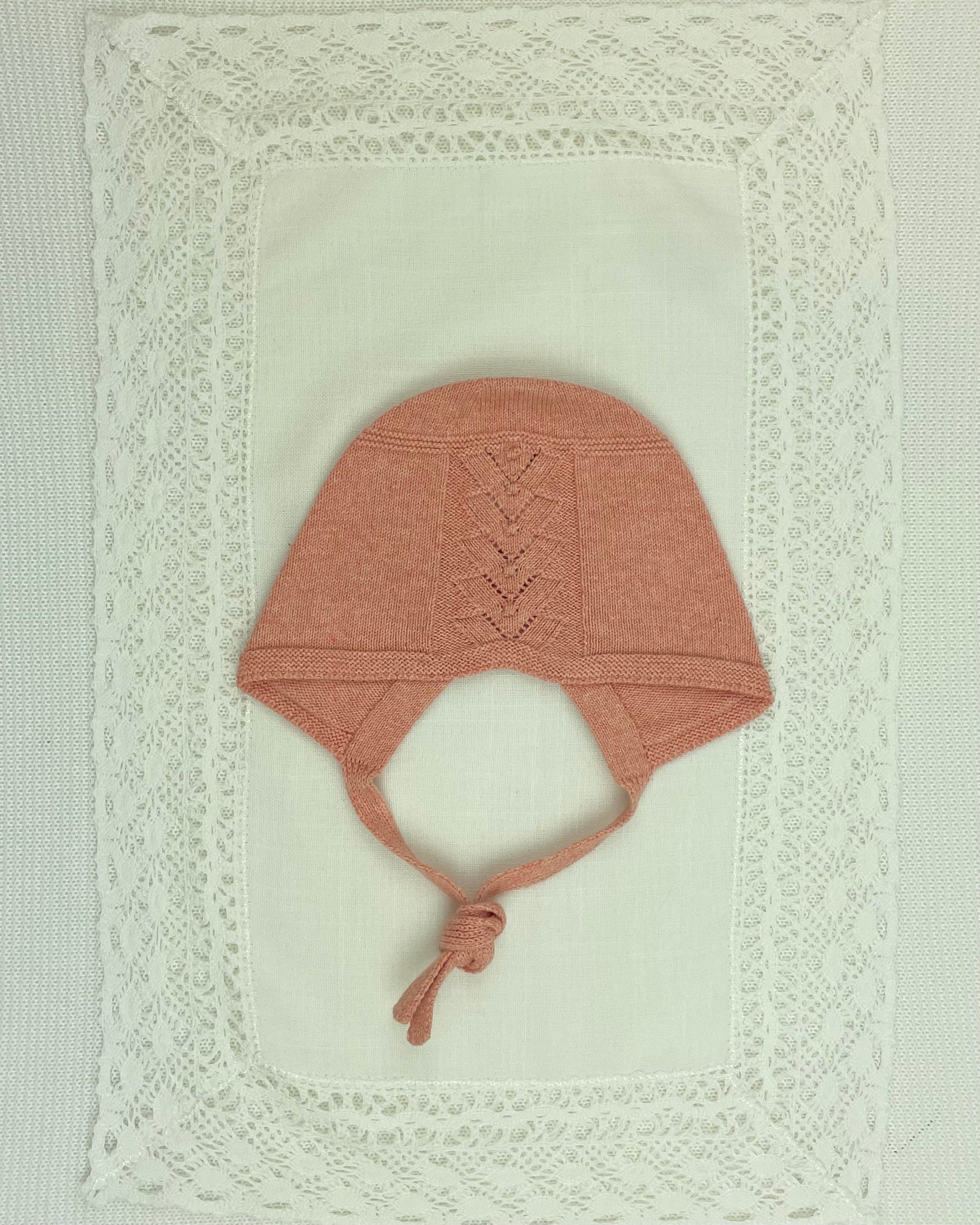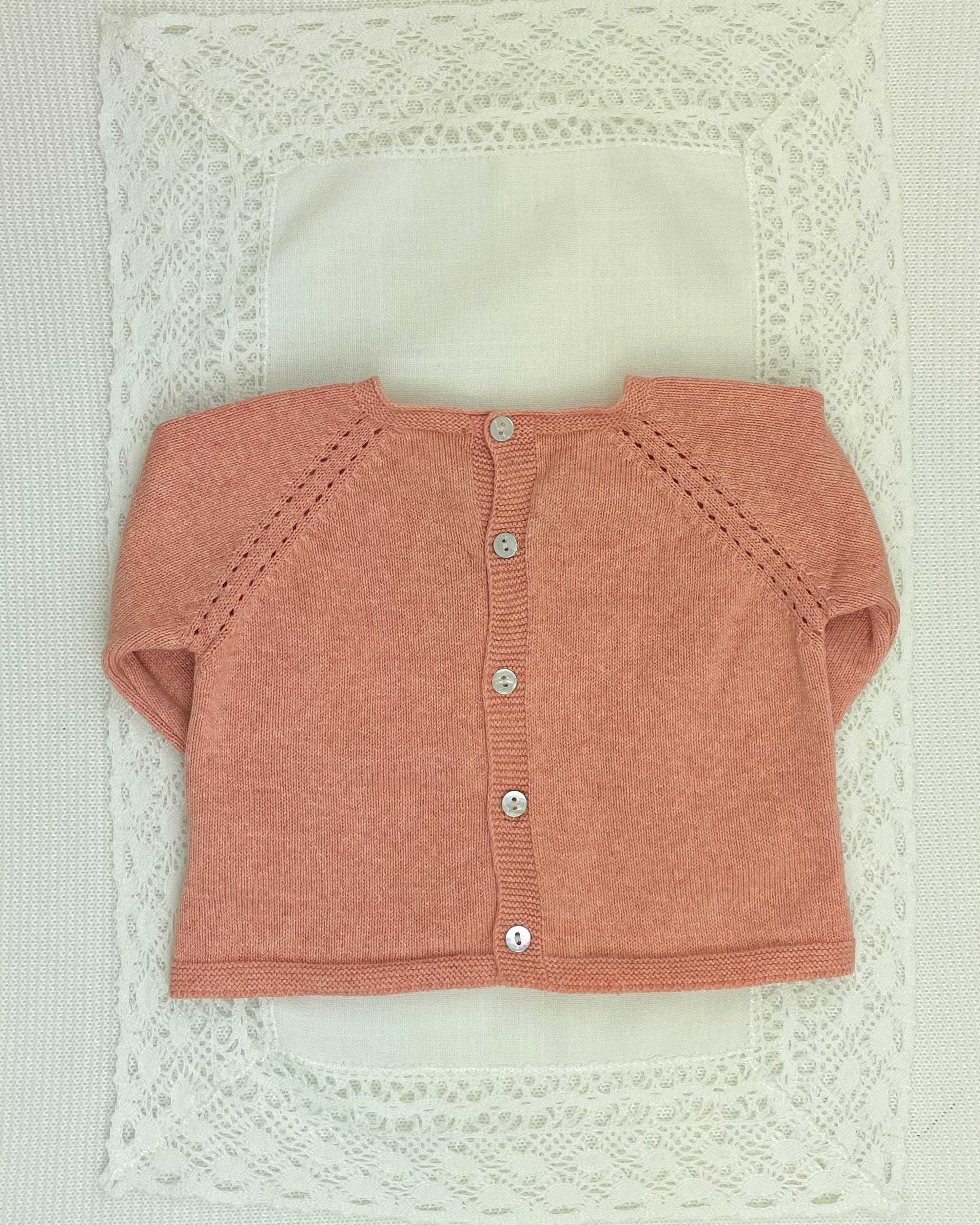 Fresh and feminine, this guava-colored knitted outfit is a lovely blend of modern color and timeless tradition, designed to welcome your baby girl with grace and style.