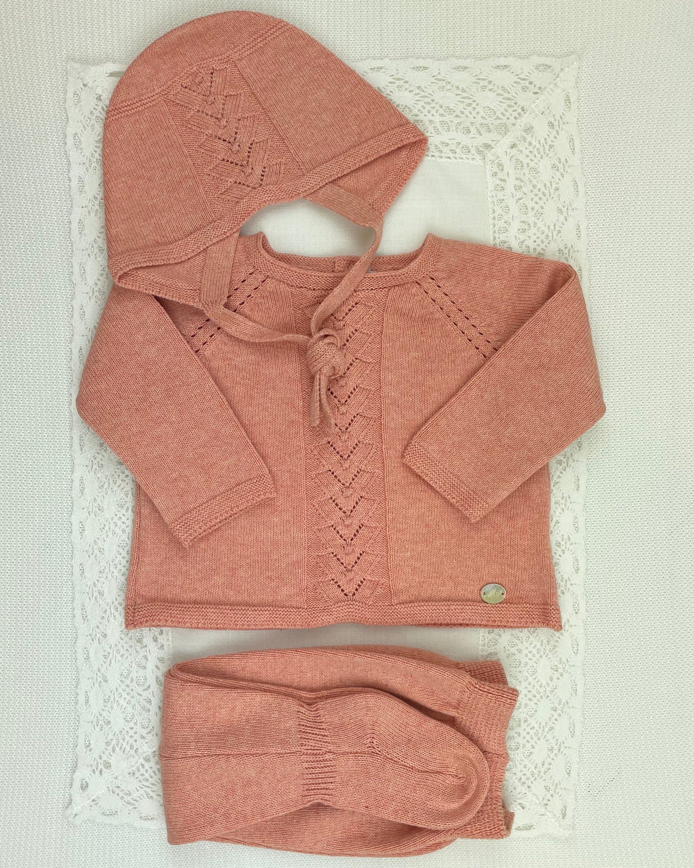 Handcrafted in Spain with exceptional attention to detail, the set includes a knitted top in guava with back button closure, matching footed pants, and a coordinated bonnet—creating a charming and cohesive look for her first special moments.