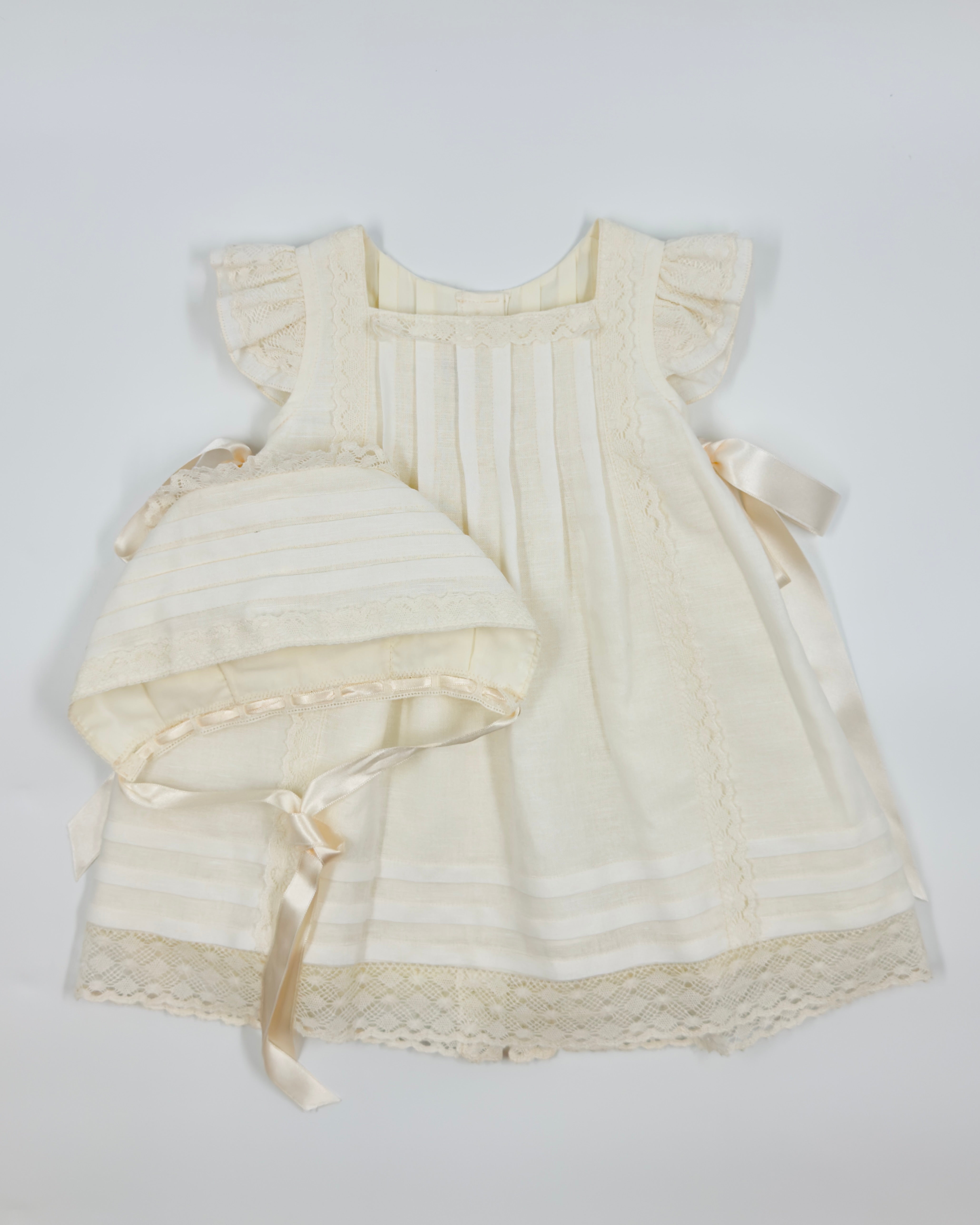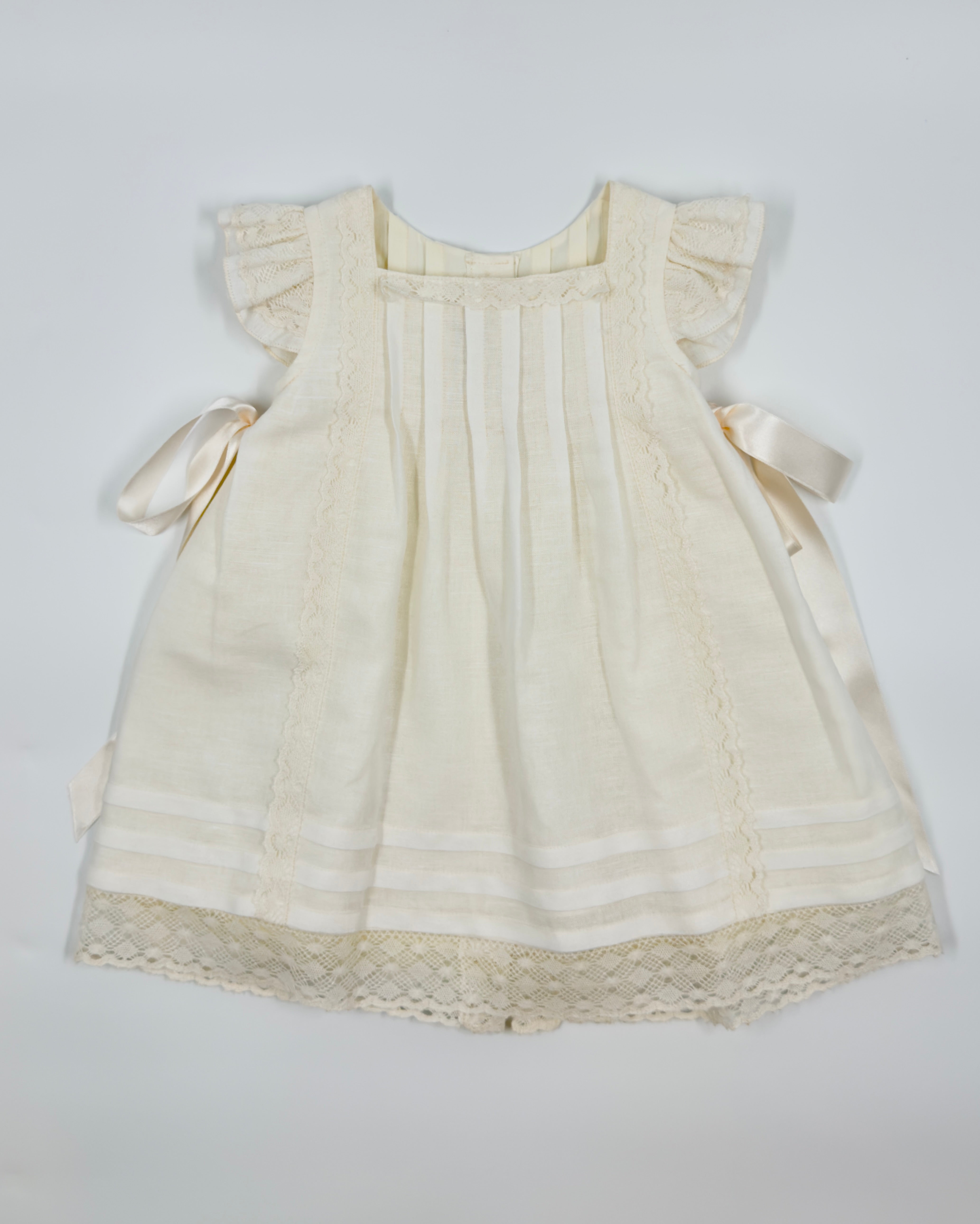 The Kate dress is a beautifully classic A-line design for baby girls, crafted from soft off-white linen. It features a square neckline, charming ribbon bows on each side, and comes with a matching bonnet for a timeless, picture-perfect look. Ideal for christenings, birthdays, and all your little one’s special occasions.