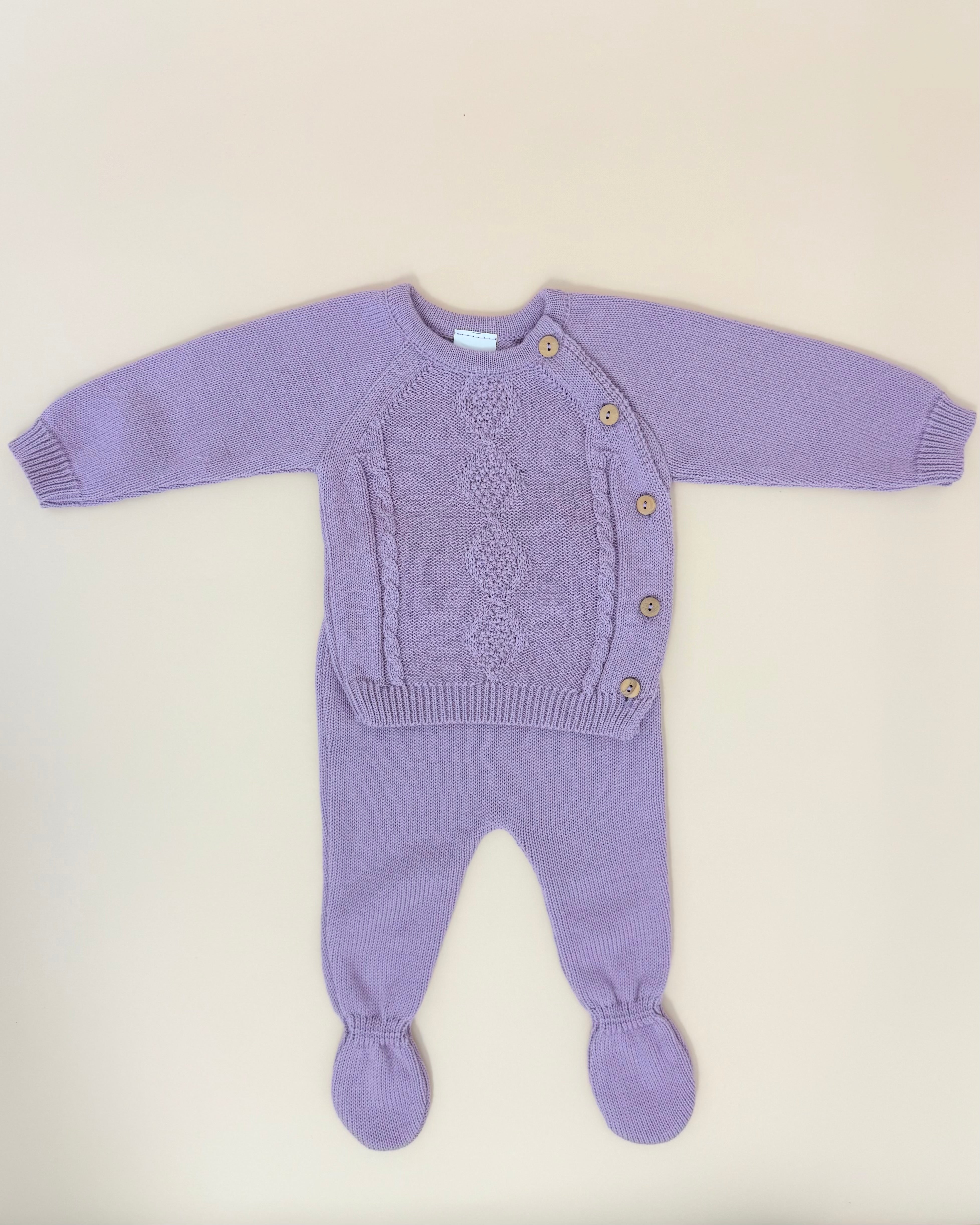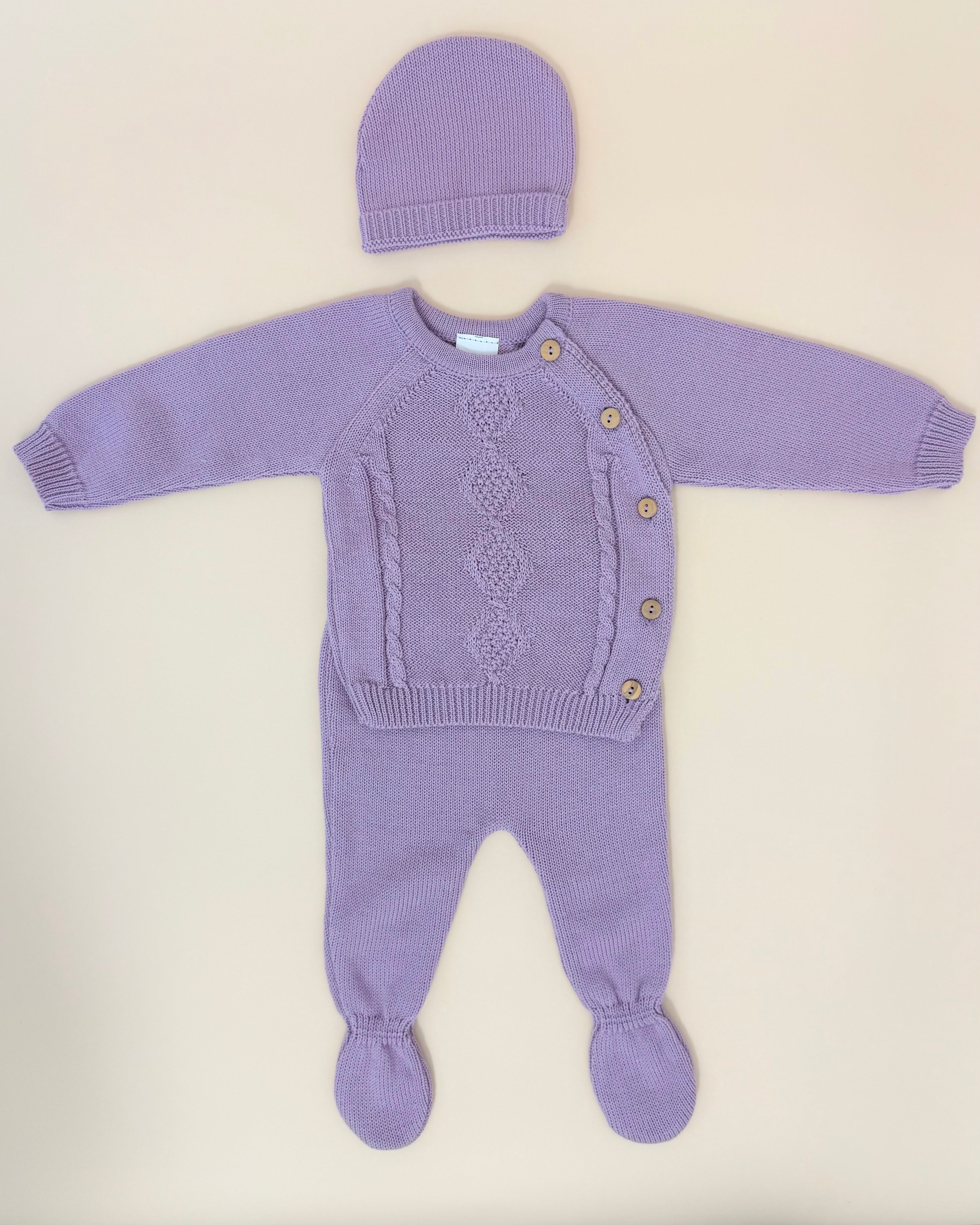 Soft, sweet, and delicately detailed, this three-piece set in a lovely lilac knit is designed especially for newborn baby girls. Made from 100% cotton, it’s gentle on delicate skin and ideal for keeping your little one cozy and comfortable.