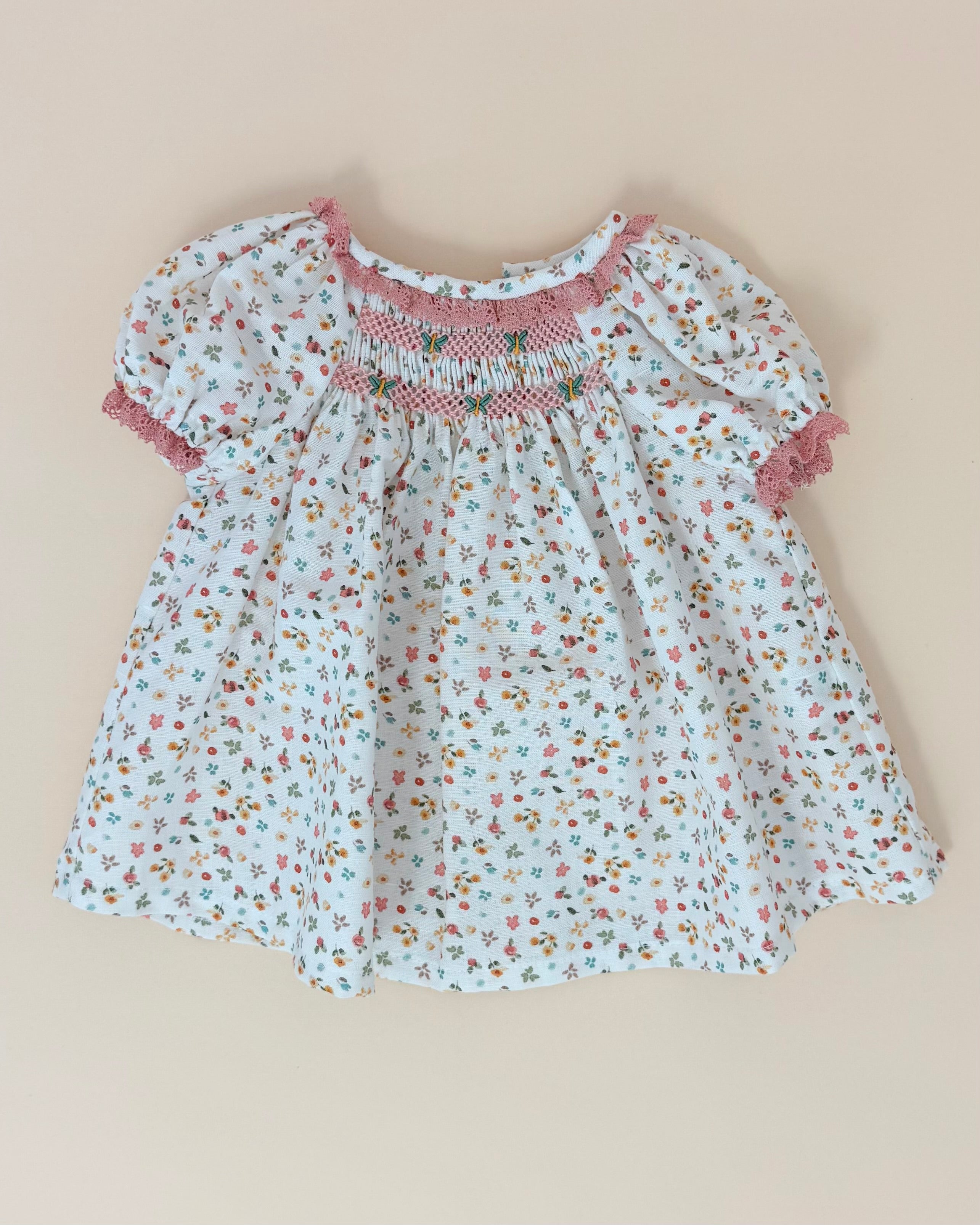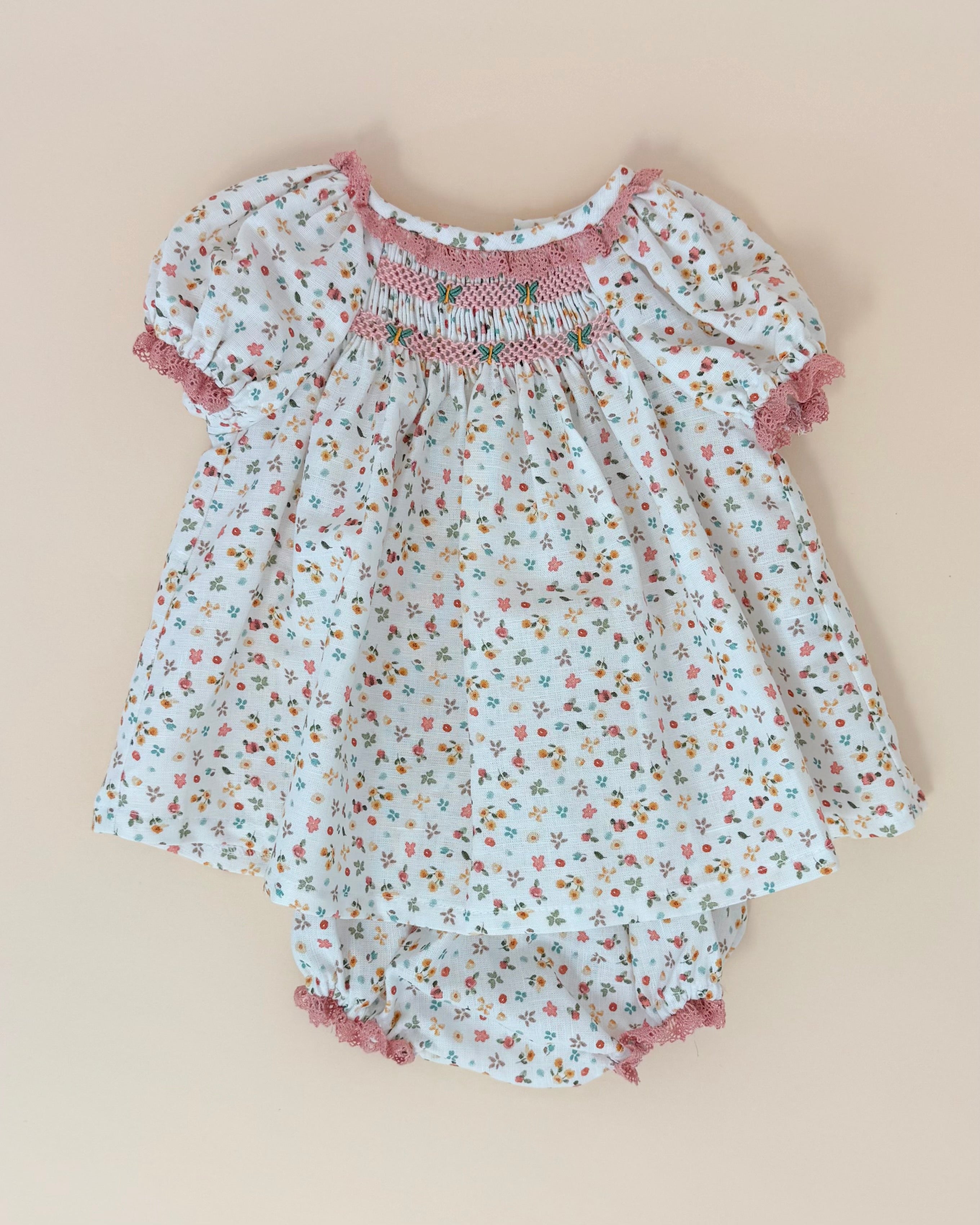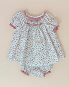 This exquisite baby dress with matching bloomers is crafted from lightweight linen adorned with a soft floral pattern. The dress features a delicate smocked design on the chest, adding a timeless and charming touch. Made in Spain with attention to detail and quality, it’s a sweet and elegant choice for warm-weather occasions or everyday grace.