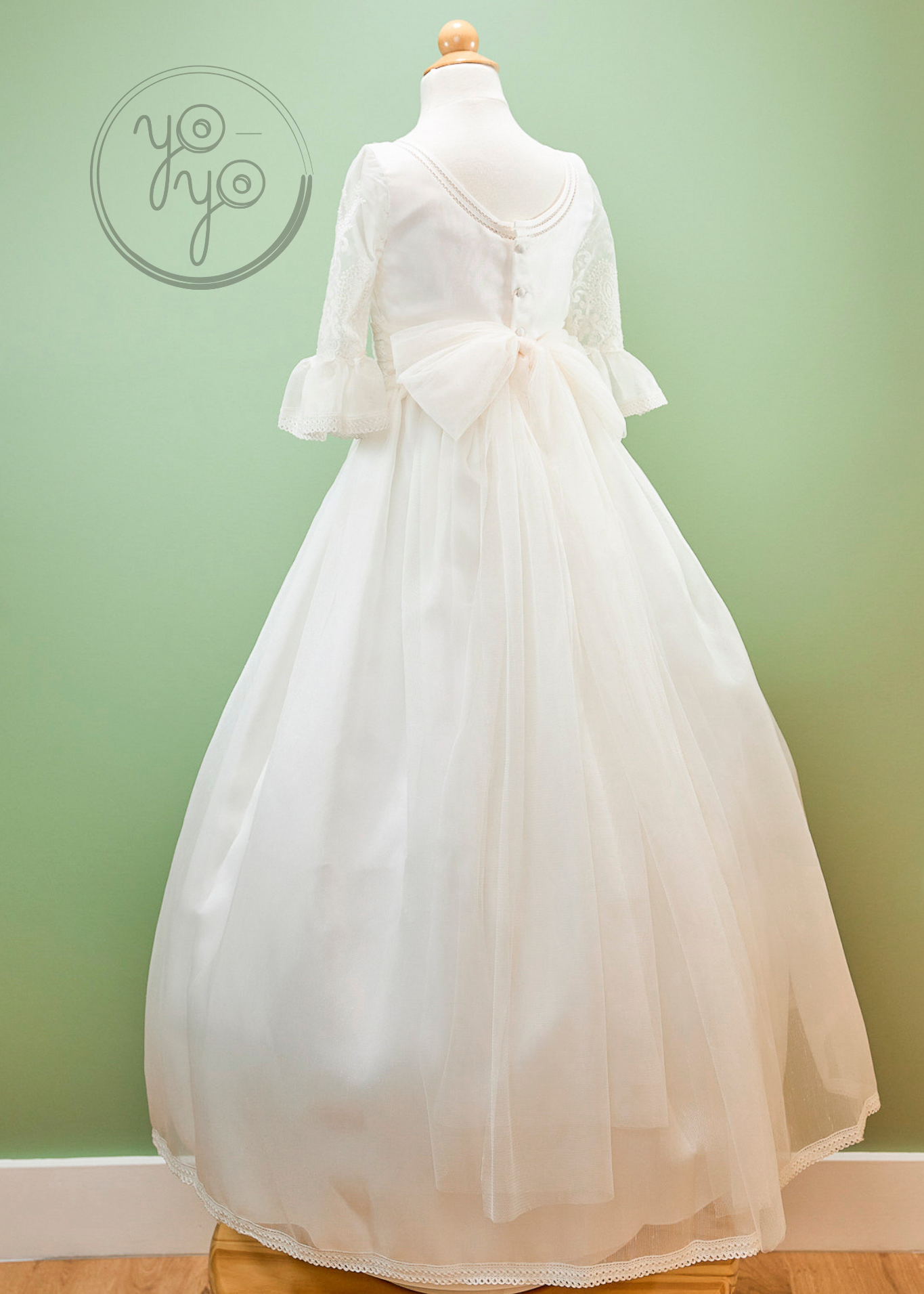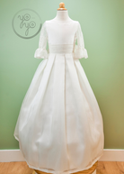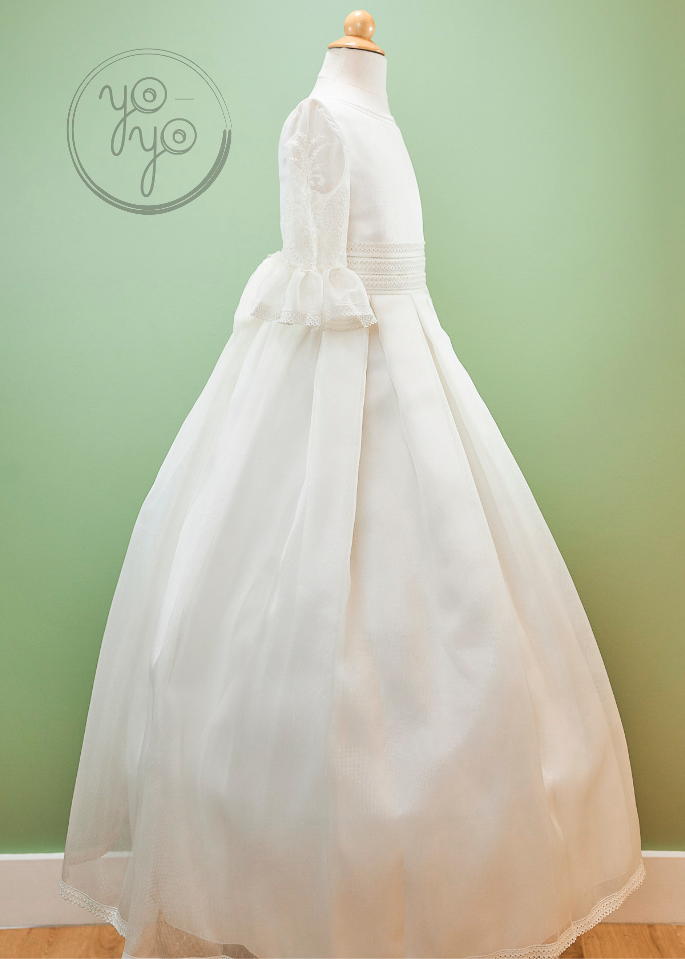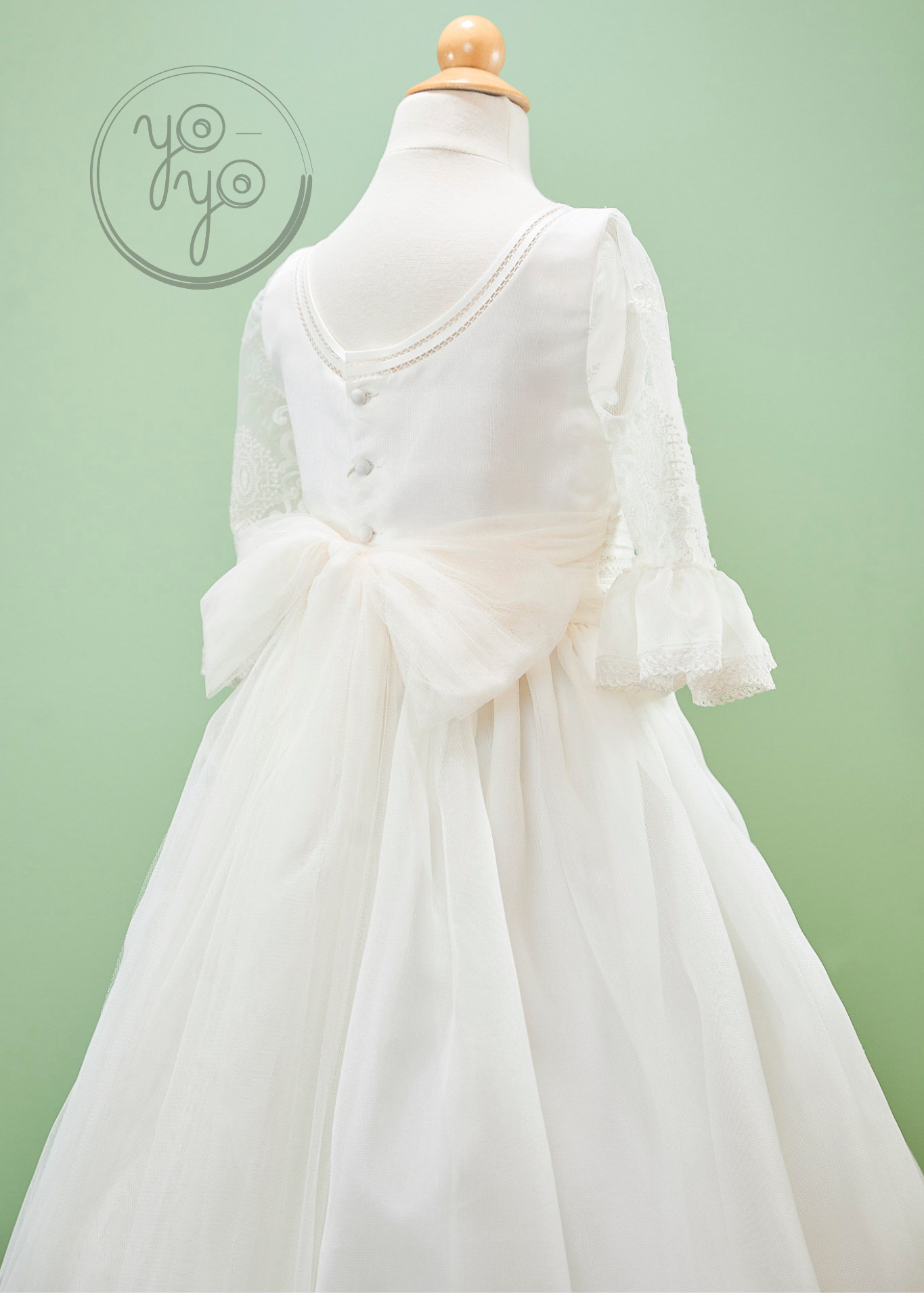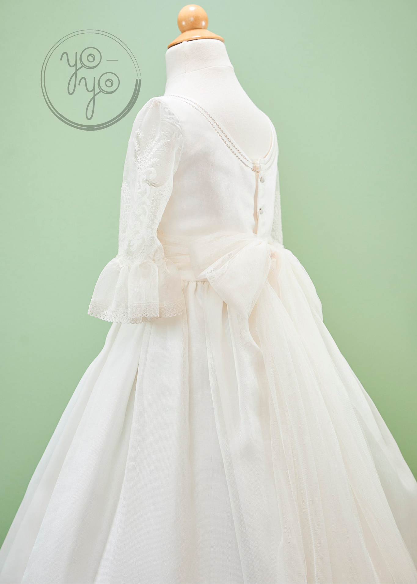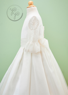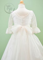 The Magnolia First Communion Dress blends rustic charm with timeless elegance. Crafted in soft off-white rustic gauze, this gown is lightweight, breathable, and perfect for warm-weather celebrations.