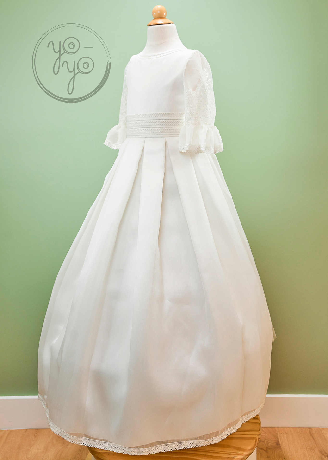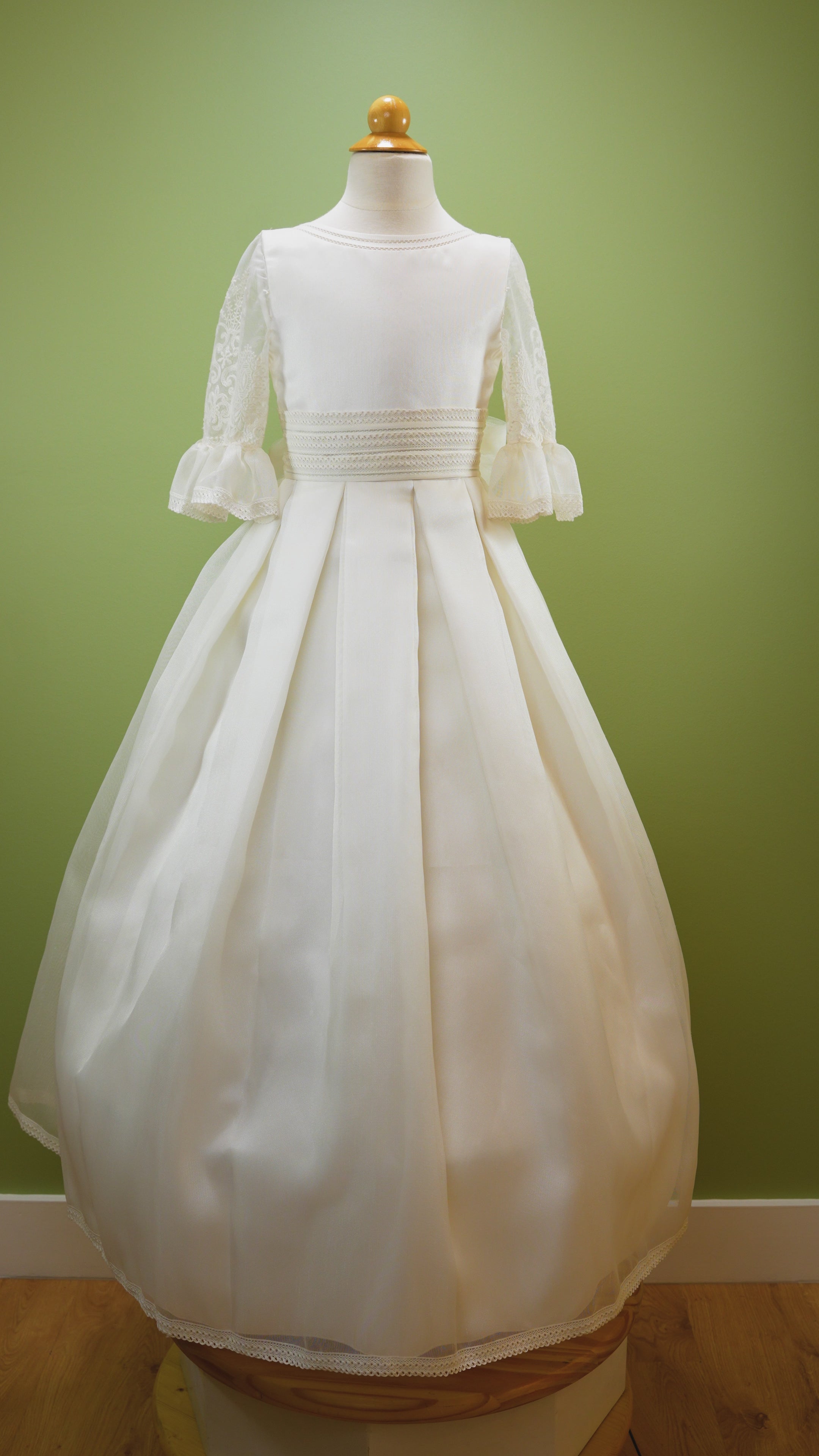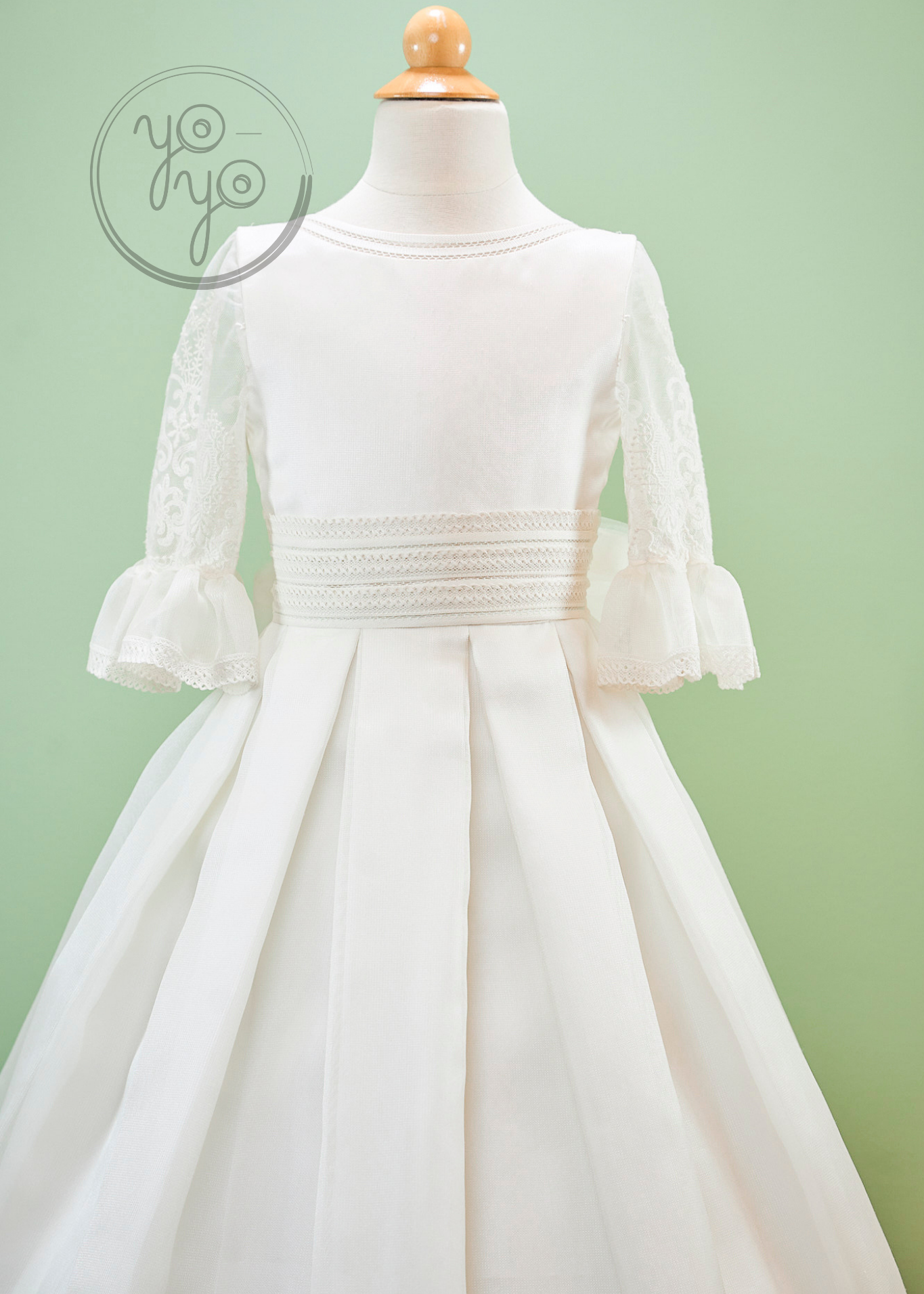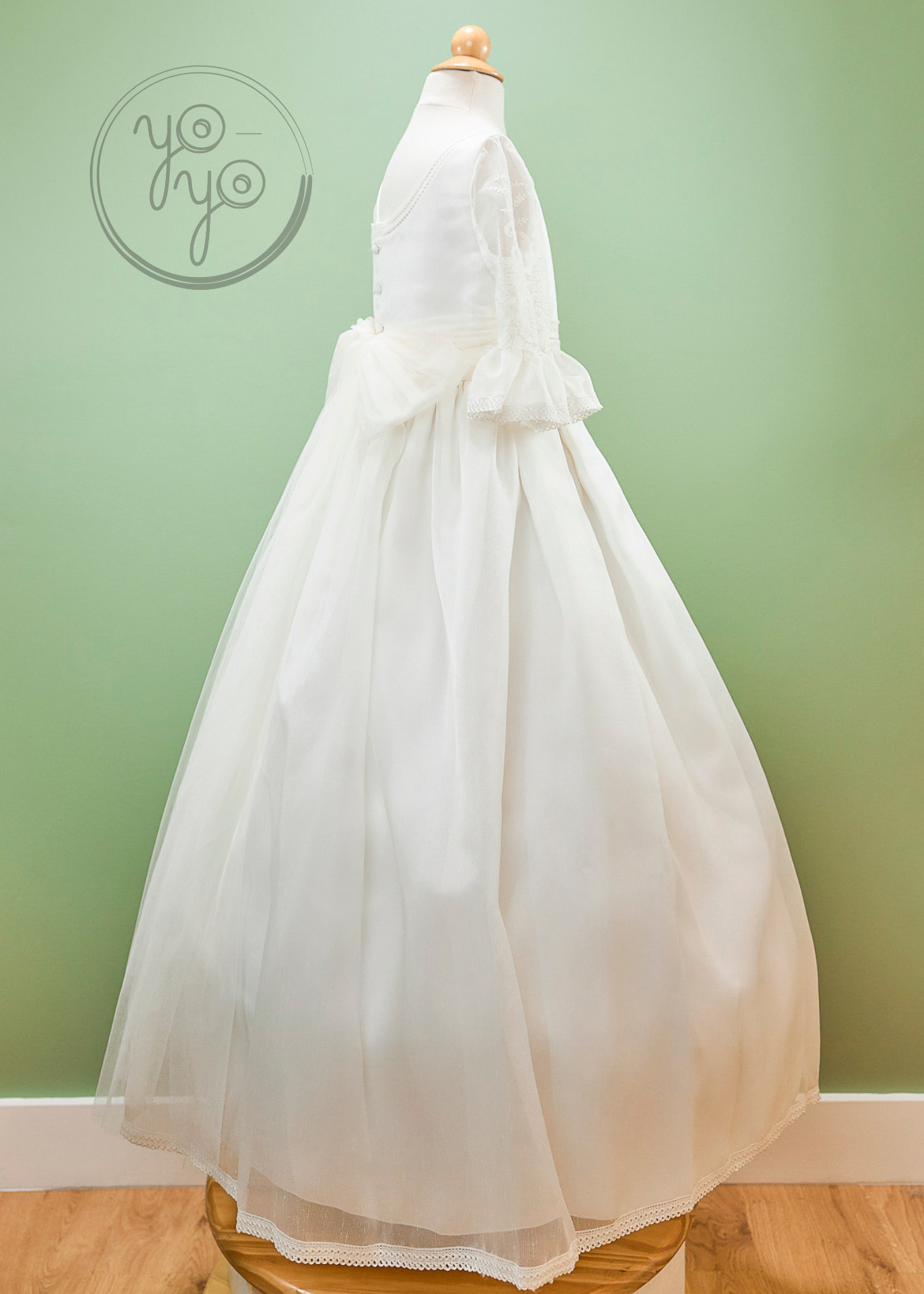 The Magnolia First Communion Dress blends rustic charm with timeless elegance. Crafted in soft off-white rustic gauze, this gown is lightweight, breathable, and perfect for warm-weather celebrations.